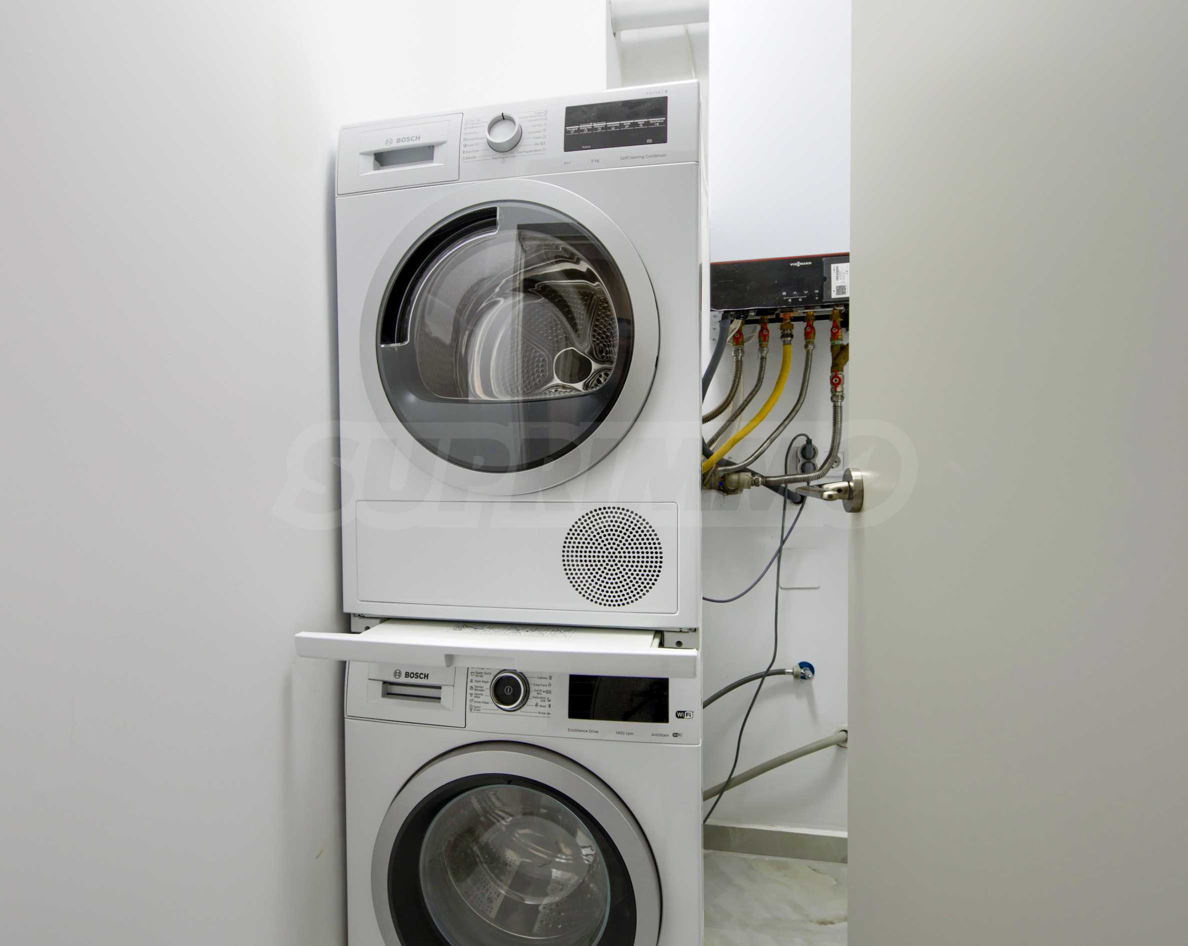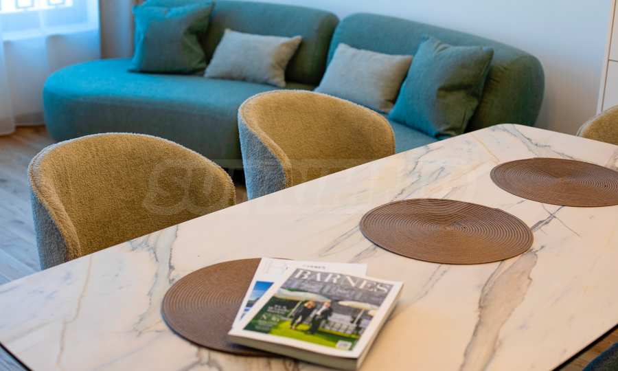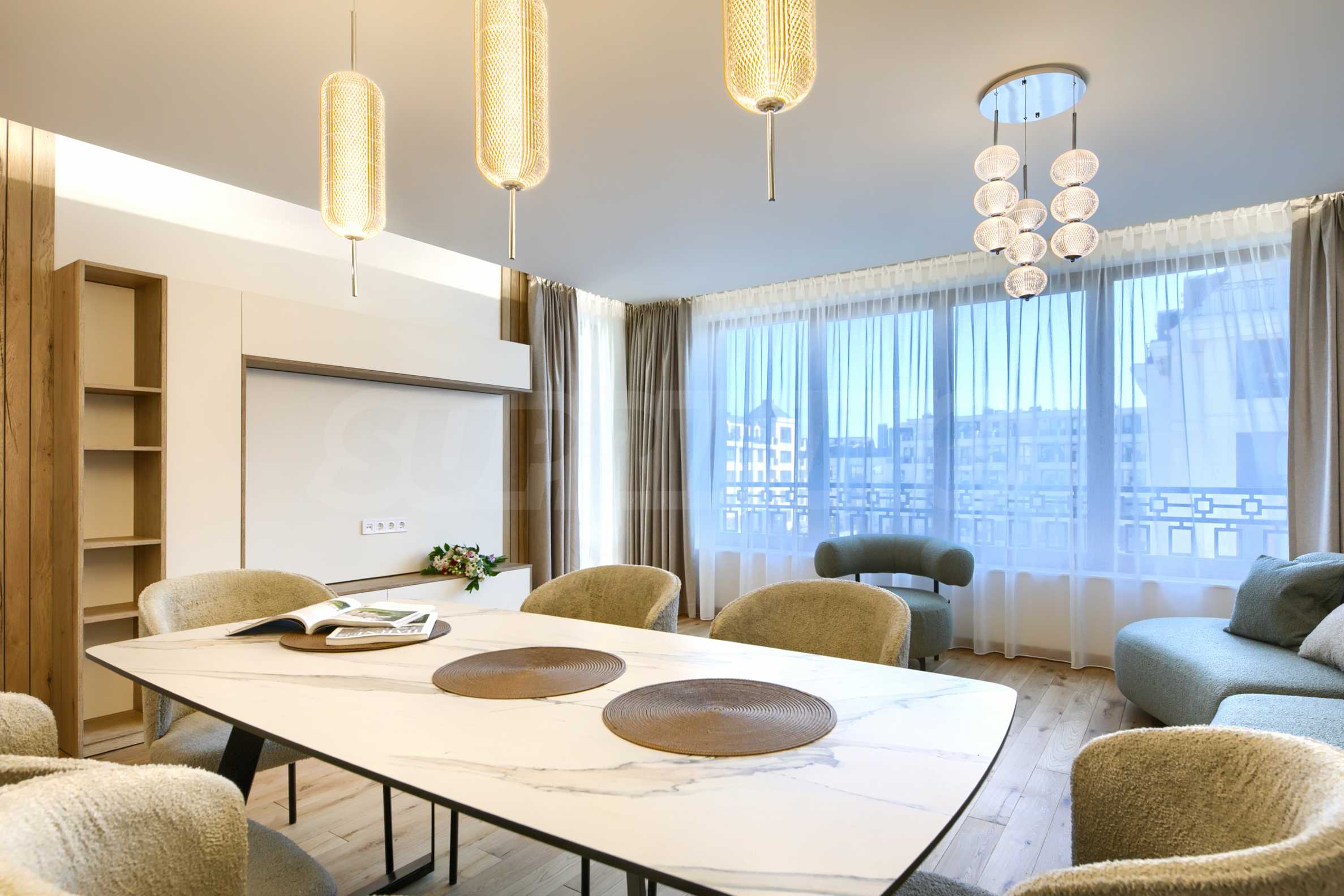 Квартира полностью меблирована высококачественной бытовой техникой и меблировкую. Пол в гостиной и спальнях выполнен из многослойного натурального дубового паркета. Легкие шторы оснащены моторизованными карнизами с дистанционным управлением, а также могут управляться вручную.