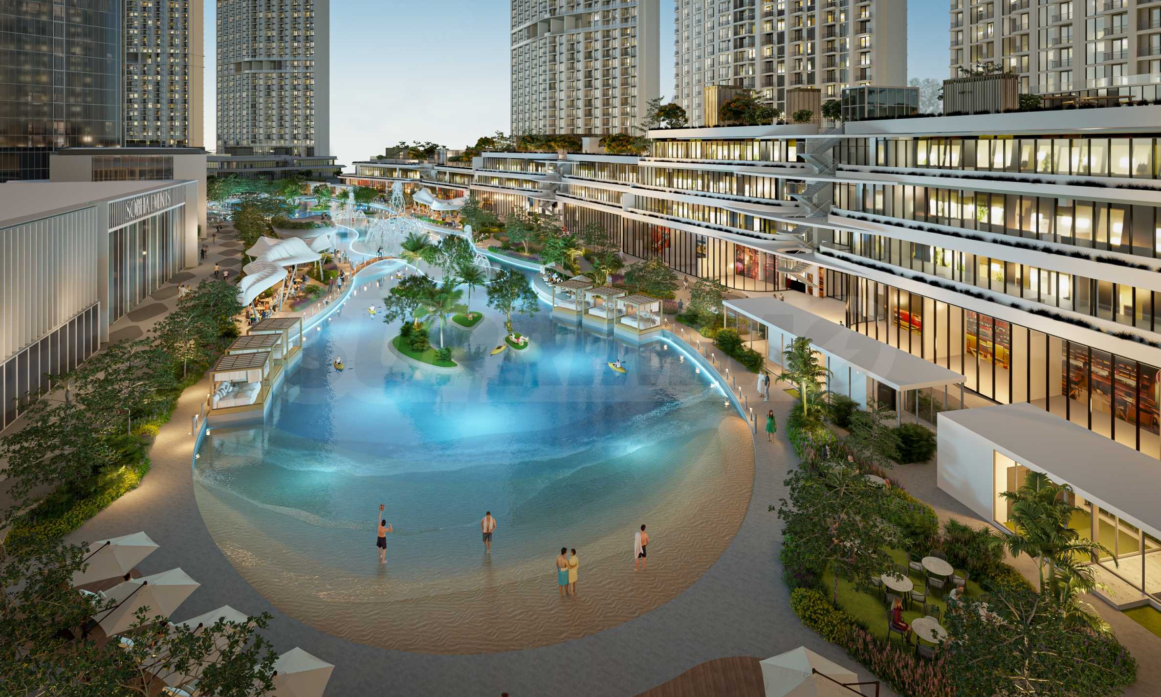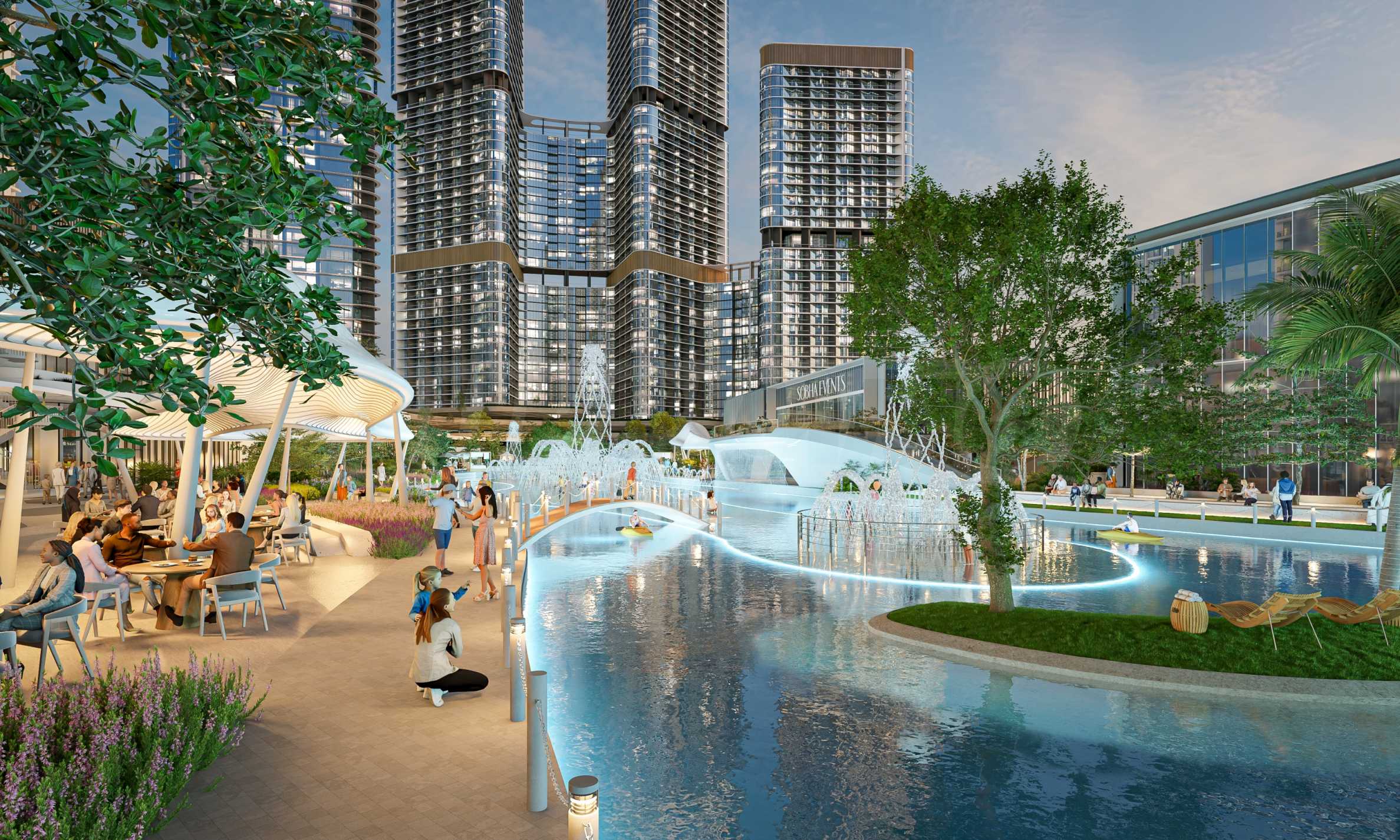 Потрясающий бассейн в форме амфитеатра, расположенный в самом центре проекта и окруженный изысканными ресторанами, создает потрясающую среду, которая элегантно адаптируется к меняющемуся уровню воды. Это пространство — не просто визуальное наслаждение, но и социальный центр, где жители могут собираться, общаться и создавать незабываемые воспоминания. Пышные ландшафты поселка, голубые лагуны и обсаженные деревьями тропы создают идиллическую обстановку, вдали от шума и суеты городской жизни.