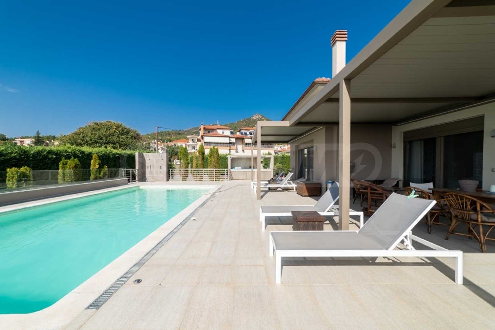 На этом уровне находится открытый бассейн, барбекю и терраса, с которой открывается панорамный вид на гору Пангаио и природный ландшафт местности.