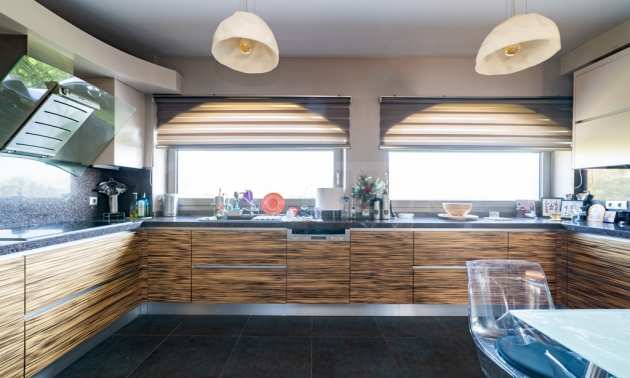 - красивая и большая кухня с крытой верандой, которая выполняет функцию патио,