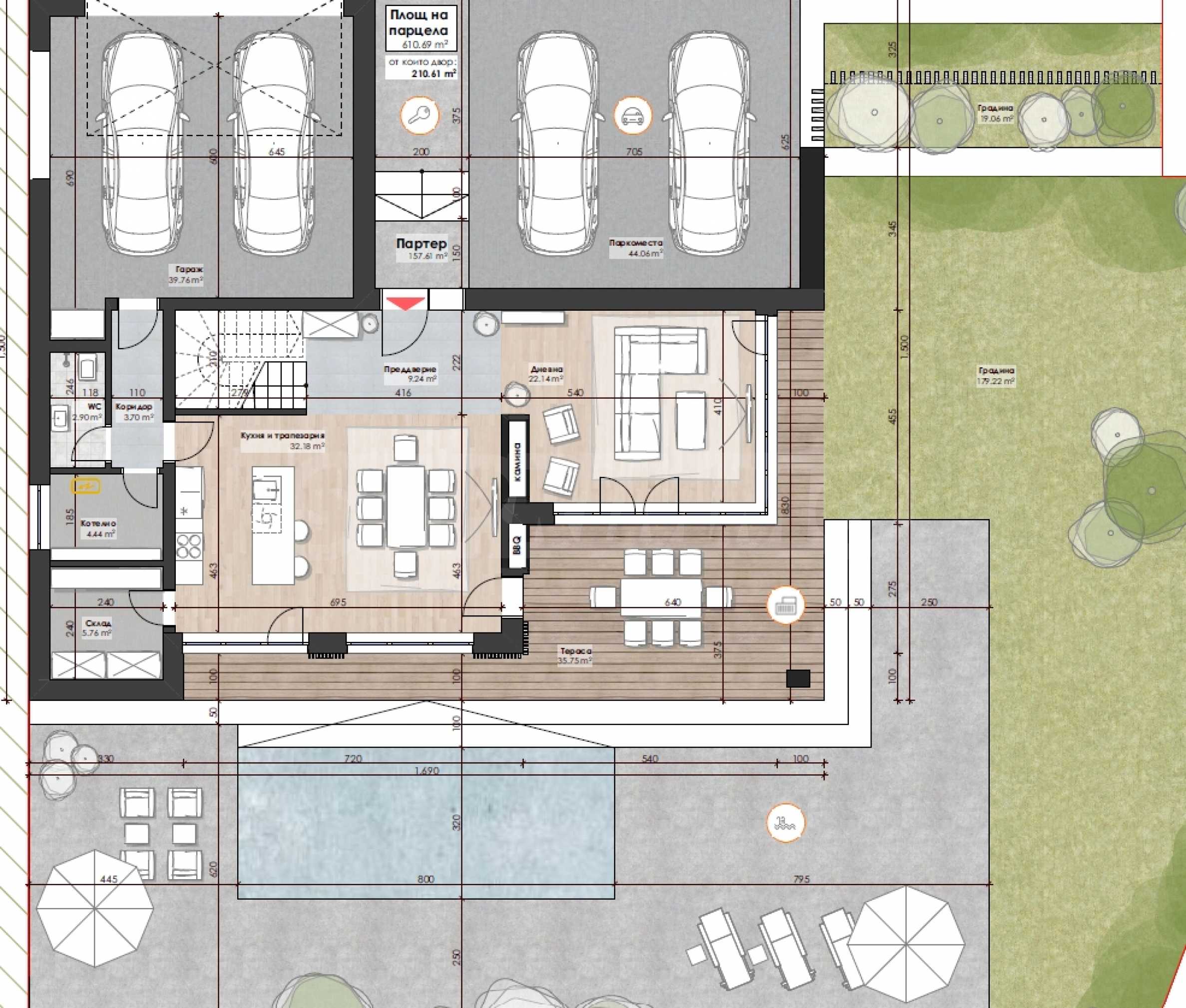 с террасами, парковочными местами, входом и зоной бассейна – 696,39 м2.