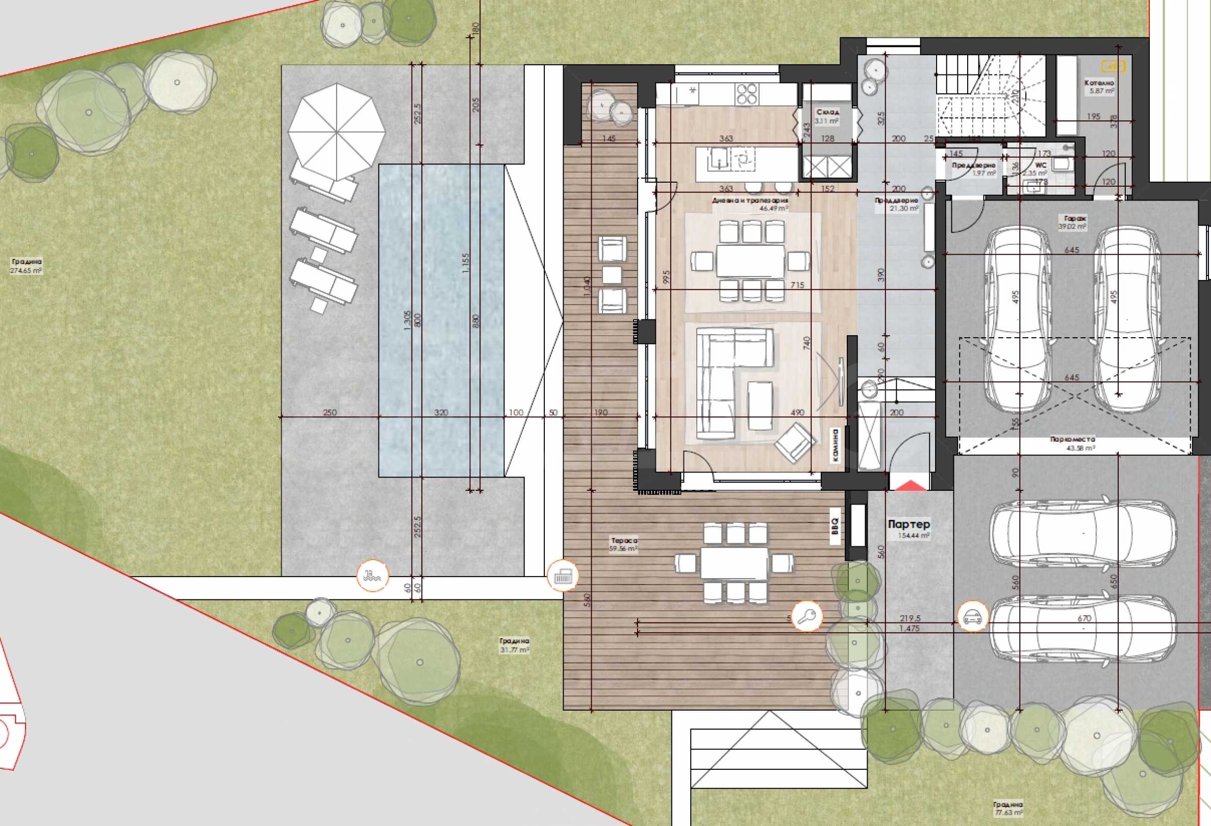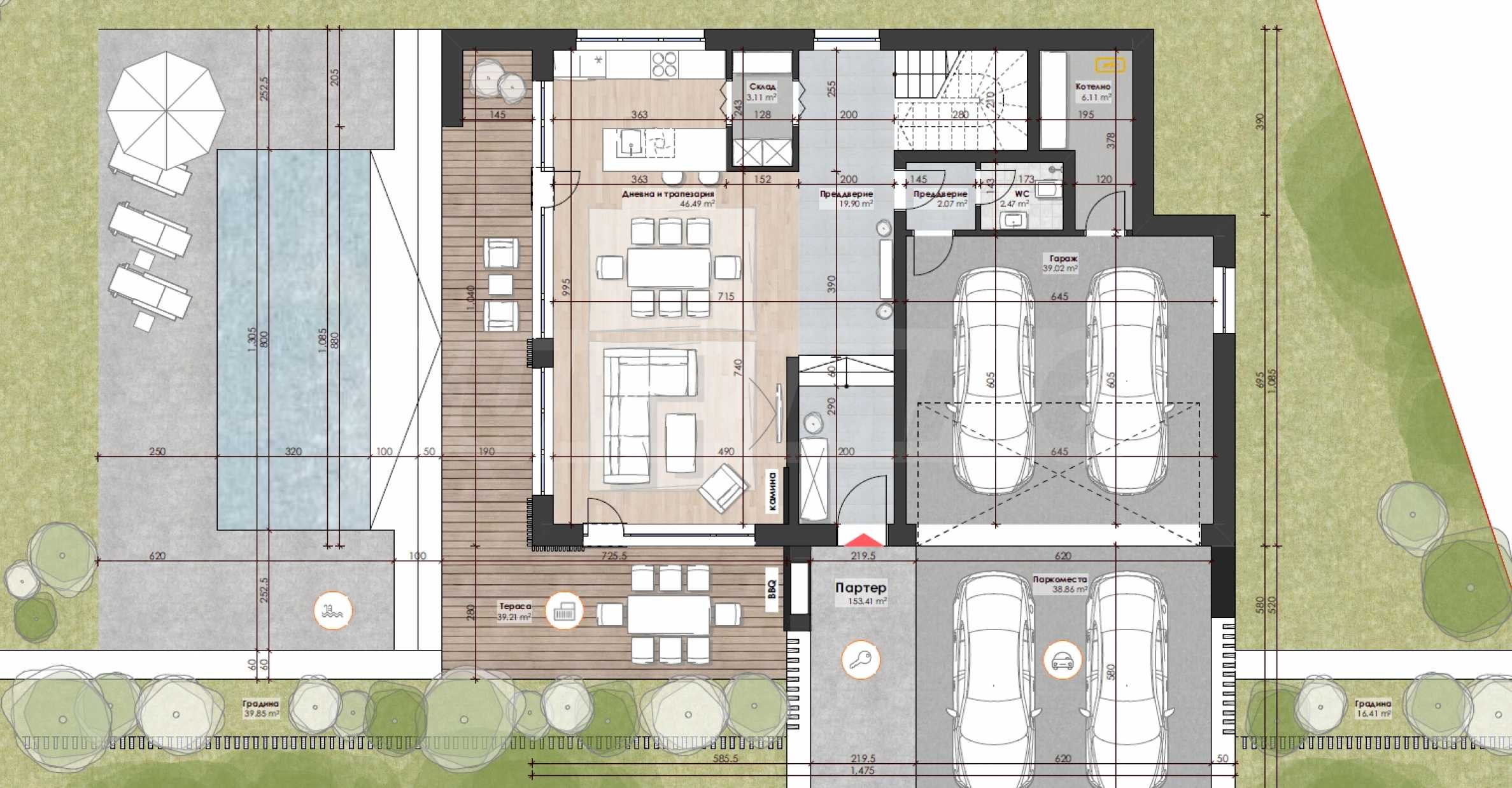 с террасами, парковочными местами, входом и зоной бассейна – 597,36 м2.