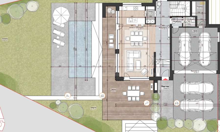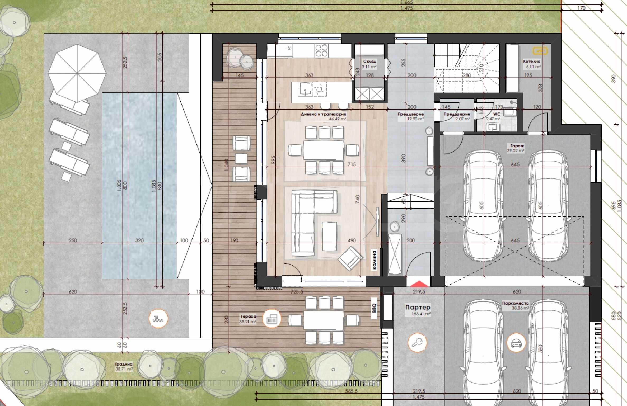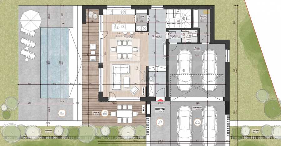 с террасами, парковочными местами, входом и бассейном - 546,23 м2.