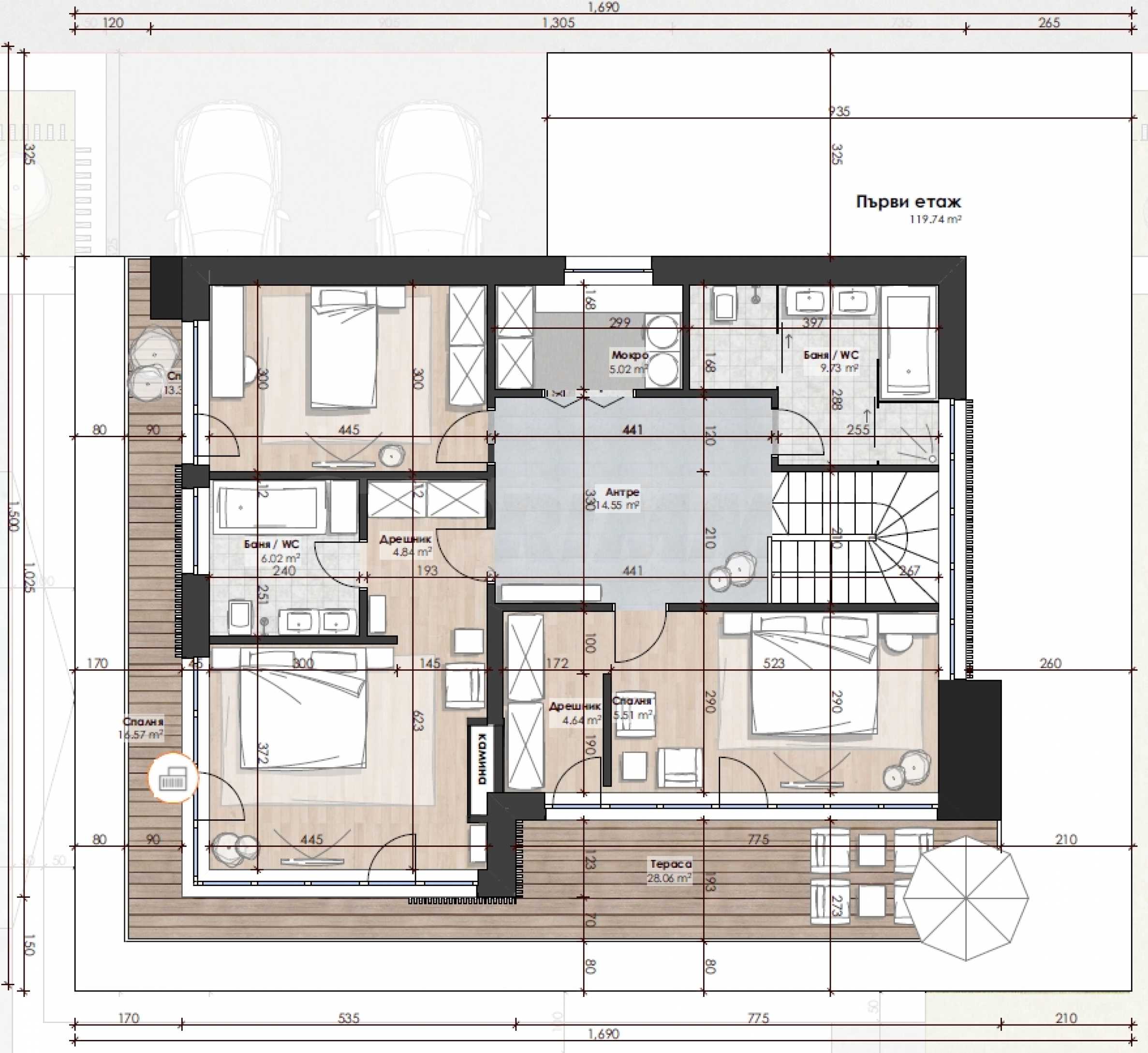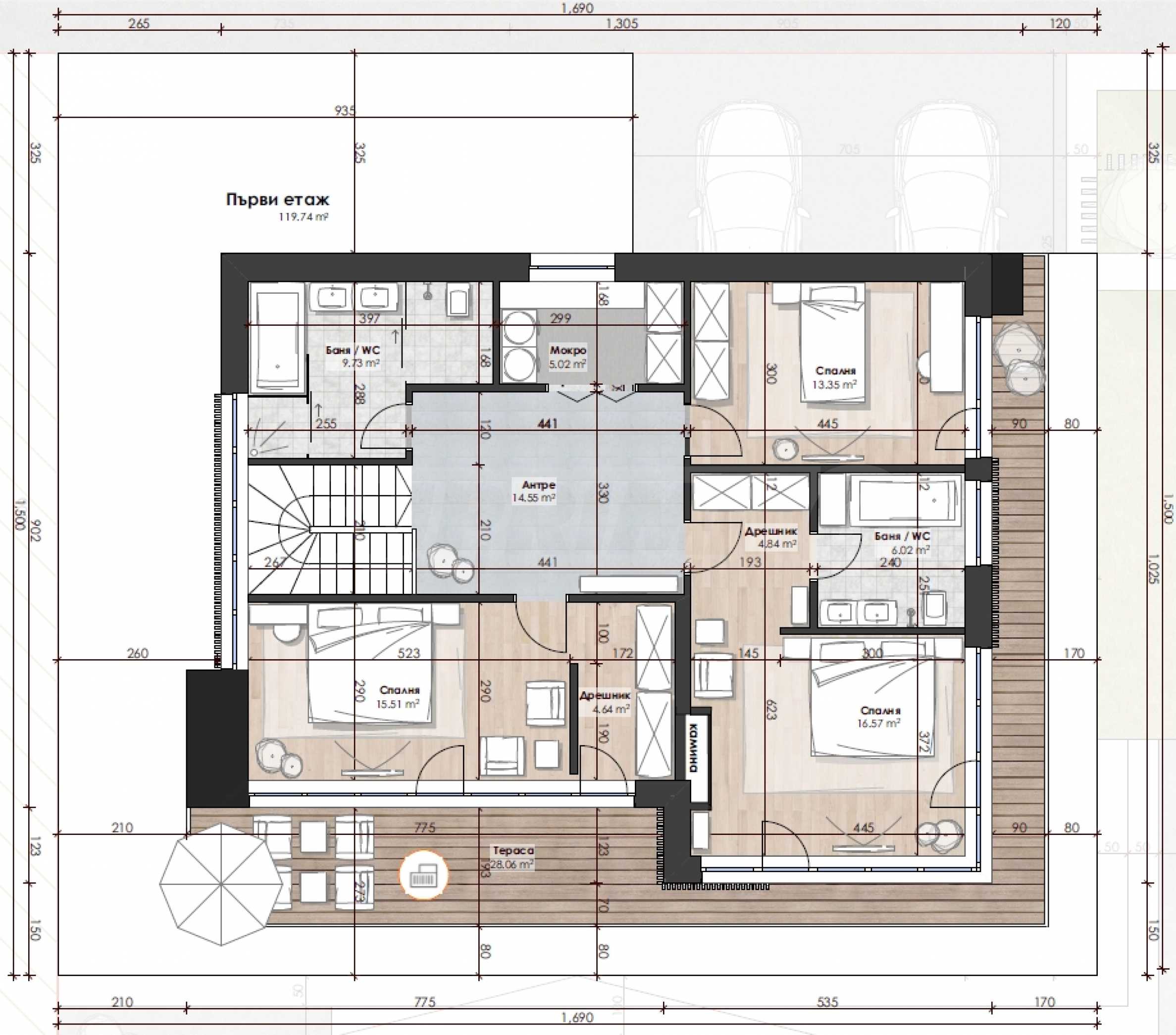 с террасами, парковочными местами и входом – 499,10 м2.;