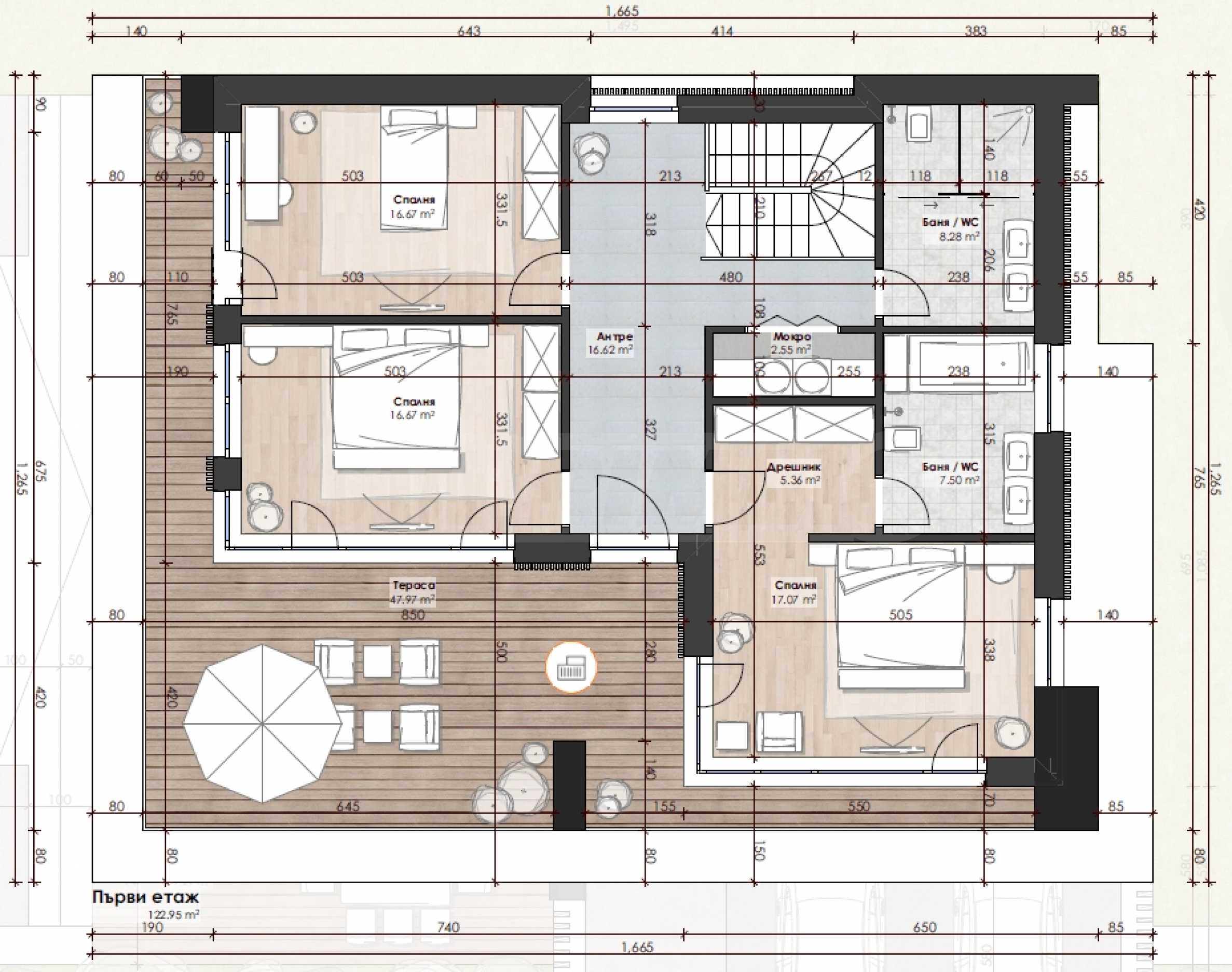 с террасами, парковочными местами и входом – 478,84 м2.;