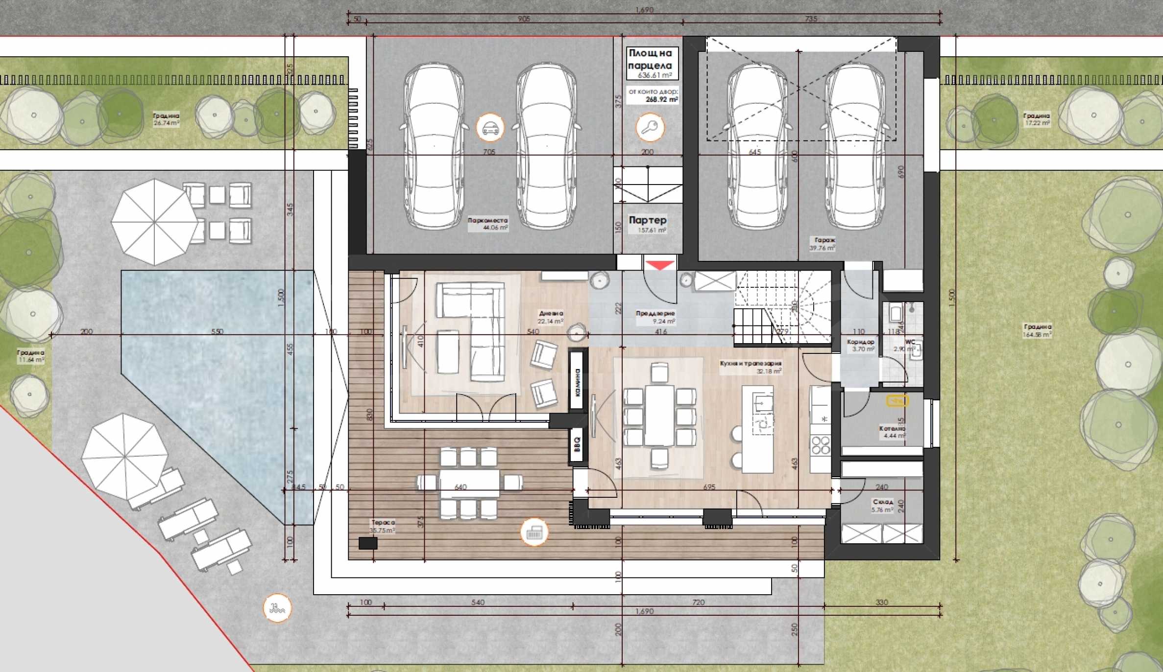 с террасами, парковочными местами, входом и зоной бассейна – 597,36 м2.