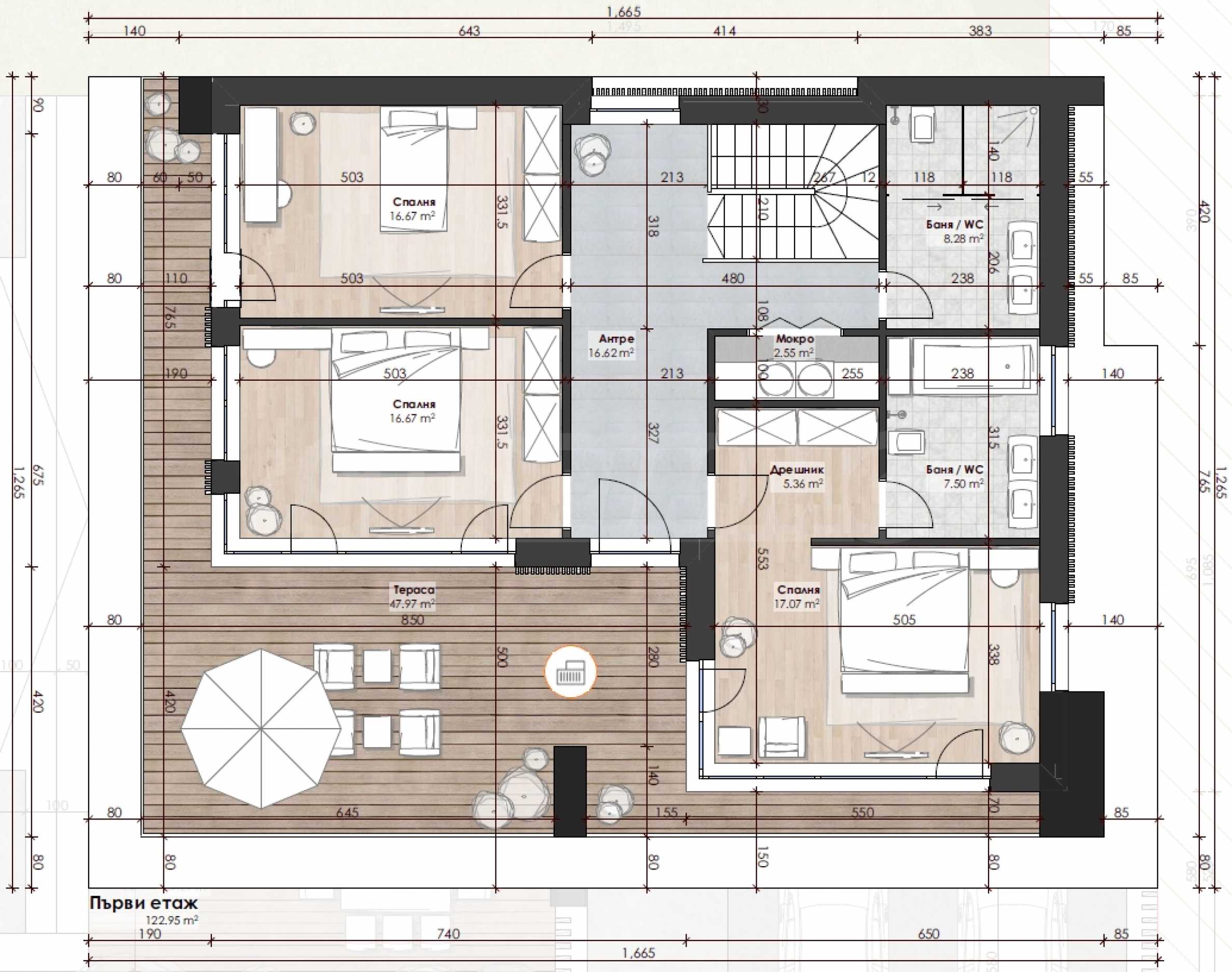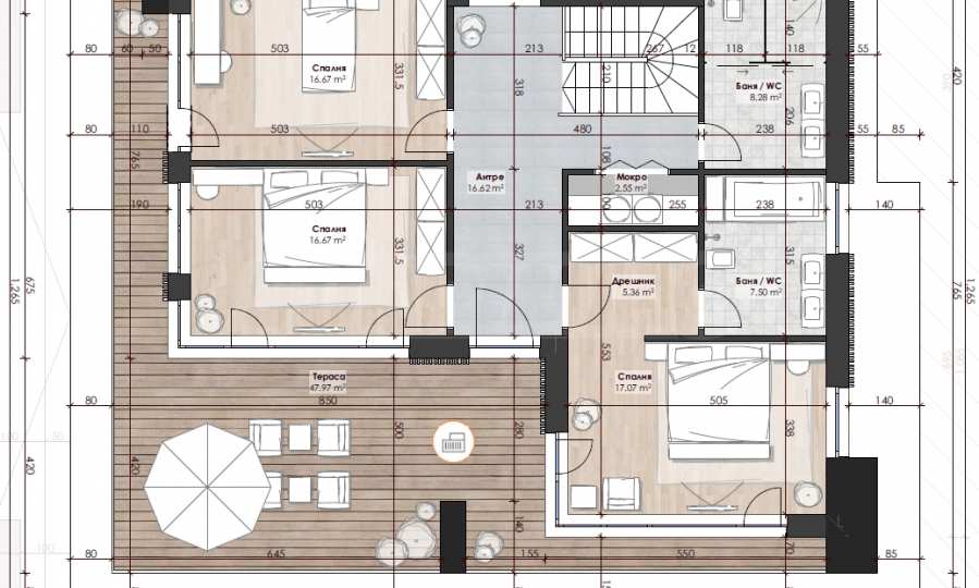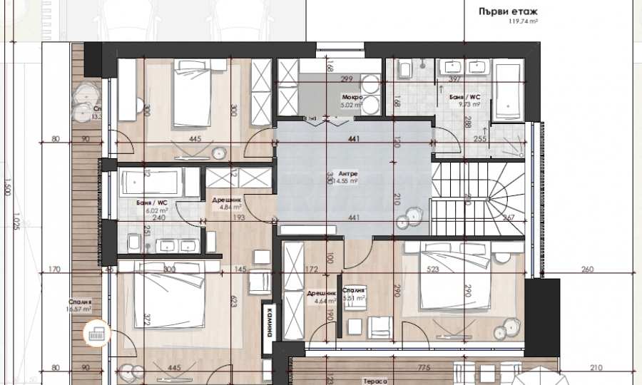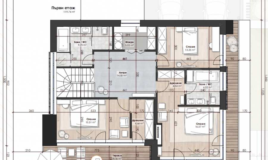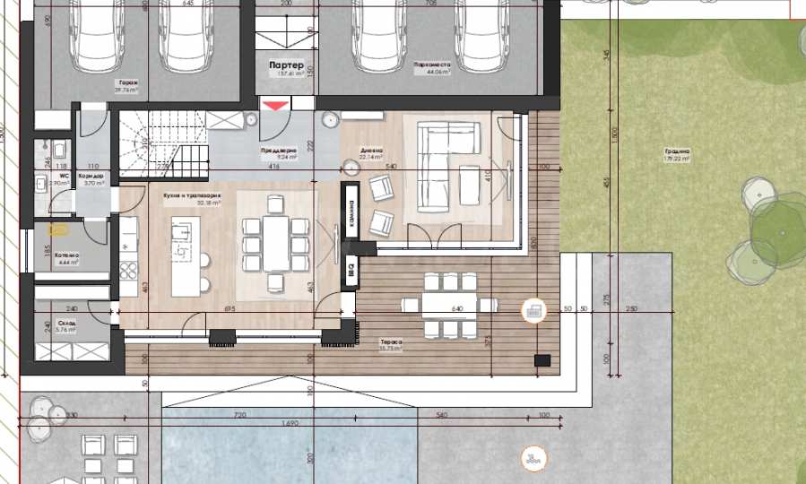 с террасами, парковочными местами и входом – 478,84 м2.;
