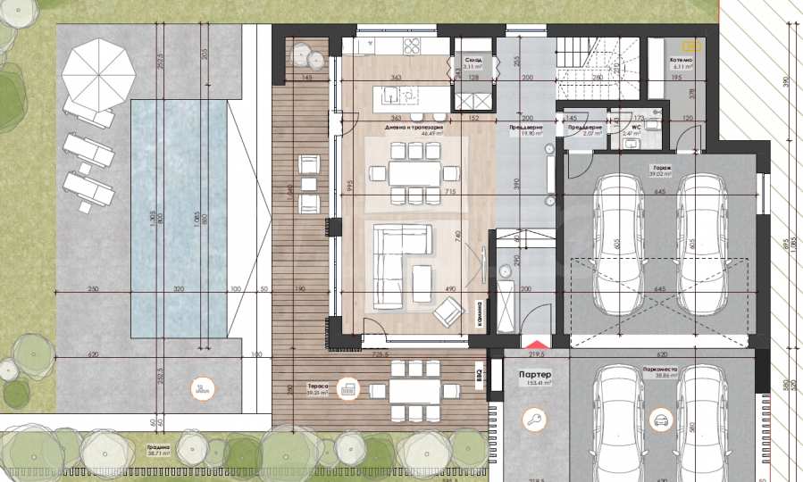 с террасами, парковочными местами, входом и бассейном - 546,23 м2.