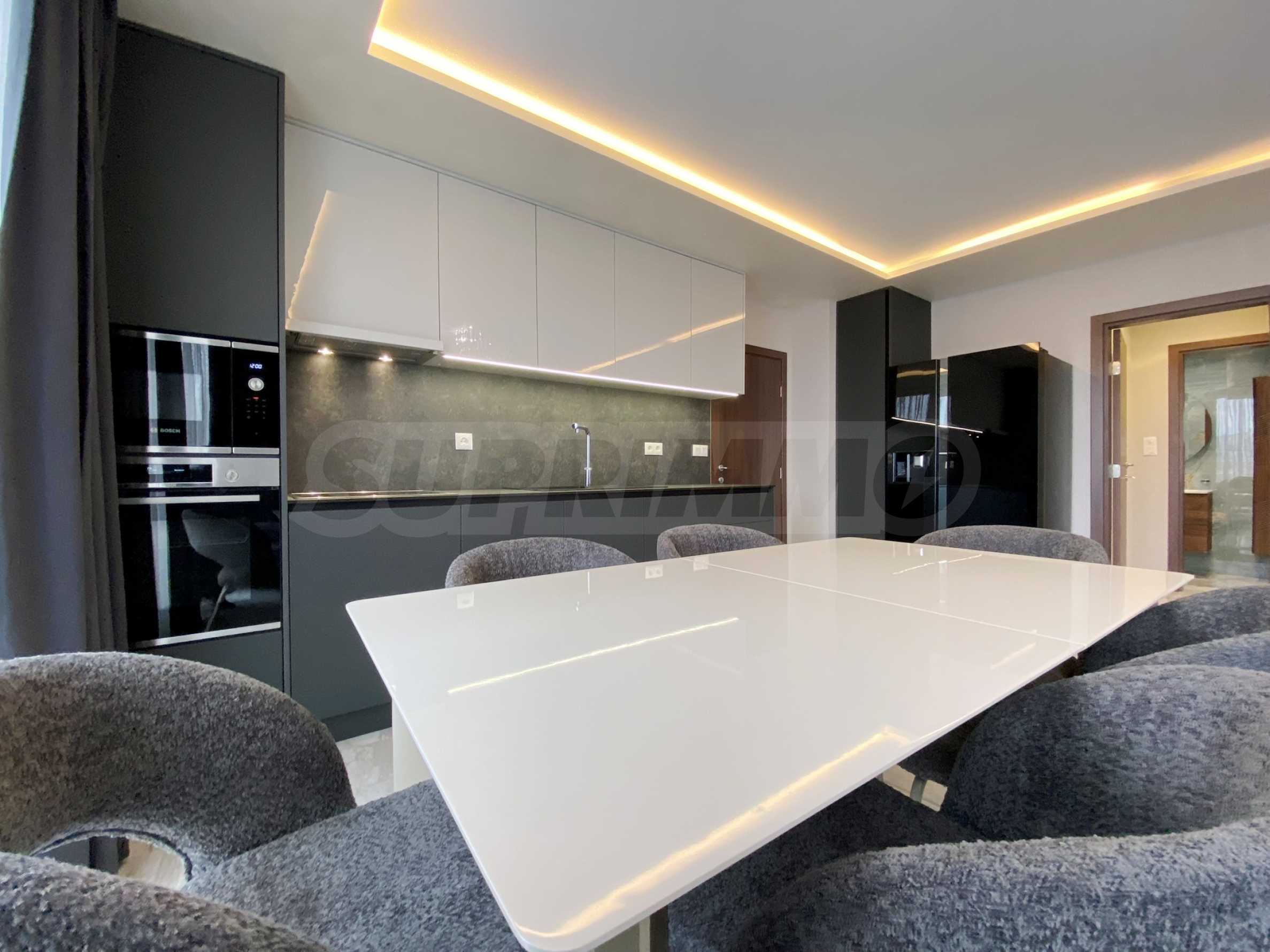 Квартира полностью меблирована и оборудована новой меблировкую и электроприборами высокого класса энергоэффективности, находящимися на гарантии: вытяжка, духовка, керамическая варочная панель, посудомоечная машина, двухкамерный холодильник с льдогенератором, смарт-телевизор. Отопление и кондиционирование воздуха обеспечивают инверторные кондиционеры DAIKIN в каждой комнате. Также имеется оптоволоконный интернет.