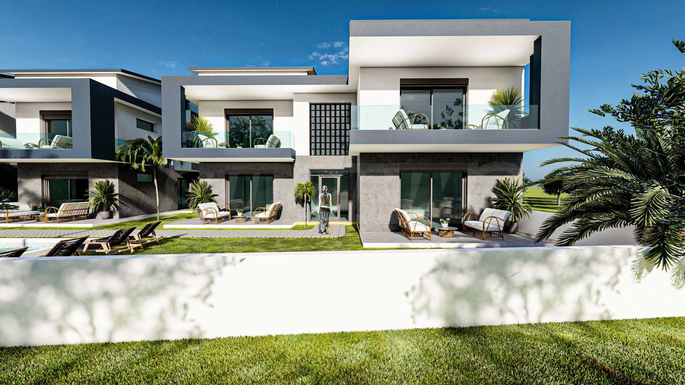 - 2 квартиры с гостиной, спальней, ванной комнатой и верандой площадью от 36,95 до 39,59 кв. м, расположенные на первом уровне зданий;