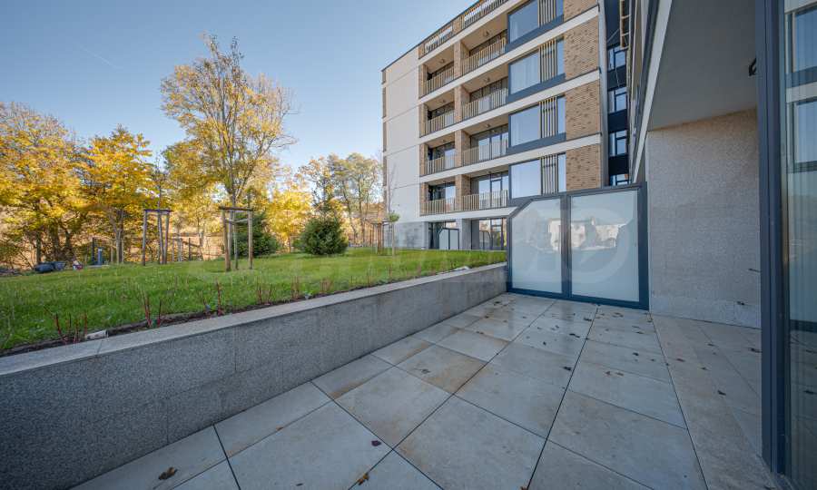 Квартира расположена на 1-м этаже, на первом этаже, с окнами на восток/север и имеет площадь 77,66 кв. м. Она состоит из прихожей, ванной комнаты/туалета, гостиной с кухней, одной спальни и лоджии с выходом из обеих комнат. Кроме того, к квартире примыкает земельный участок площадью 15,81 кв. м.