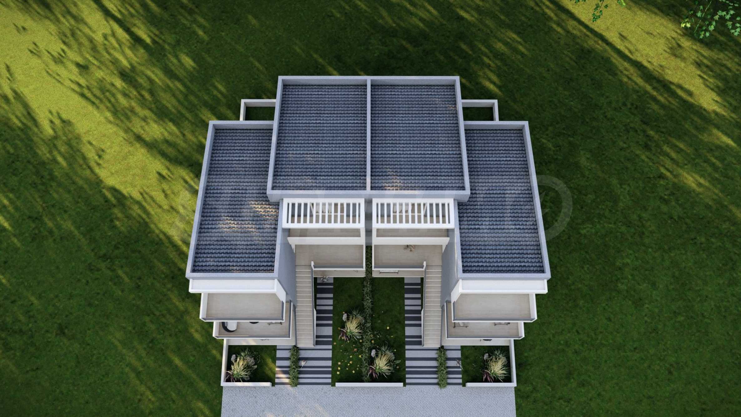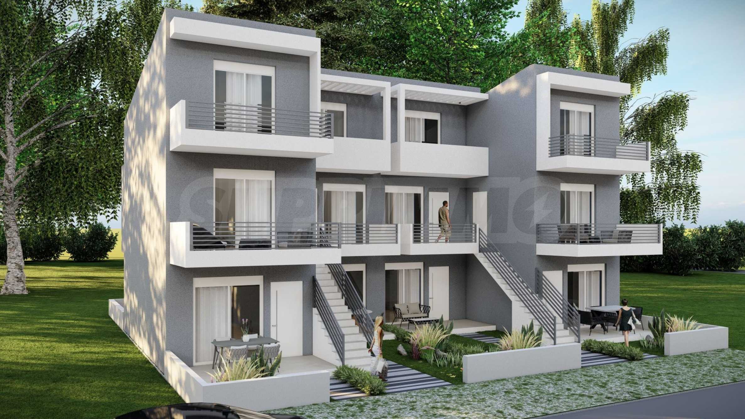 Квартиры площадью от 49,94 до 52,92 кв. метров расположены на 2-м и 3-м этажах здания и доступны по удобным внешним лестницам, что экономит пространство и исключает необходимость в общих зонах. Планировка включает гостиную с кухней, спальню, ванную комнату с туалетом и террасой на первом этаже и спальню с ванной комнатой и террасой на втором этаже. Все квартиры продаются «под ключ», включая входные и межкомнатные двери, напольное покрытие, пластиковые окна, кухонные шкафы и оборудованную ванную комнату.