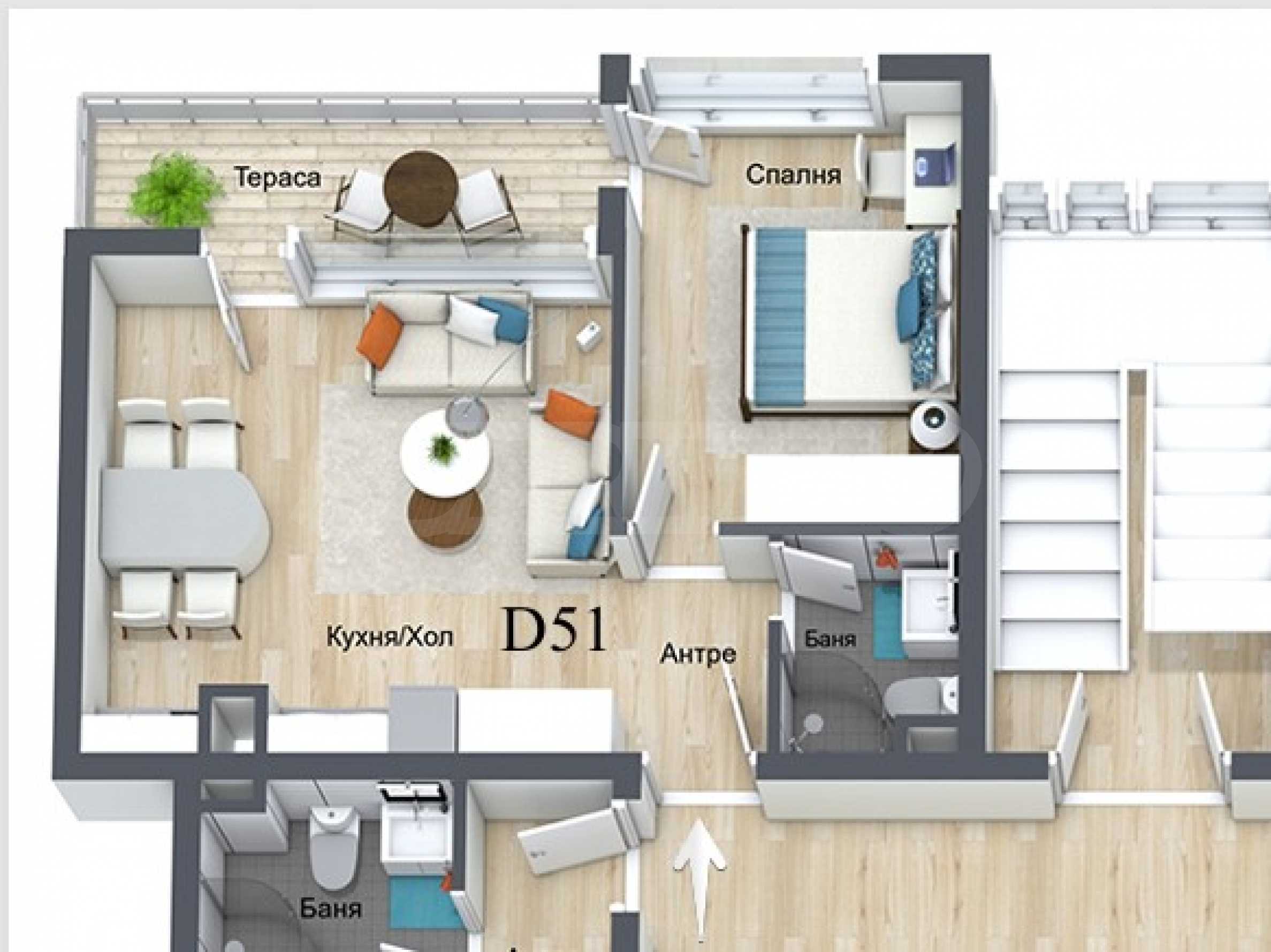 Квартира общей площадью 61,54 кв. м расположена на 5 этаже и имеет северо-восточную ориентацию. Состоит из прихожей, ванной комнаты/туалета, гостиной с кухней, спальни и террасы из обеих комнат. Фотографии в предложении являются образцовыми, с готового здания комплекса.