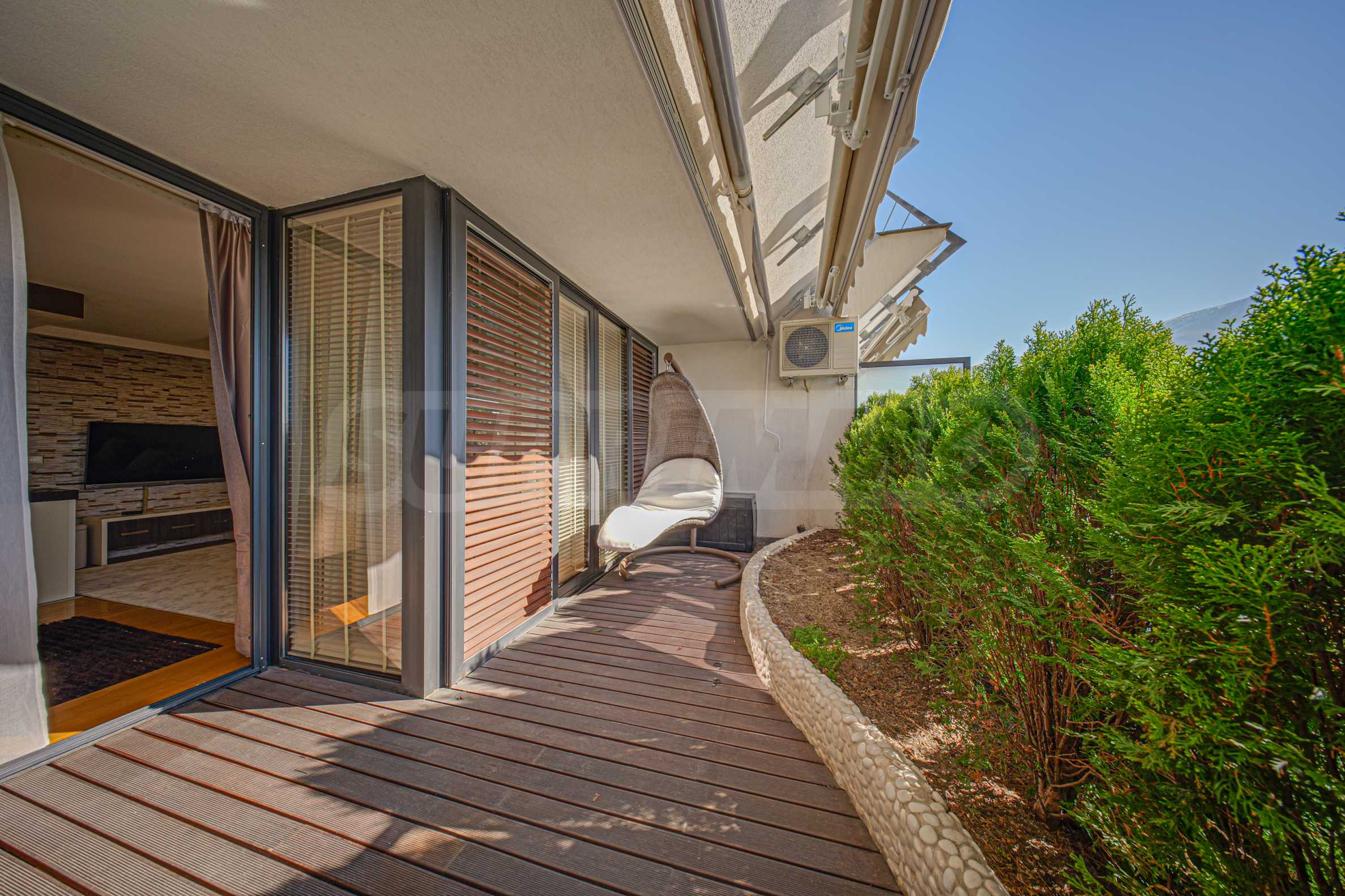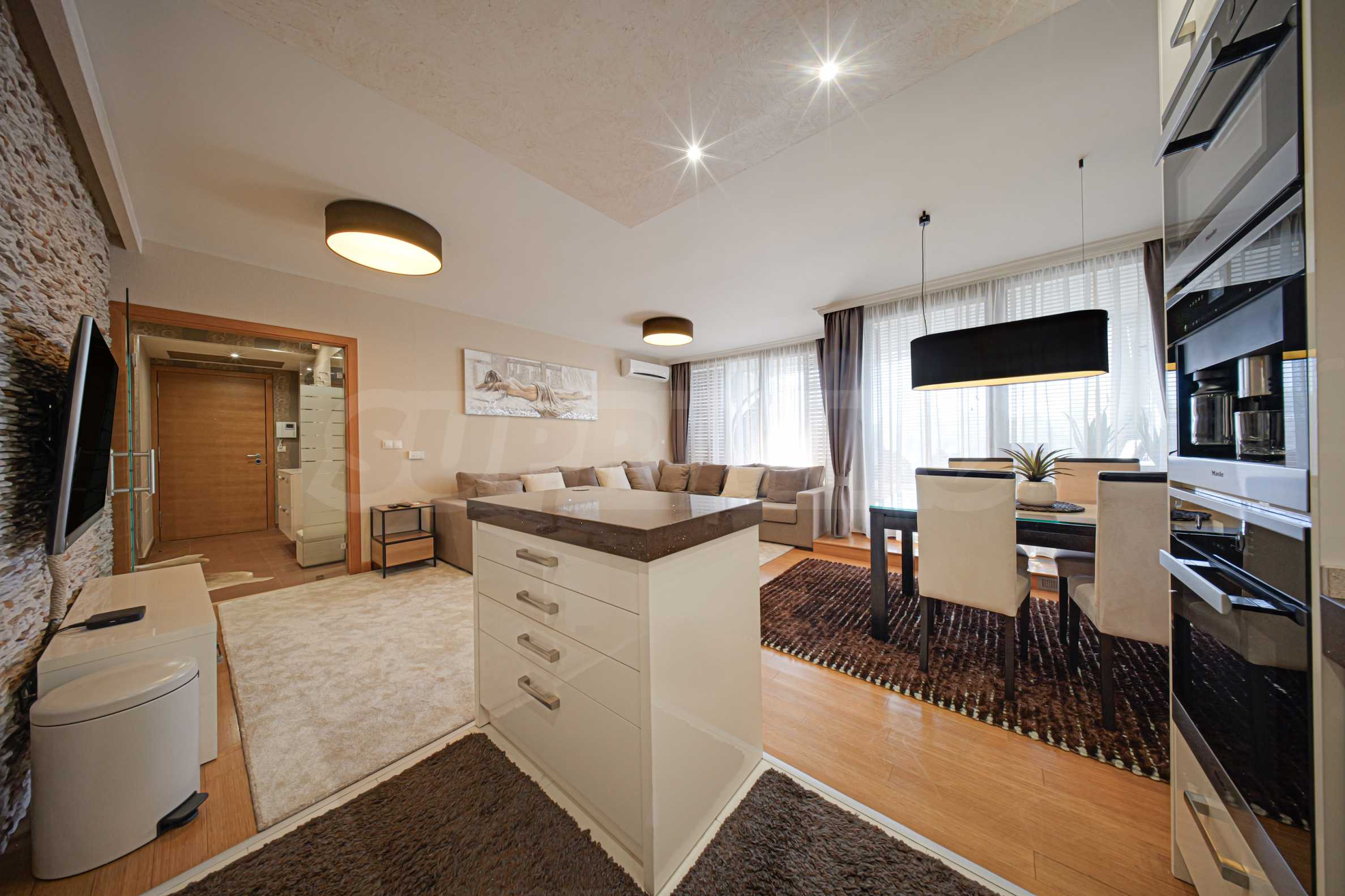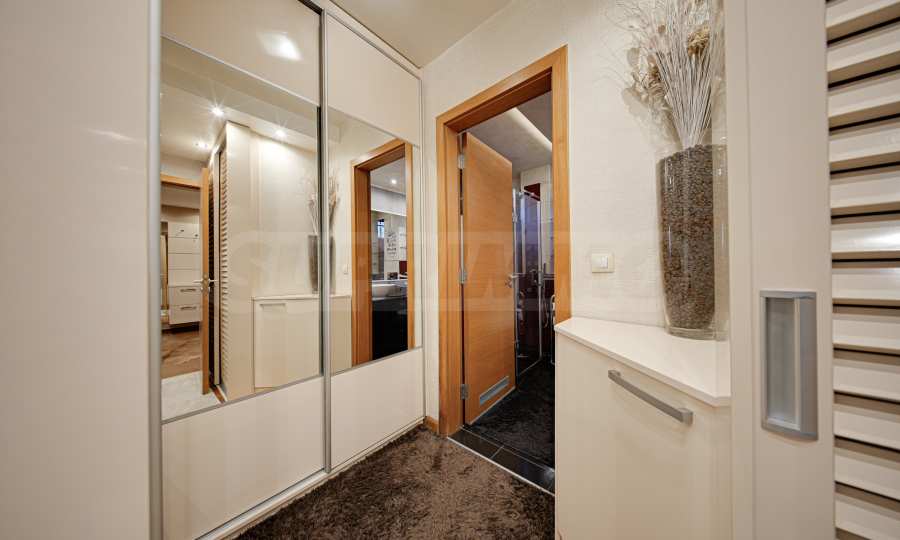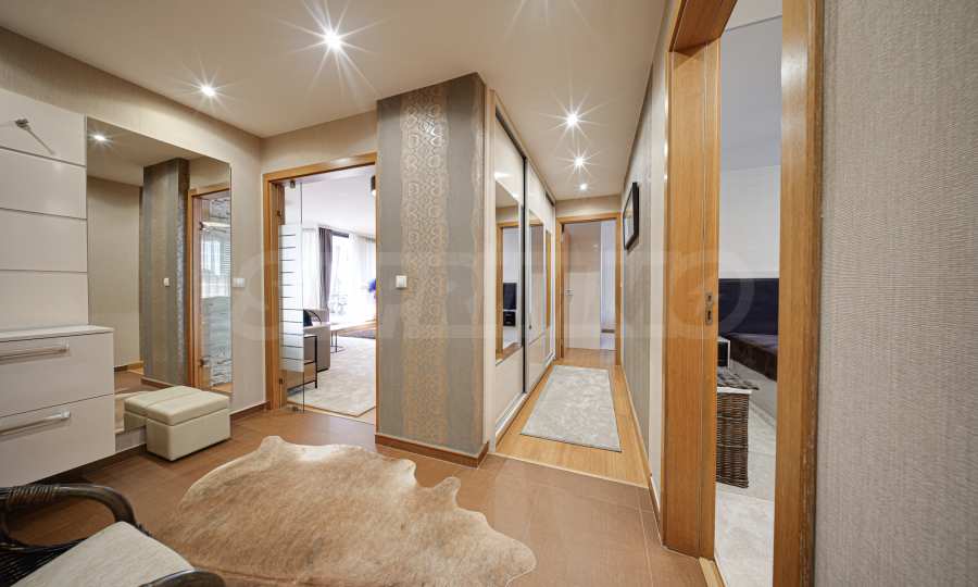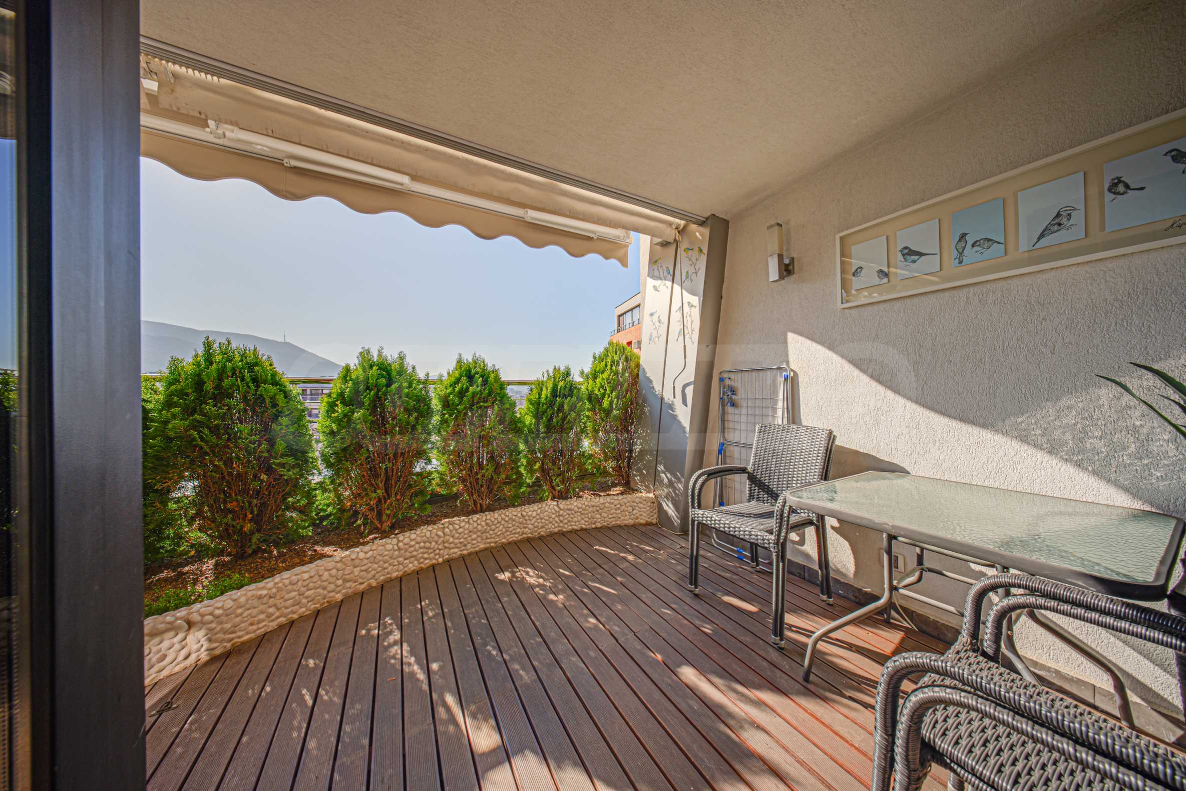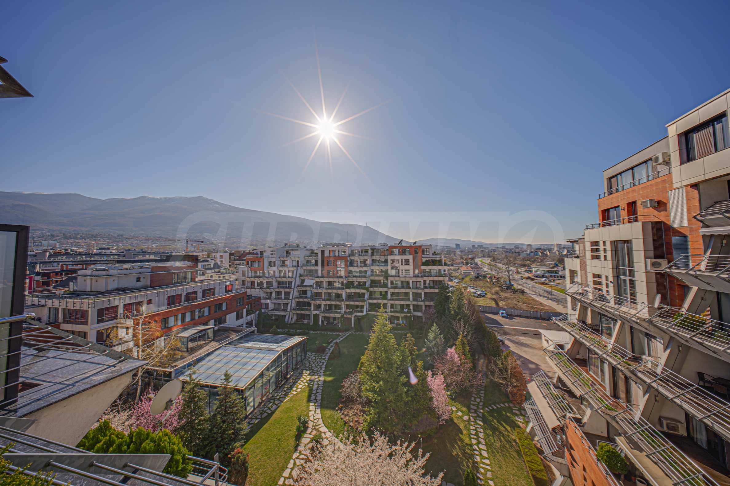 Планировка: отдельный вестибюль в общих помещениях здания, где останавливается лифт, прихожая в квартире, гостиная с кухней, две спальни, две ванные комнаты, терраса с панорамным видом на гору Витоша.