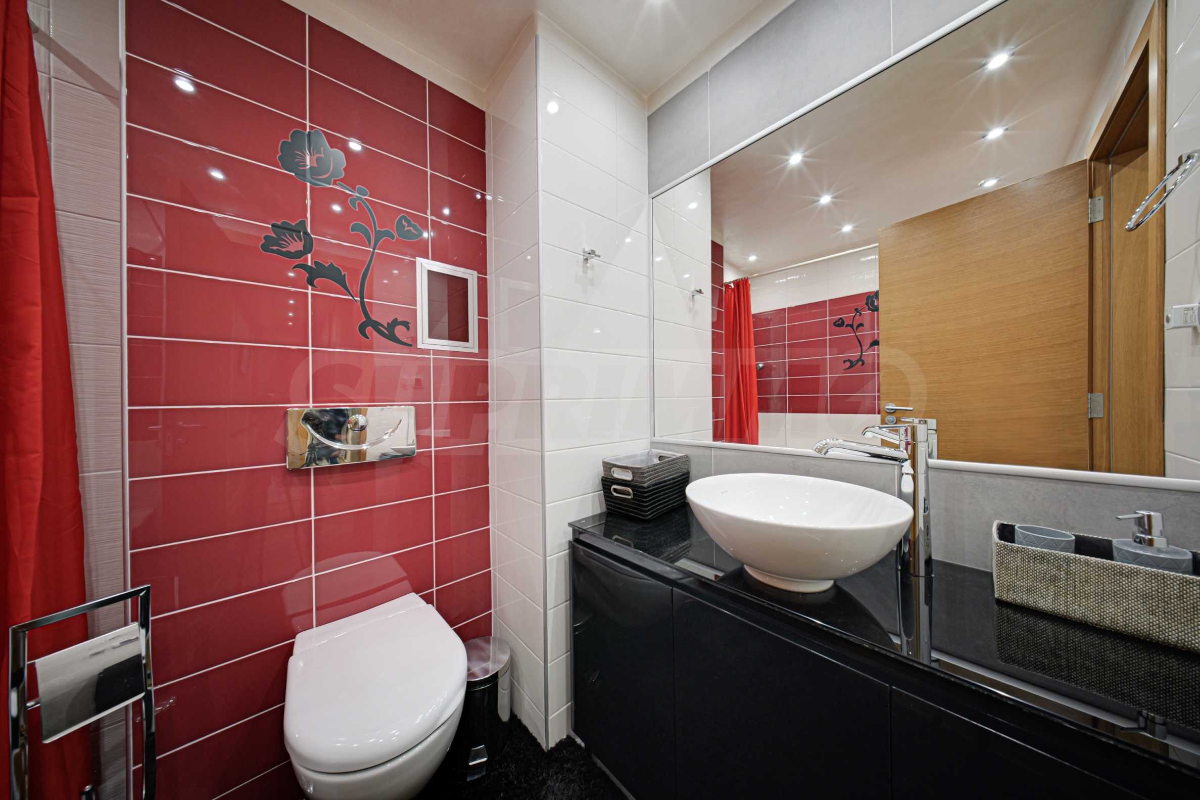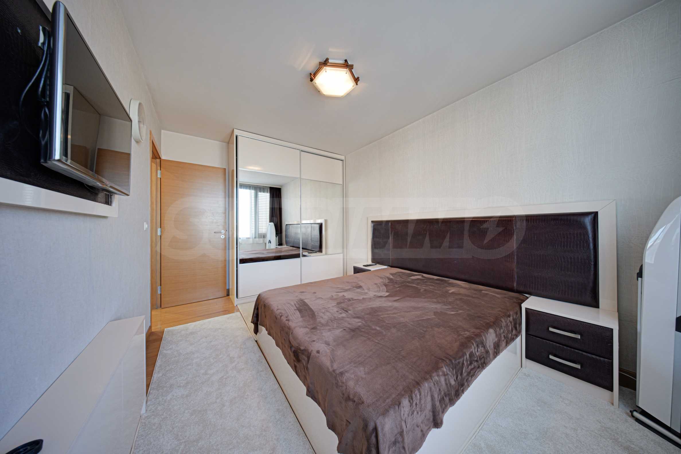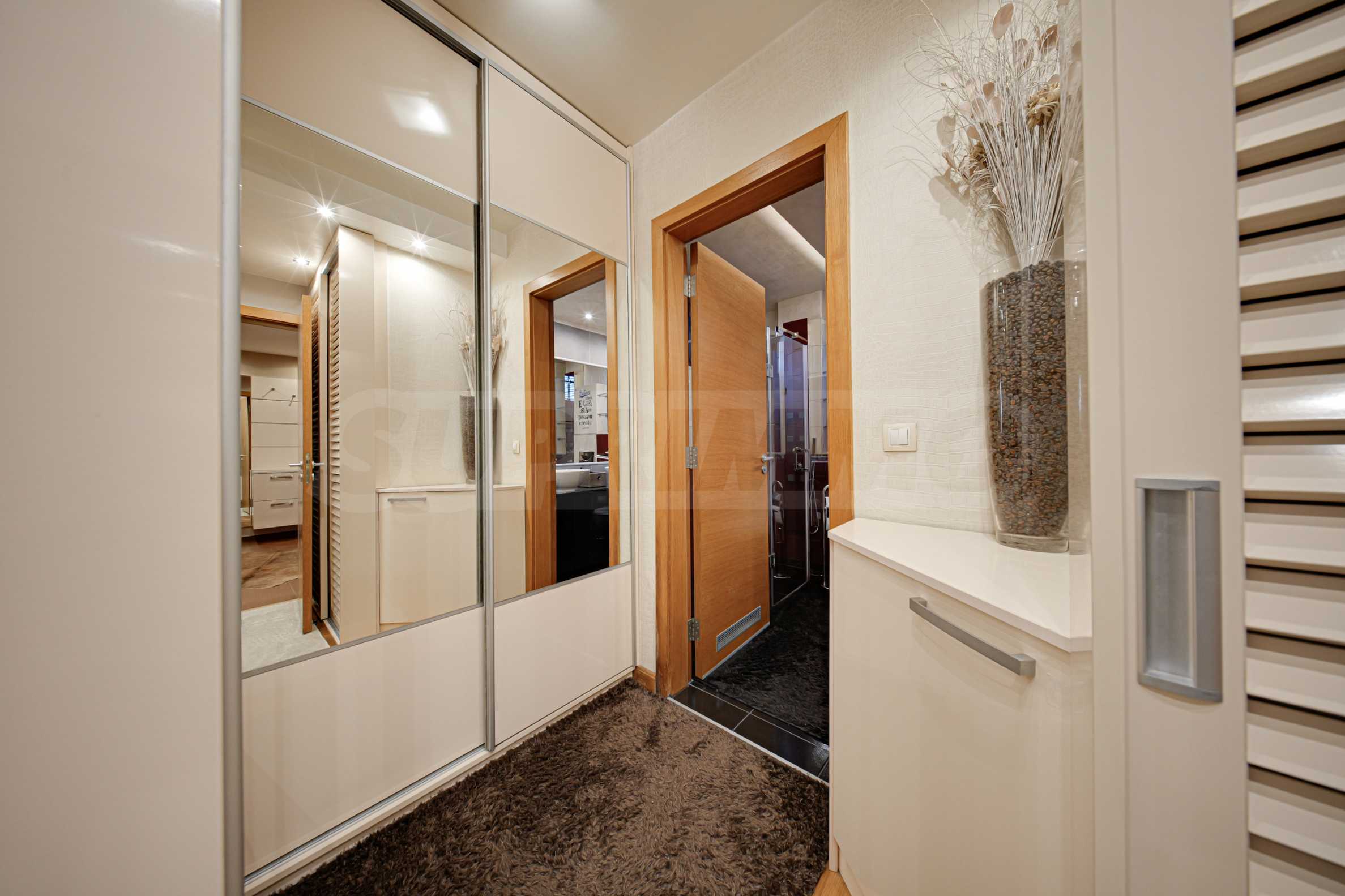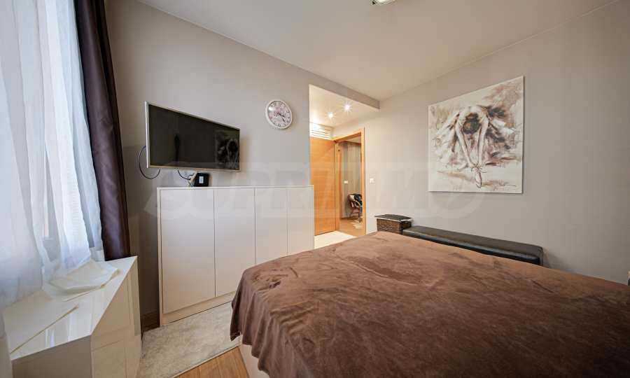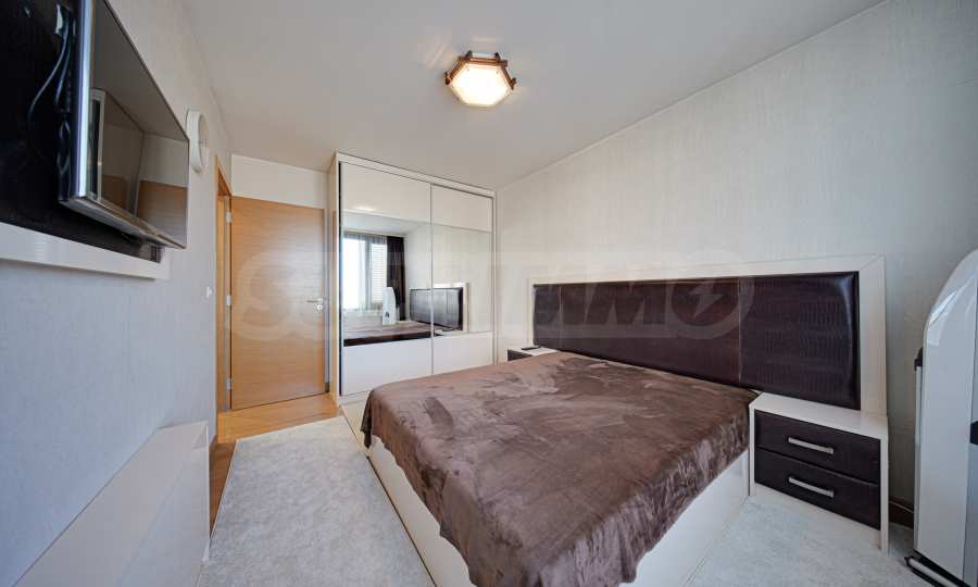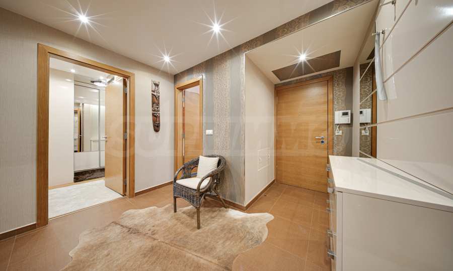 Планировка: отдельный вестибюль в общих помещениях здания, где останавливается лифт, прихожая в квартире, гостиная с кухней, две спальни, две ванные комнаты, терраса с панорамным видом на гору Витоша.