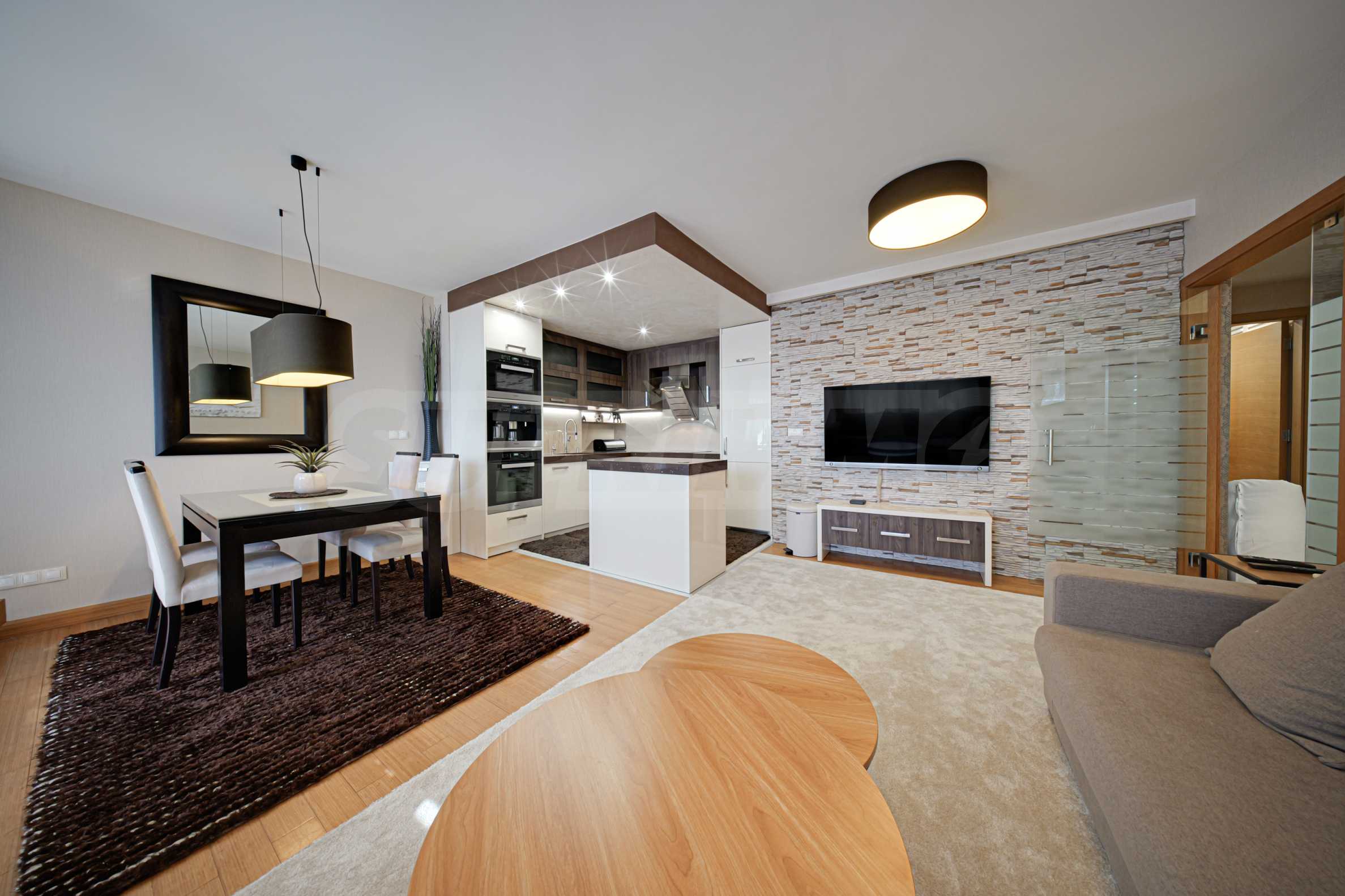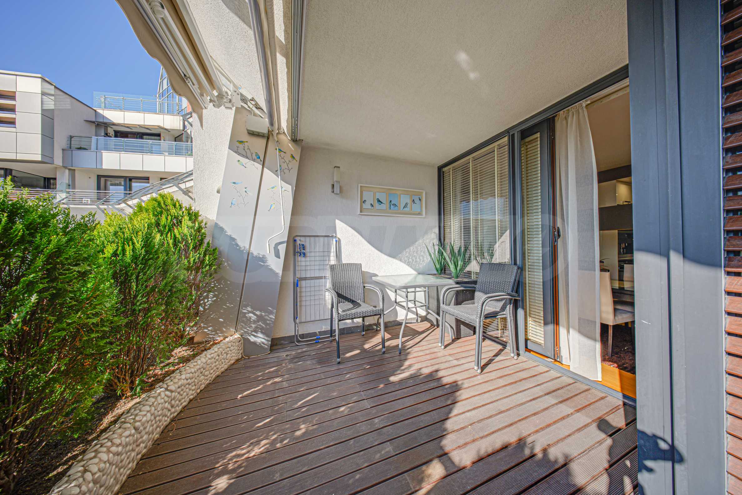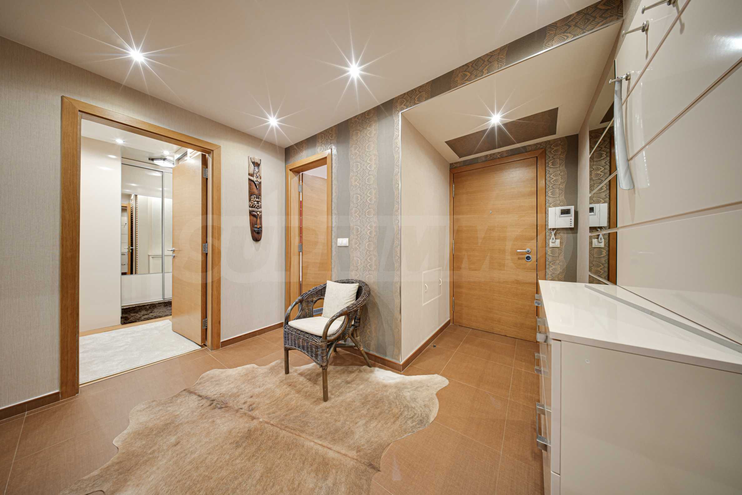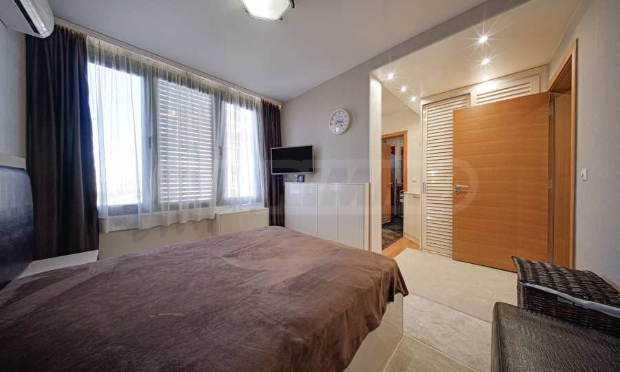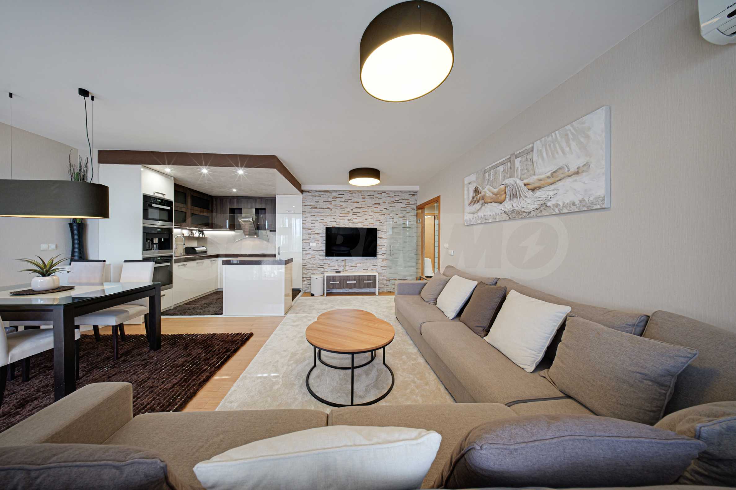 Планировка: отдельный вестибюль в общих помещениях здания, где останавливается лифт, прихожая в квартире, гостиная с кухней, две спальни, две ванные комнаты, терраса с панорамным видом на гору Витоша.