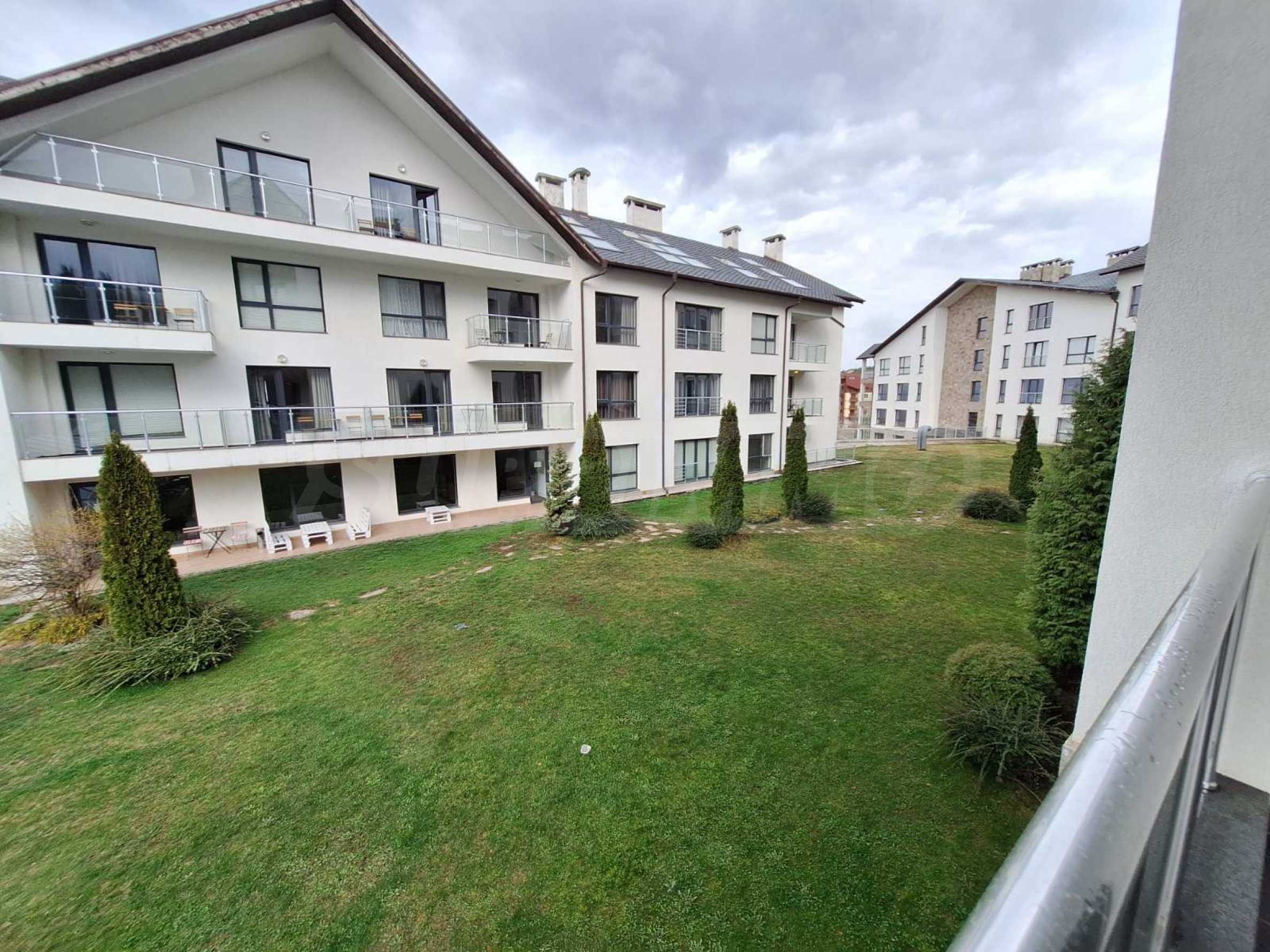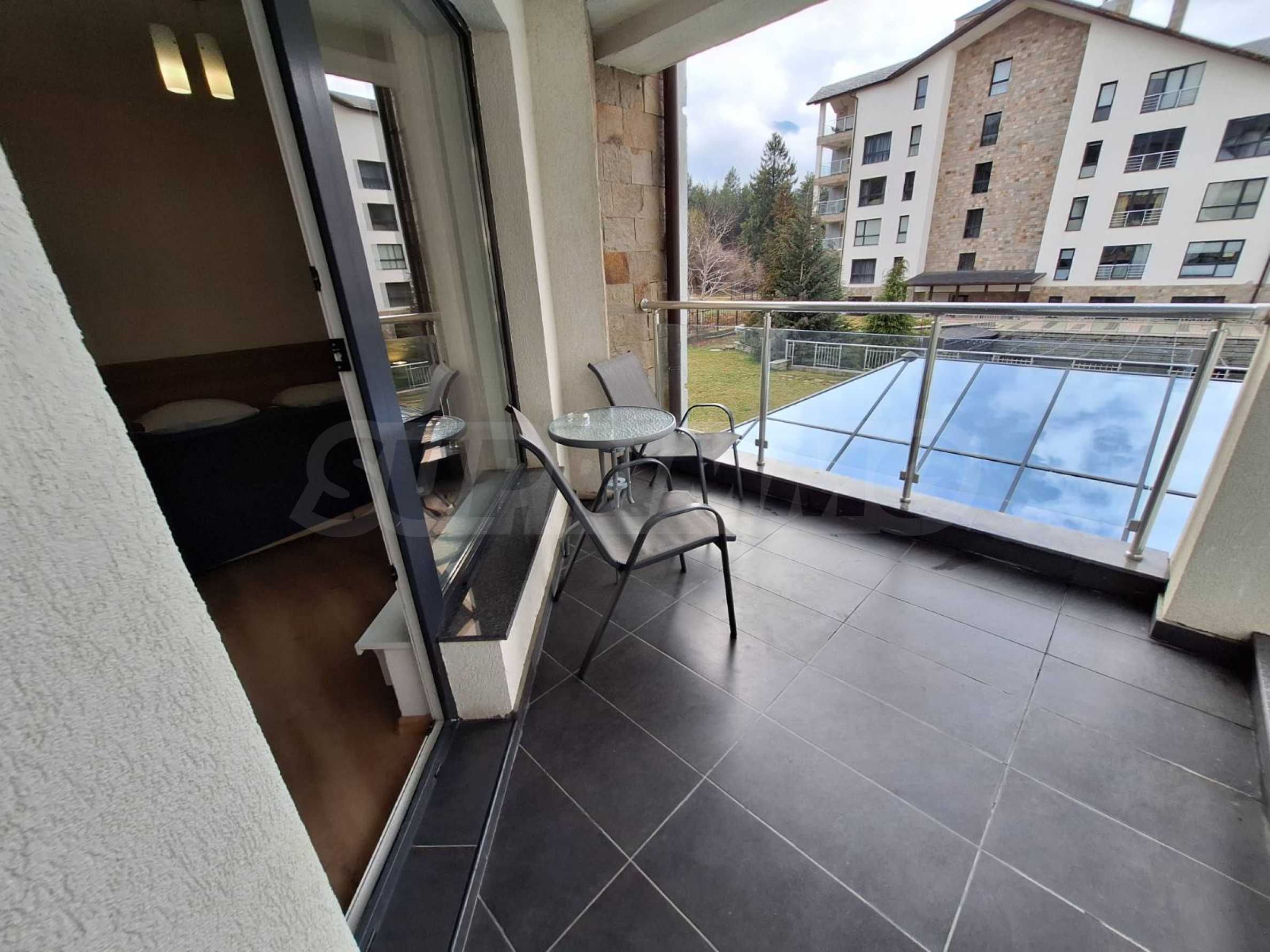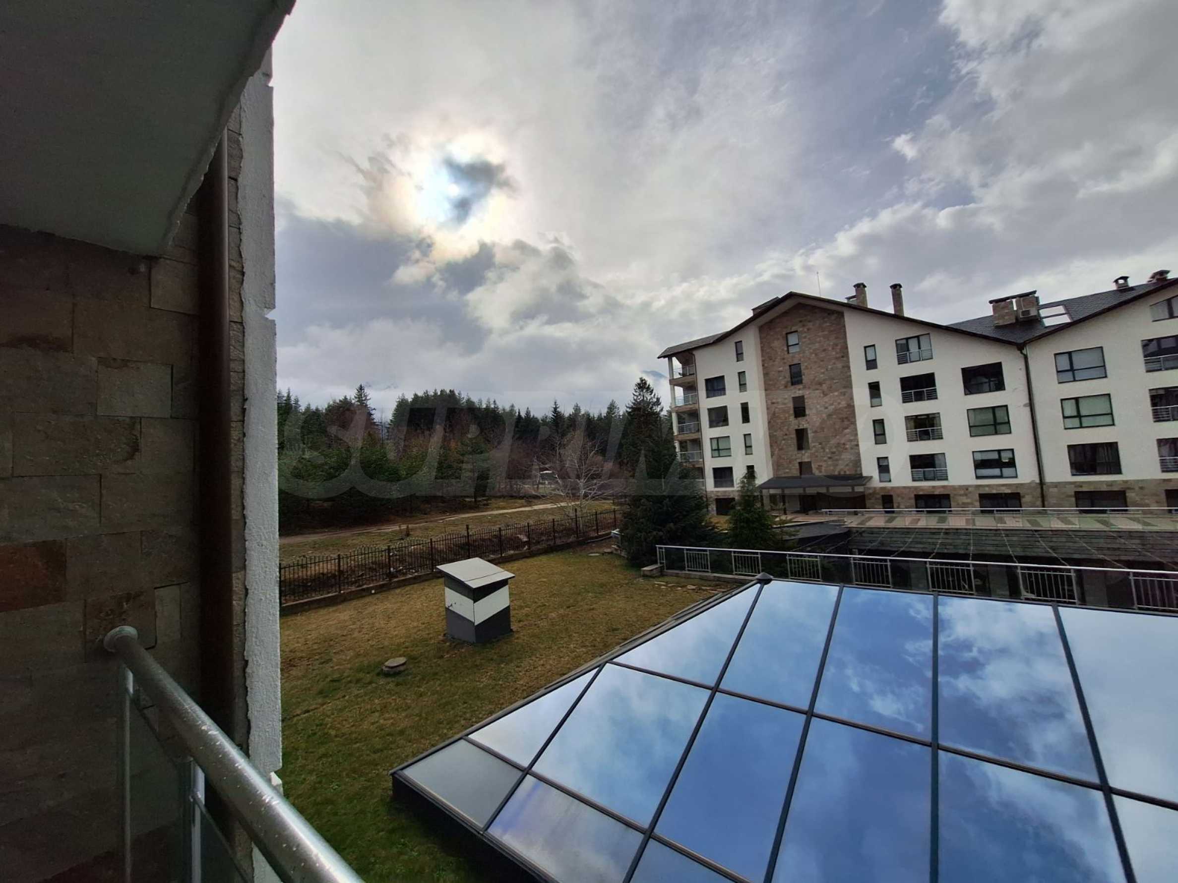 Недвижимость расположена в одном из самых роскошных круглогодичных комплексов в Банско, с обширной СПА-зоной с массажным кабинетом и панорамным видом на Банско, Пирин и Рилу. На территории комплекса есть ресторан традиционной болгарской, итальянской и европейской кухни, а также детская игровая площадка. В апарт-отеле есть 2 бара: спорт-бар с бильярдом и настольным футболом и панорамный лобби-бар на 50 мест с видом на горы. Гости могут расслабиться в крытом бассейне и гидромассажной ванне или воспользоваться оборудованным фитнес-залом и конференц-залом (на 100-120 мест), а также следующими услугами - прачечная, глажка, химчистка, сейфы на ресепшене, прокат автомобилей, экскурсии и трансферы.