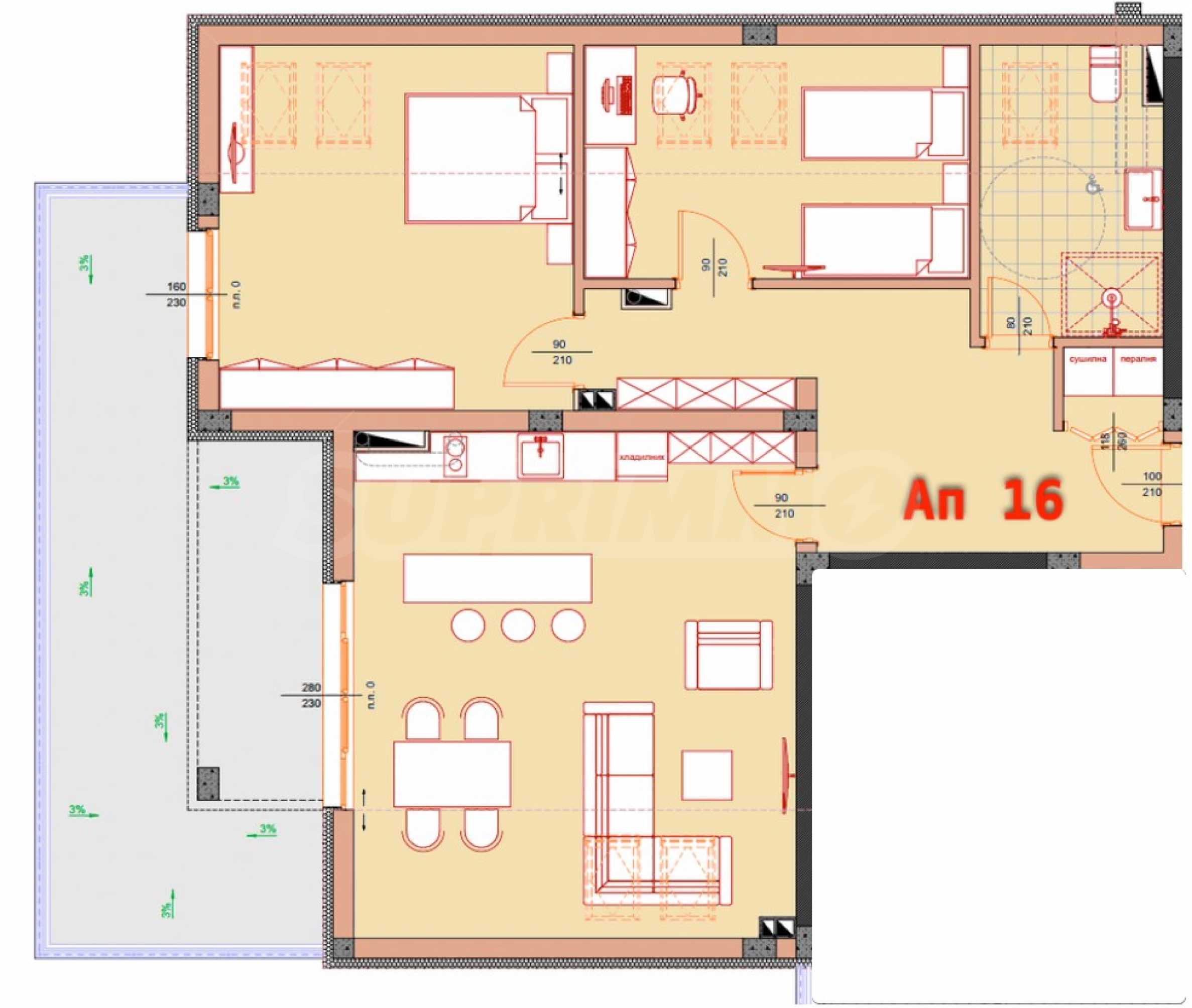 - Террасы: пол с гидроизоляцией, гранитная плитка и дренажный сифон, потолок с тонкой шпатлевкой и латексом.