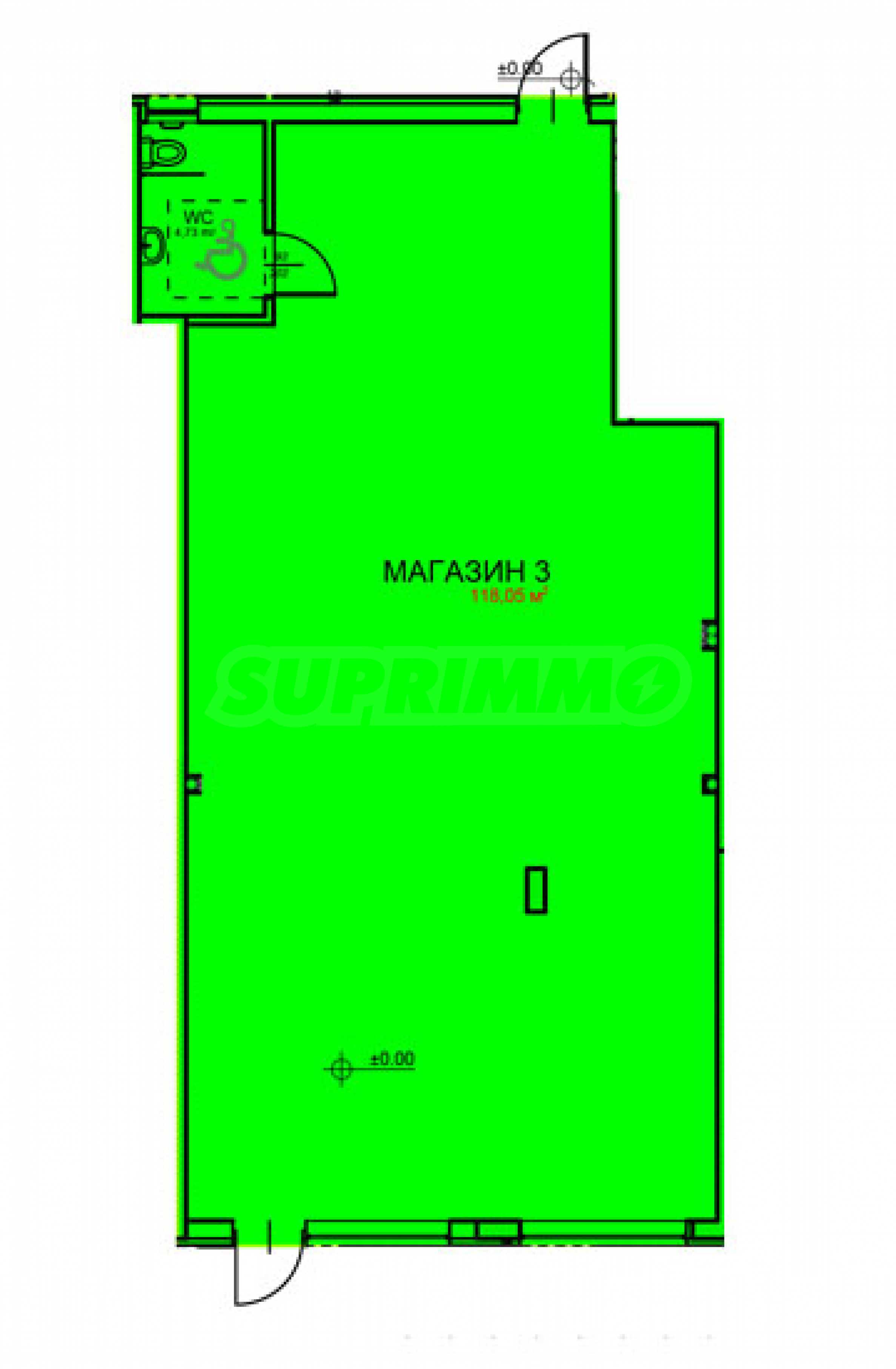 Магазин № 3 расположен на 1-м этаже и имеет общую площадь 140,48 кв. м, включая санузел. Предлагается в частичной готовности в соответствии с Гражданским кодексом Болгарии.