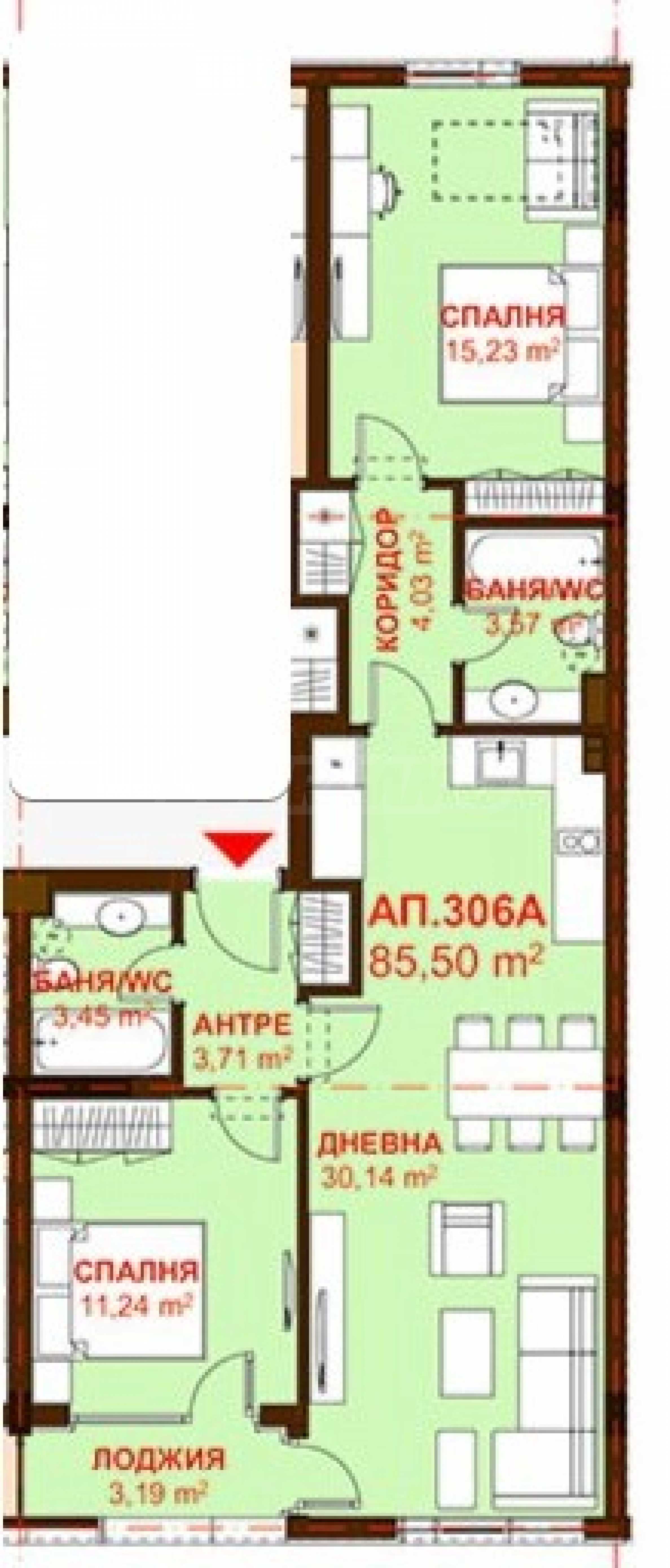 Квартира площадью 103,08 кв. м расположена на 4 этаже (3-й жилой) и состоит из: прихожей, гостиной с кухней, двух спален, коридора, двух ванных комнат с туалетом и террасы. Выдается в степени готовности согласно Болгарским строительным нормам, под шпатлевку и стяжку.