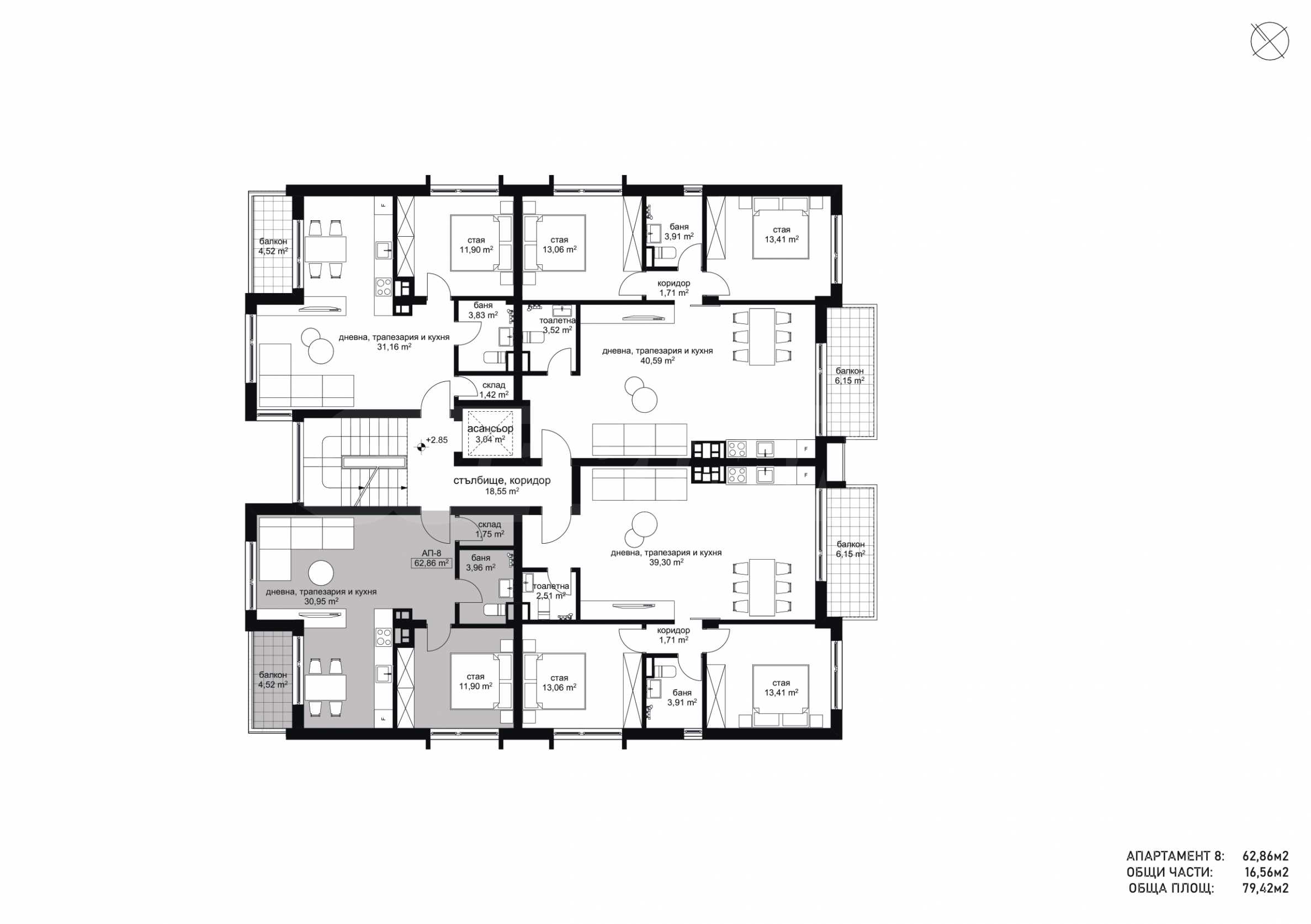 Специальное предложение касается двухкомнатной квартиры с окнами на юг, общей площадью 86 м?, расположенной на втором этаже и состоящей из прихожей, кухни с гостиной, спальни, ванной комнаты с туалетом и террасы.