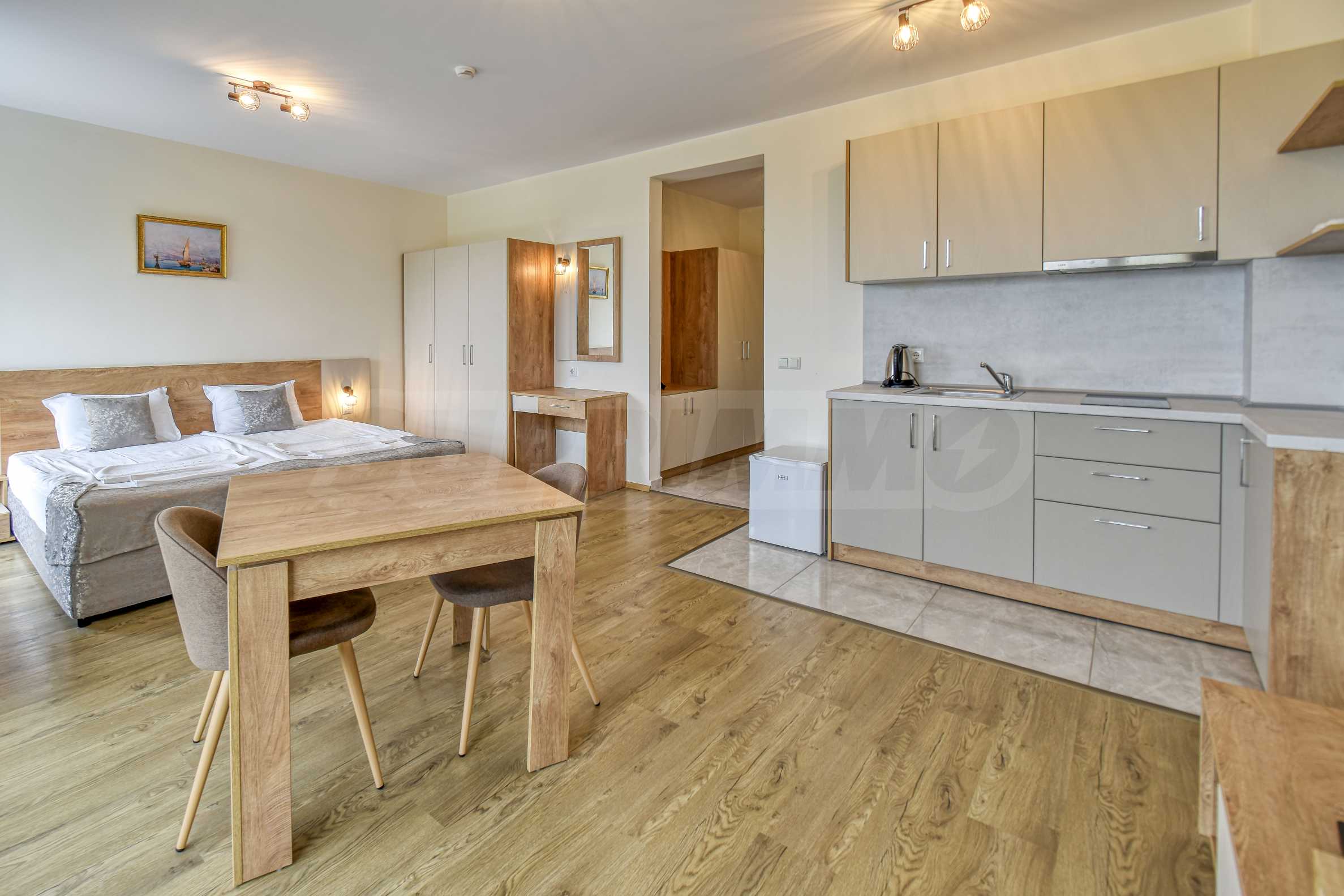 Представляем Вам отличную студию с видом на море, расположенную на втором этаже четырехзвездочного отеля в городе Приморско - на первой линии с прямым выходом на пляж.