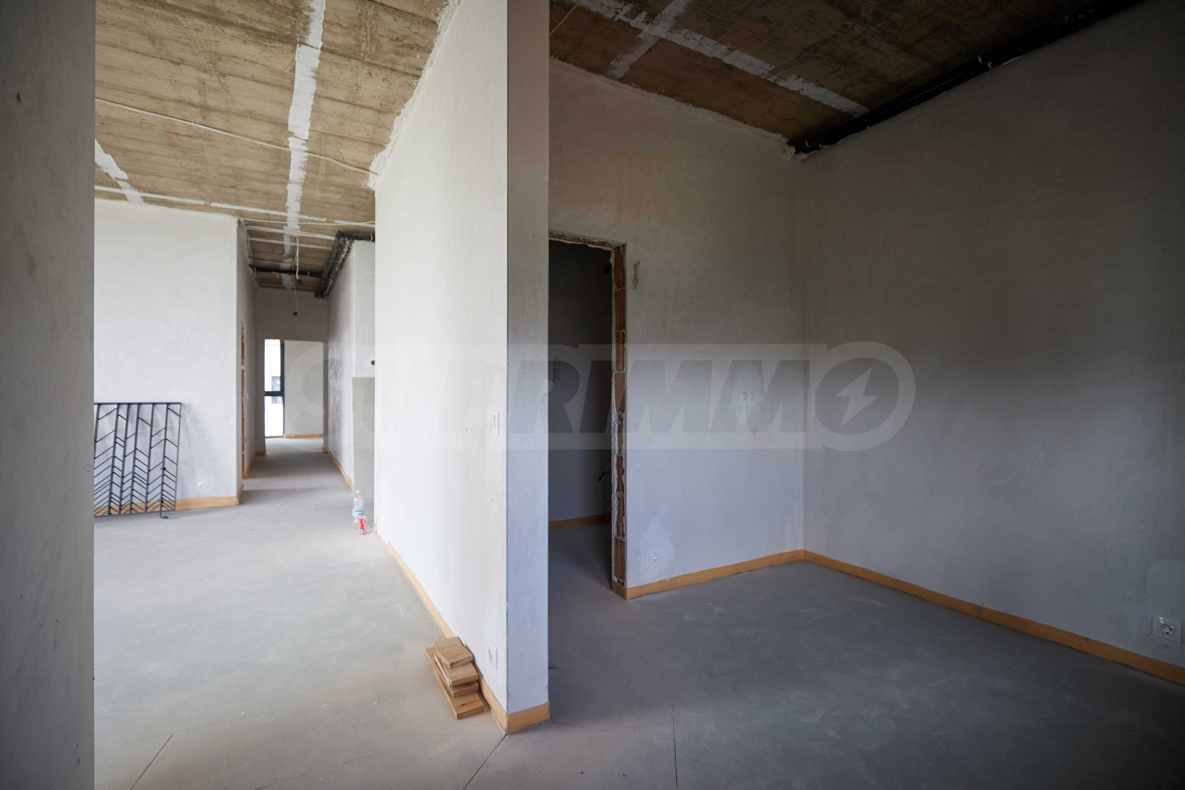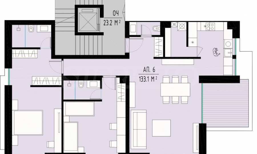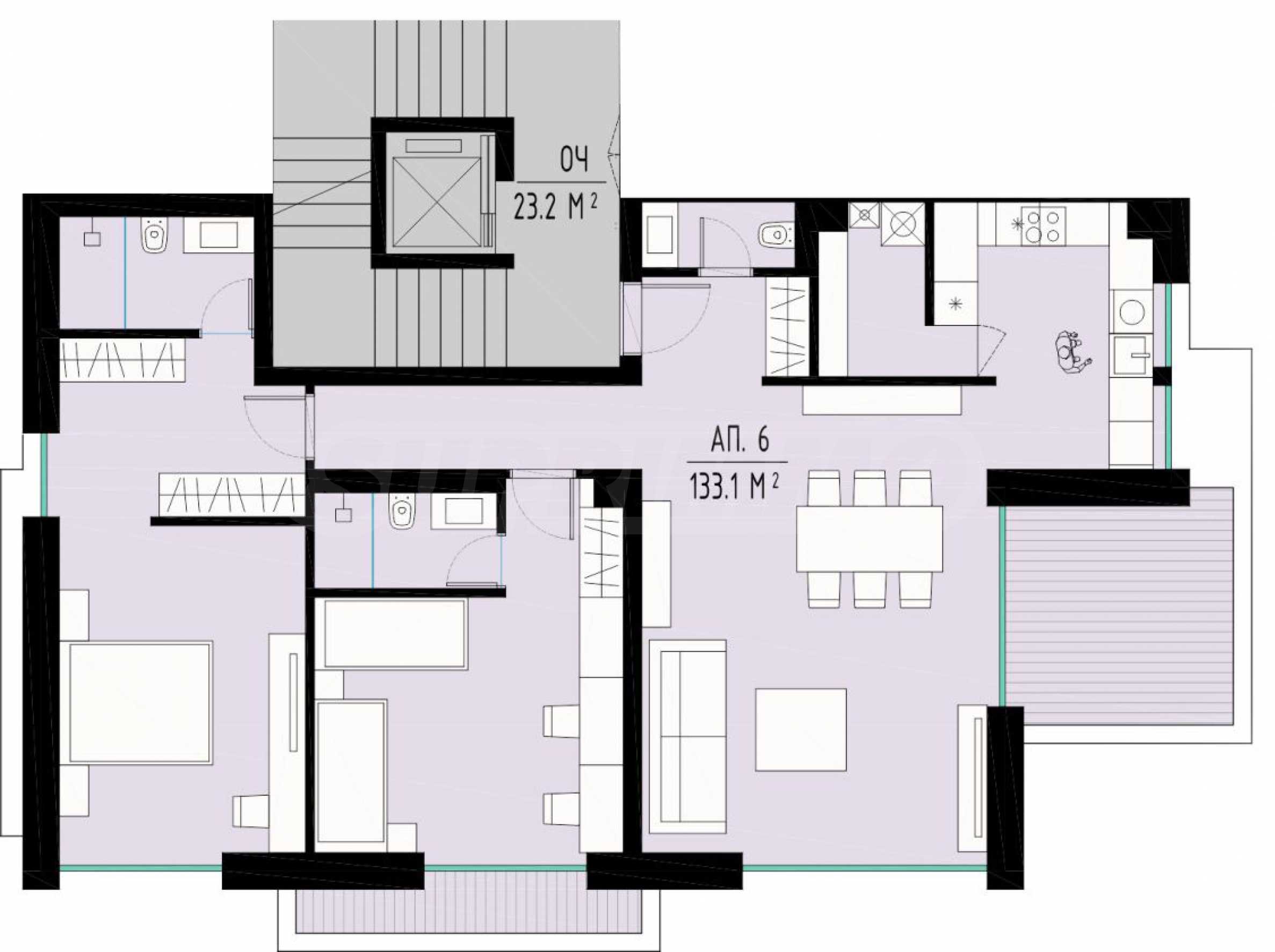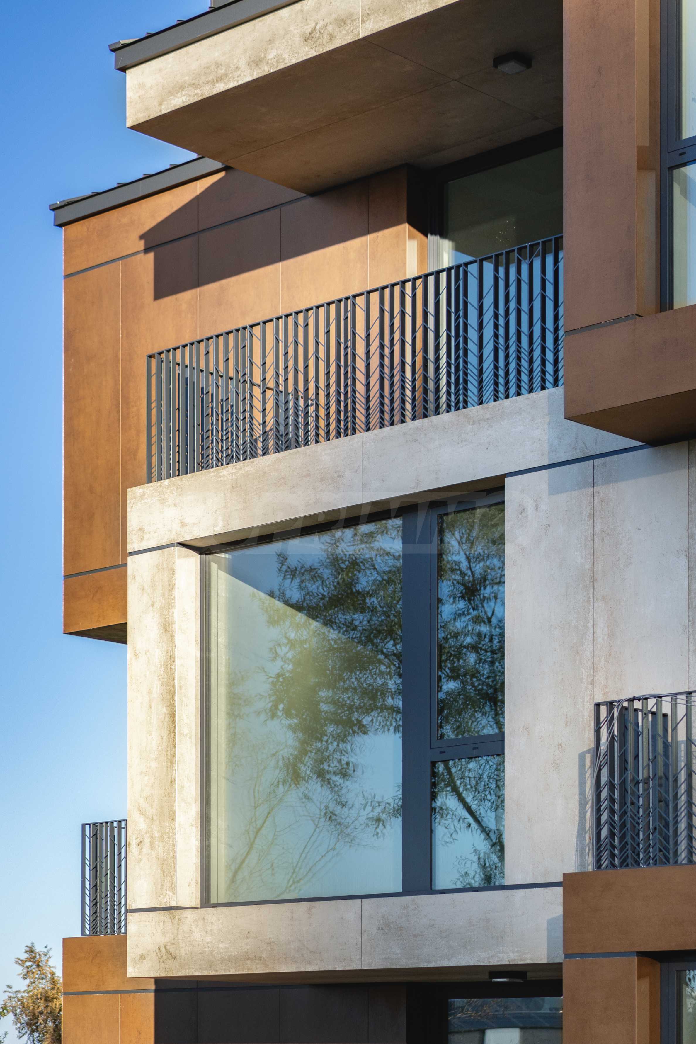 Квартира расположена на третьем жилом этаже, окна выходят на юго-восток/северо-восток. Общая площадь составляет 155,76 кв. м, из которых 133,1 кв. м приходится на жилую площадь, а 22,66 кв. м – на общие помещения. С террасы, выходящей в гостиную, открывается вид на Софию. Пространство организовано таким образом, чтобы обеспечить максимальное освещение и комфорт проживания.