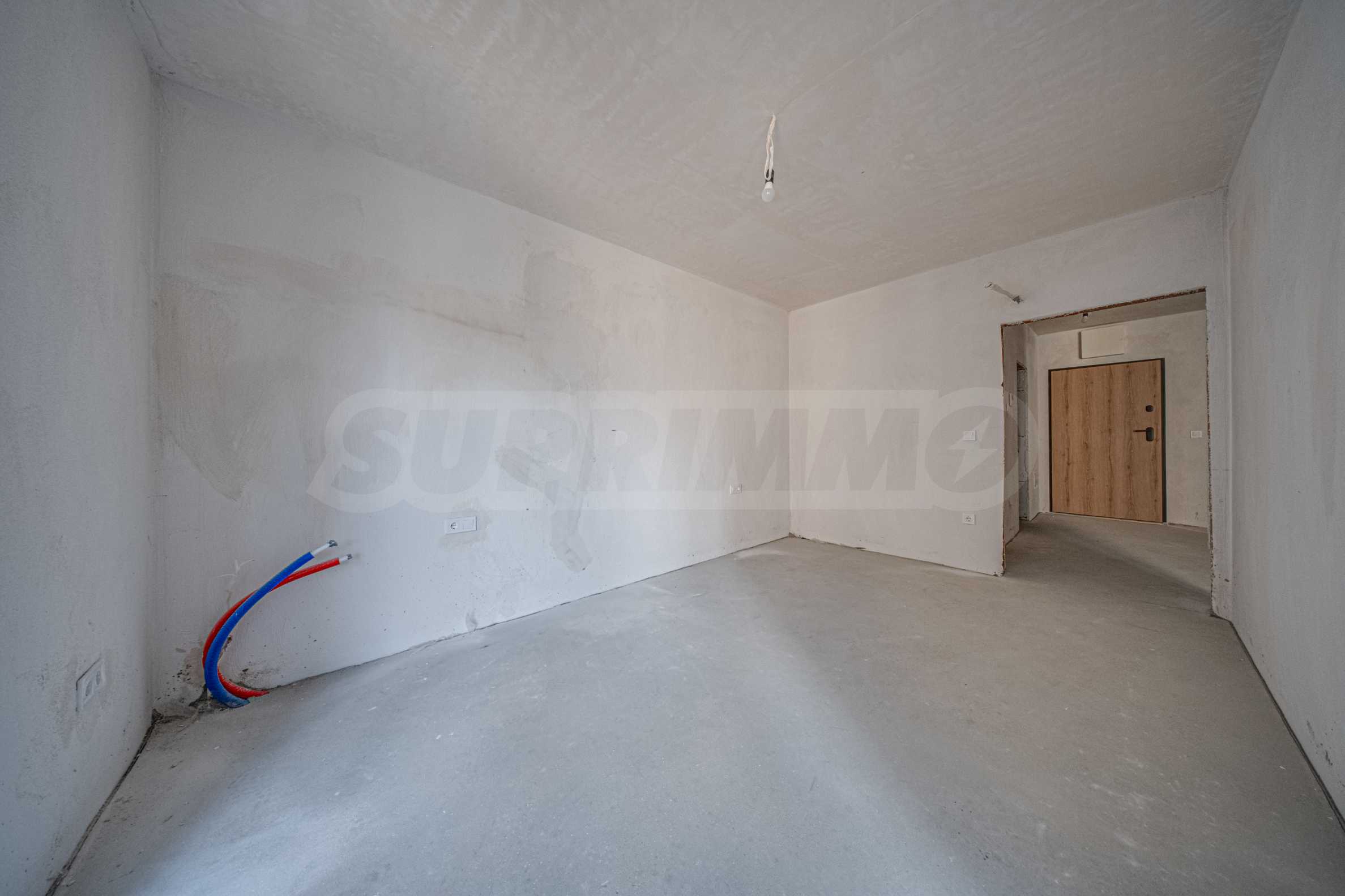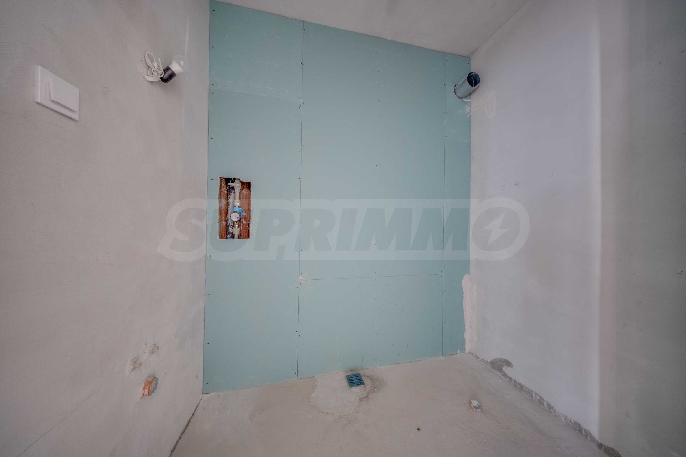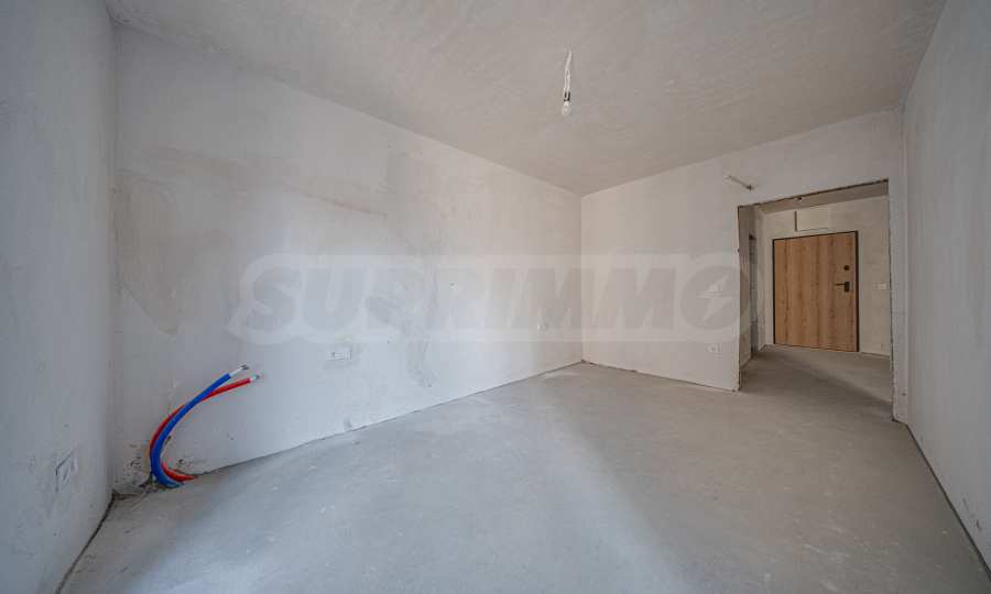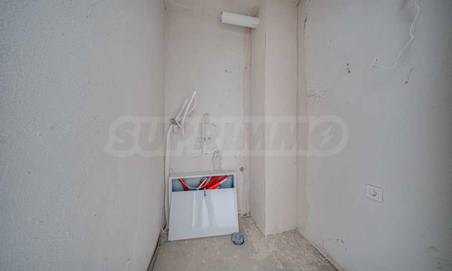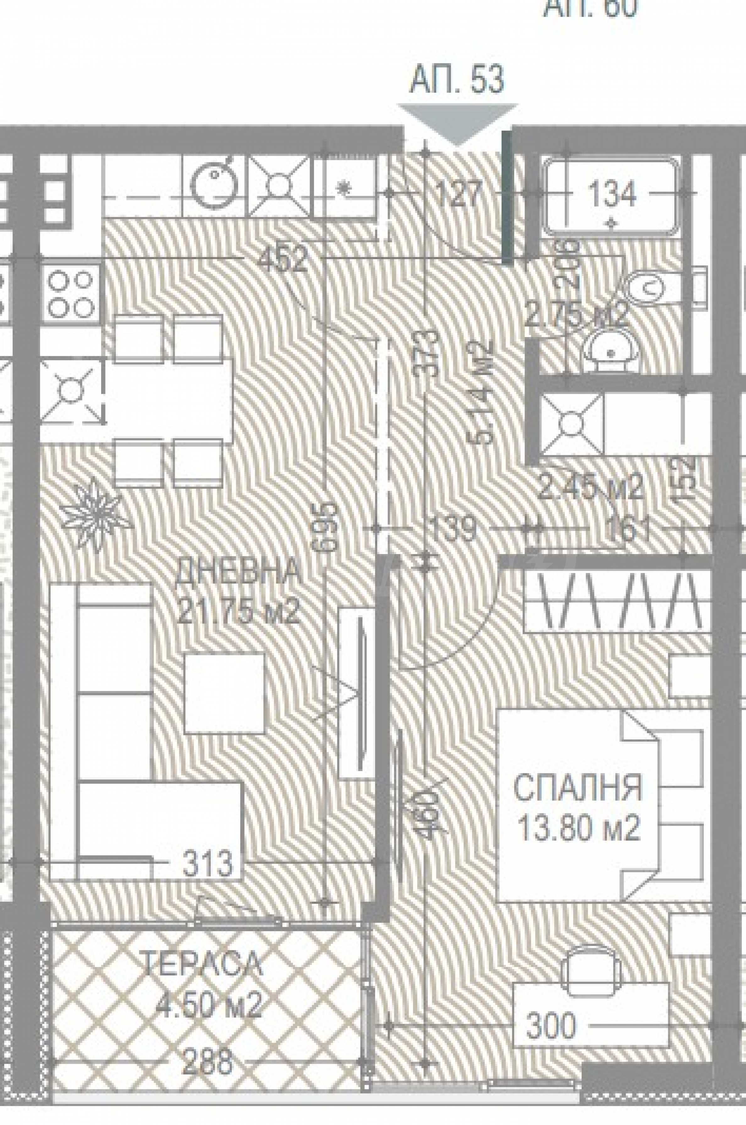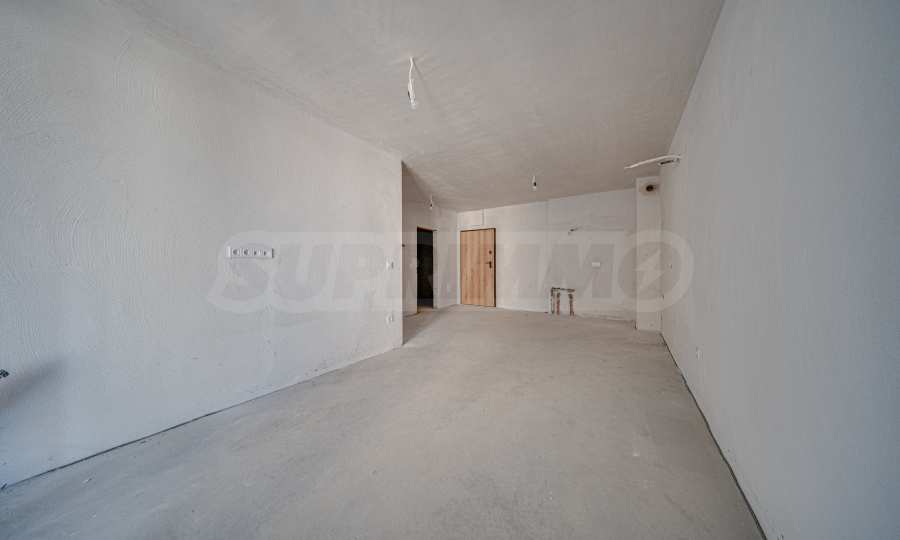 Квартира расположена на 5 этаже и состоит из прихожей, ванной комнаты с туалетом, подсобного помещения, гостиной с кухней и столовой, террасы, одной спальни. Общая площадь квартиры составляет 77,11 м2., есть кладовая площадью 3,54 м2.