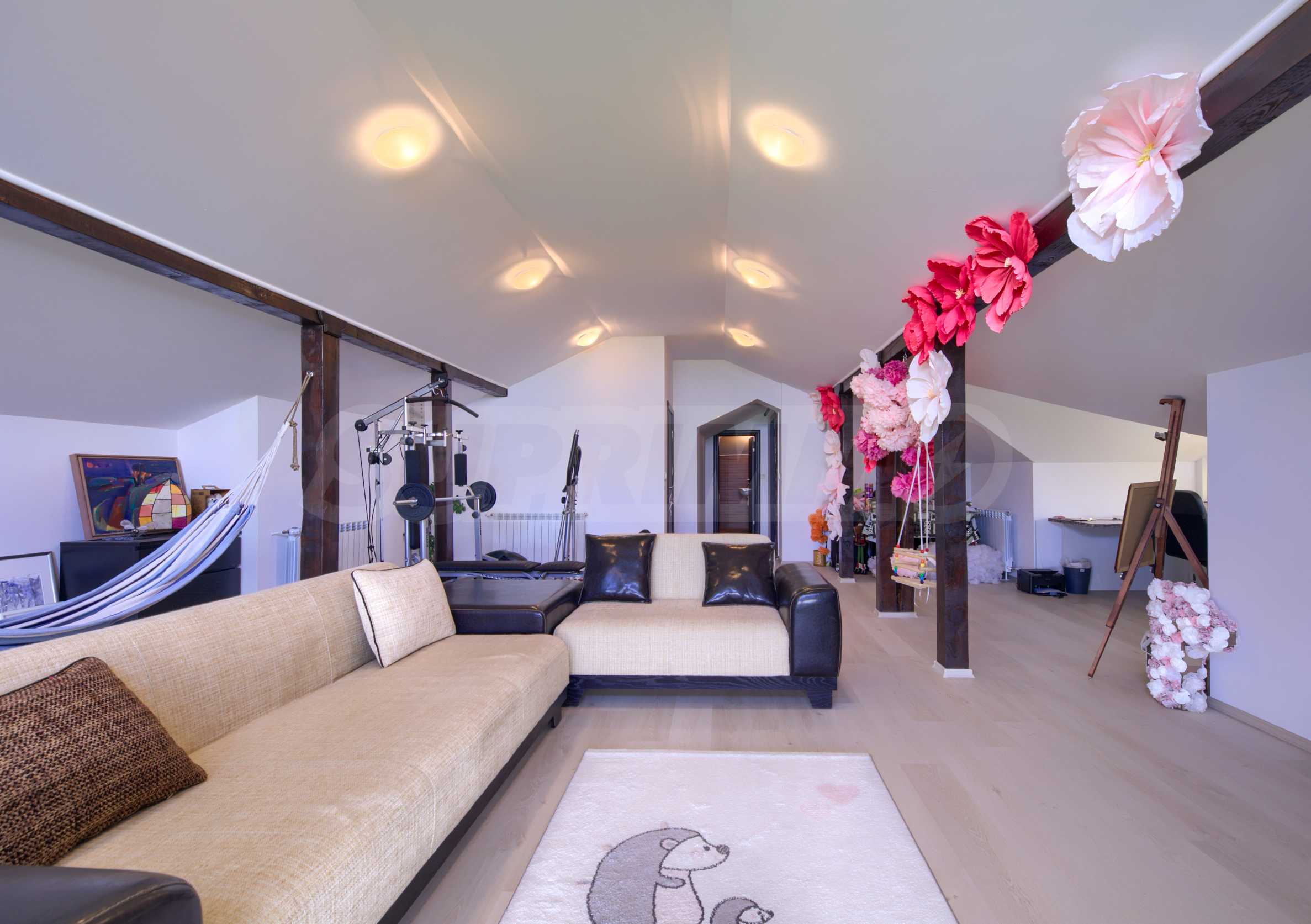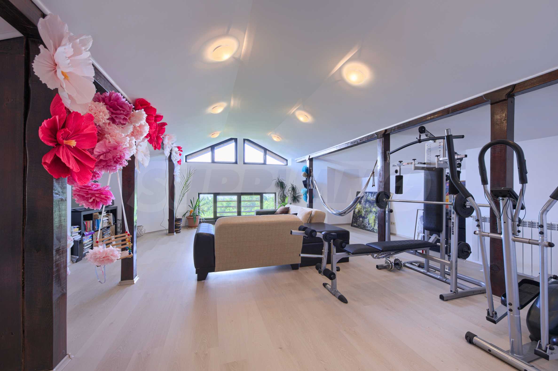 • Просторное помещение с высокими потолками, подойдет для спортзала, кабинета, зоны отдыха, студии или детского уголка;