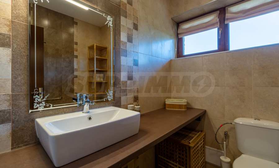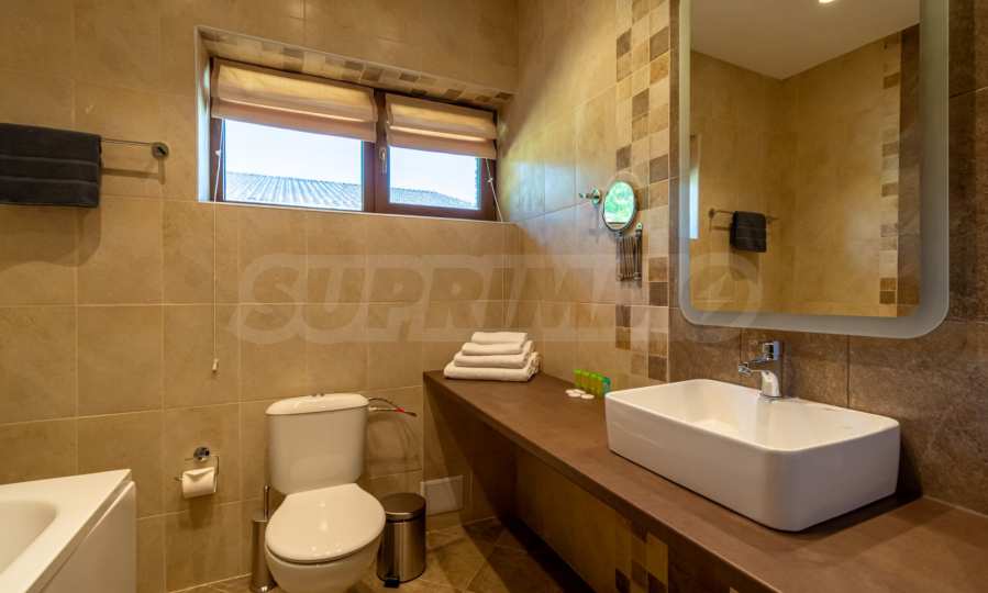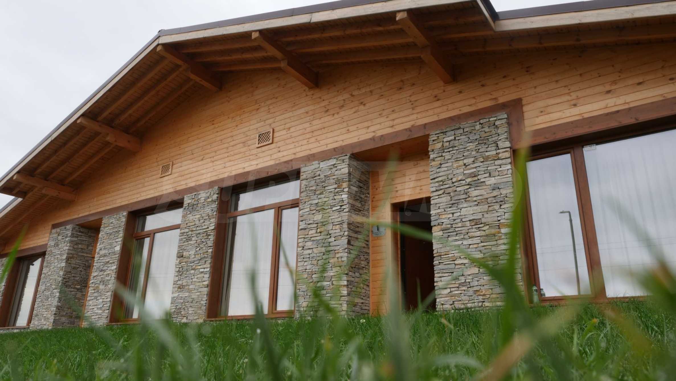 Снаружи дом полностью утеплен в соответствии с современными требованиями и облицован резным камнем и деревом, что делает его прохладным летом и теплым в зимние месяцы.
