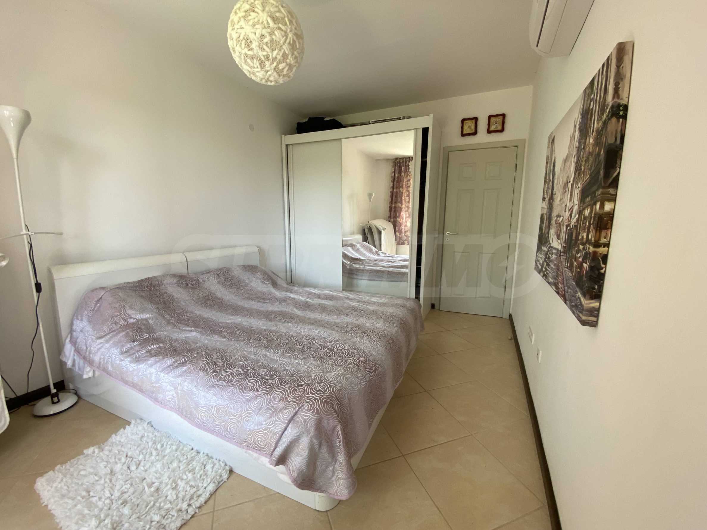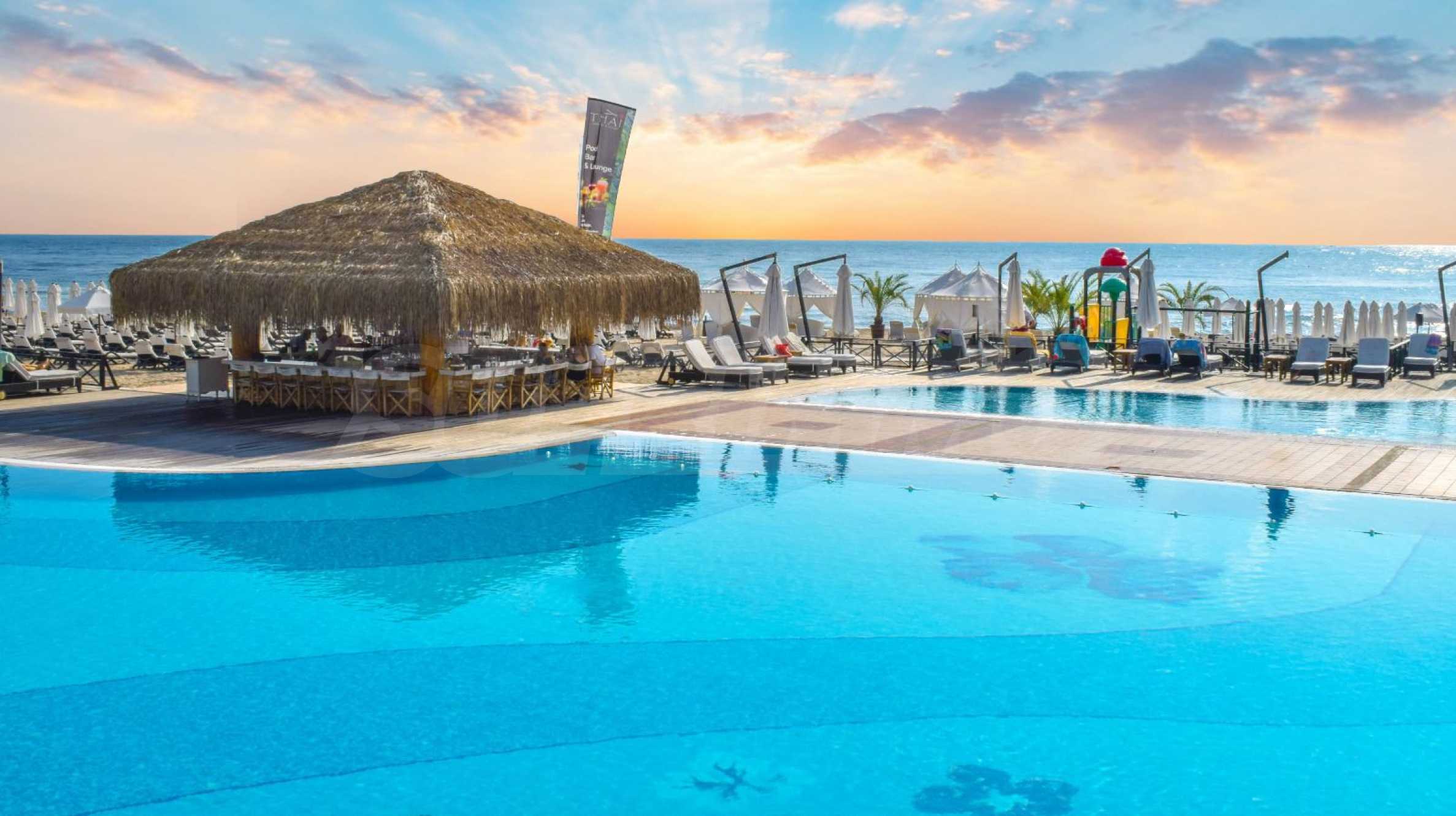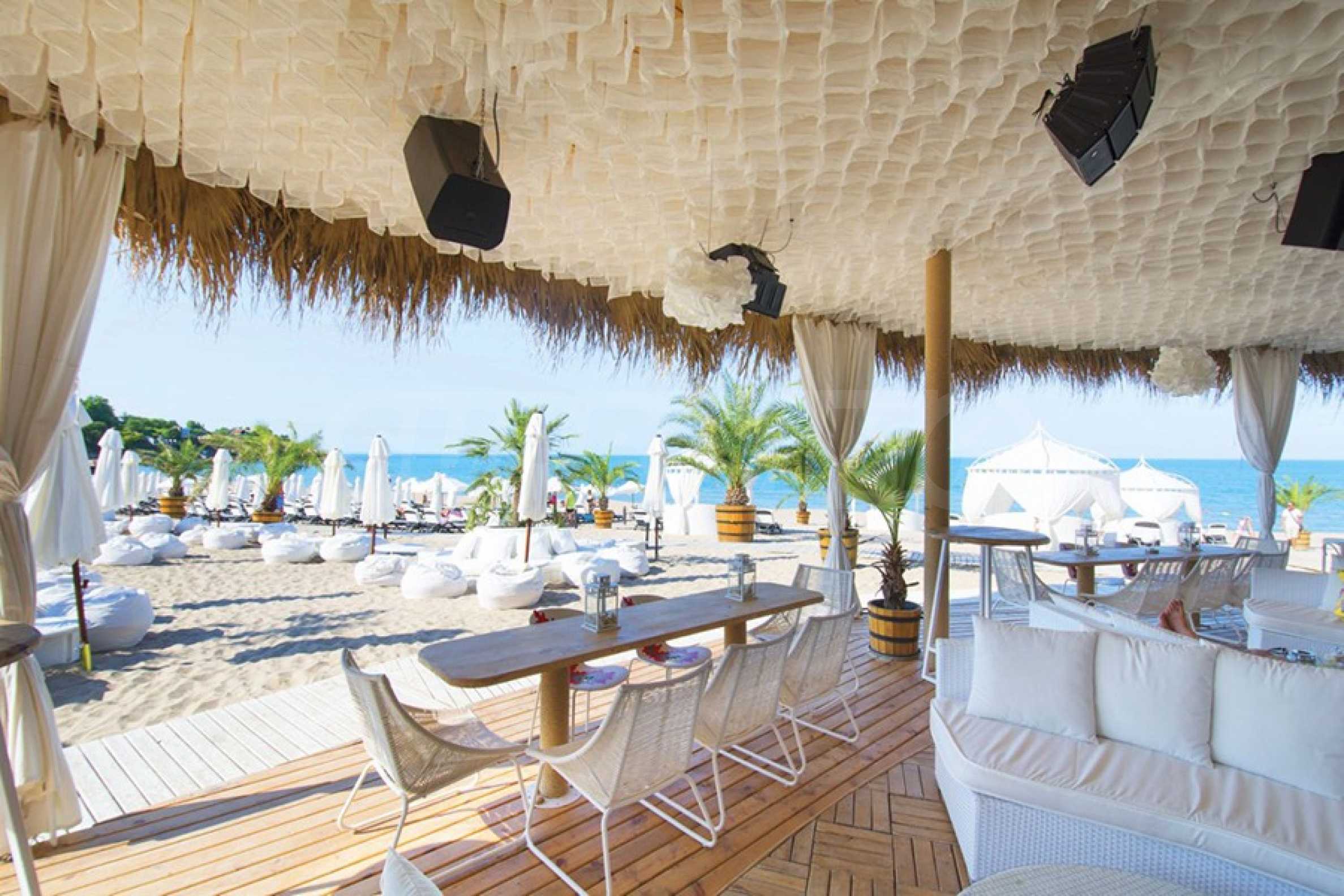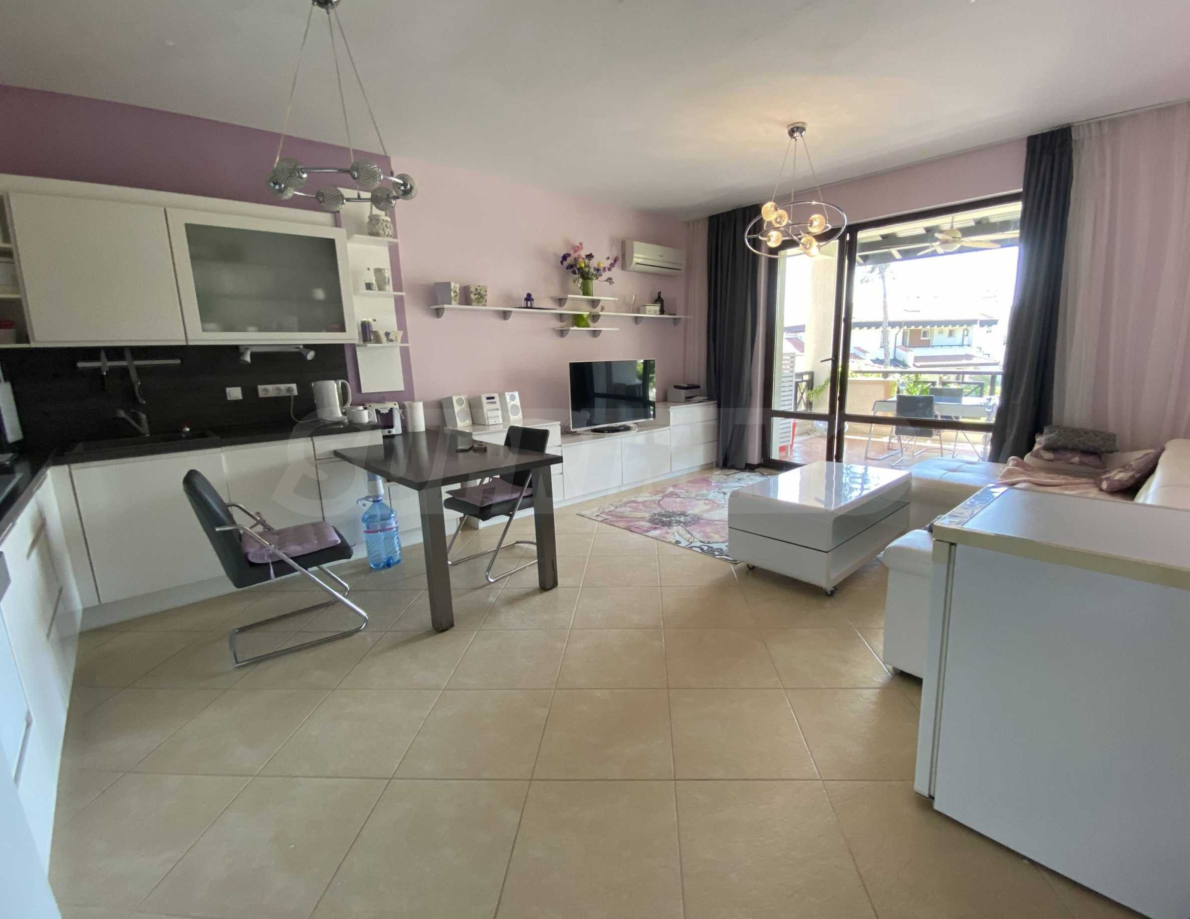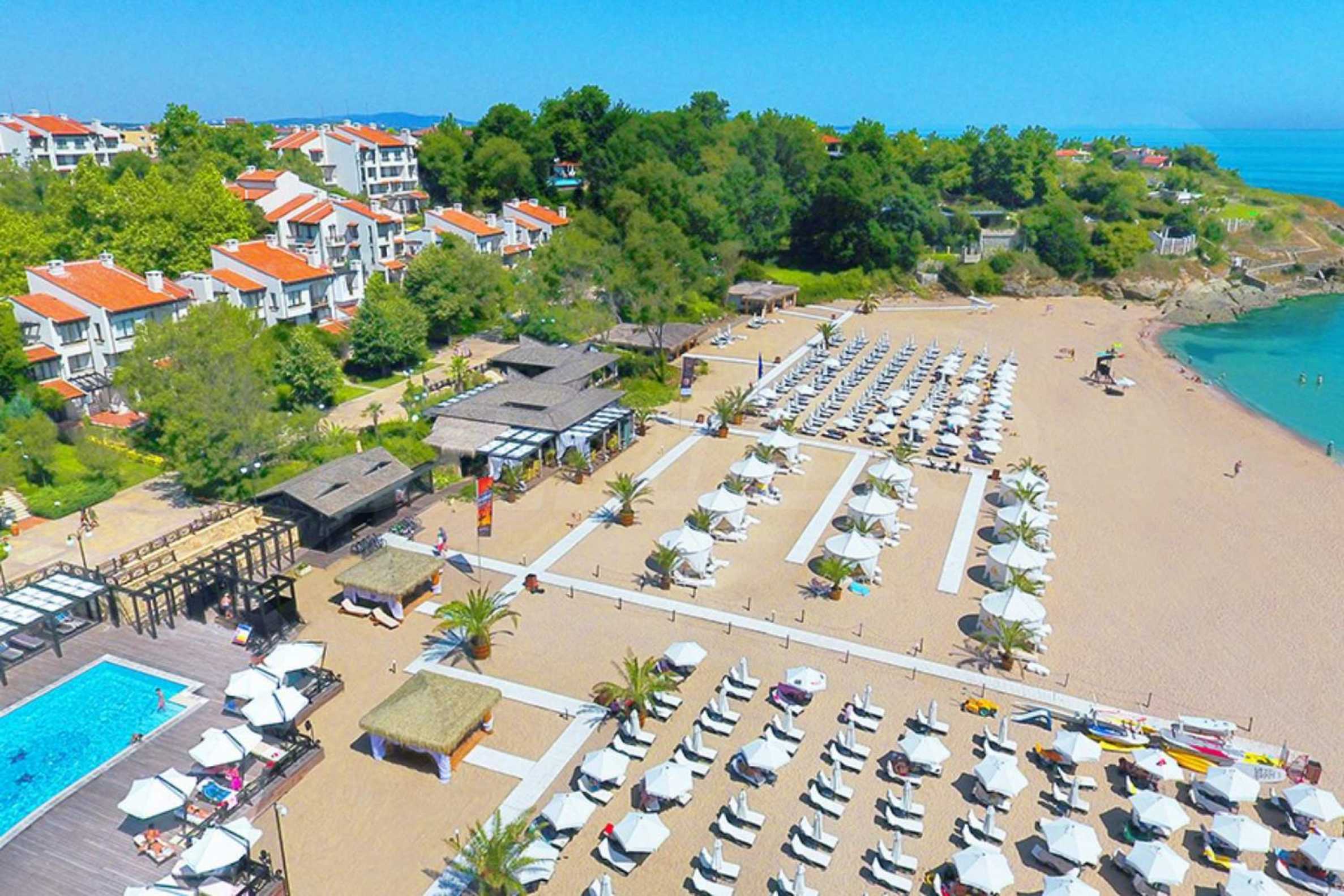 Представляем на продажу комфортабельную меблированную двухкомнатную квартиру площадью 99 кв. м, в престижном прибрежном комплексе на первой линии от моря, рядом с популярным пляжем Оазис на курорте Лозенец.