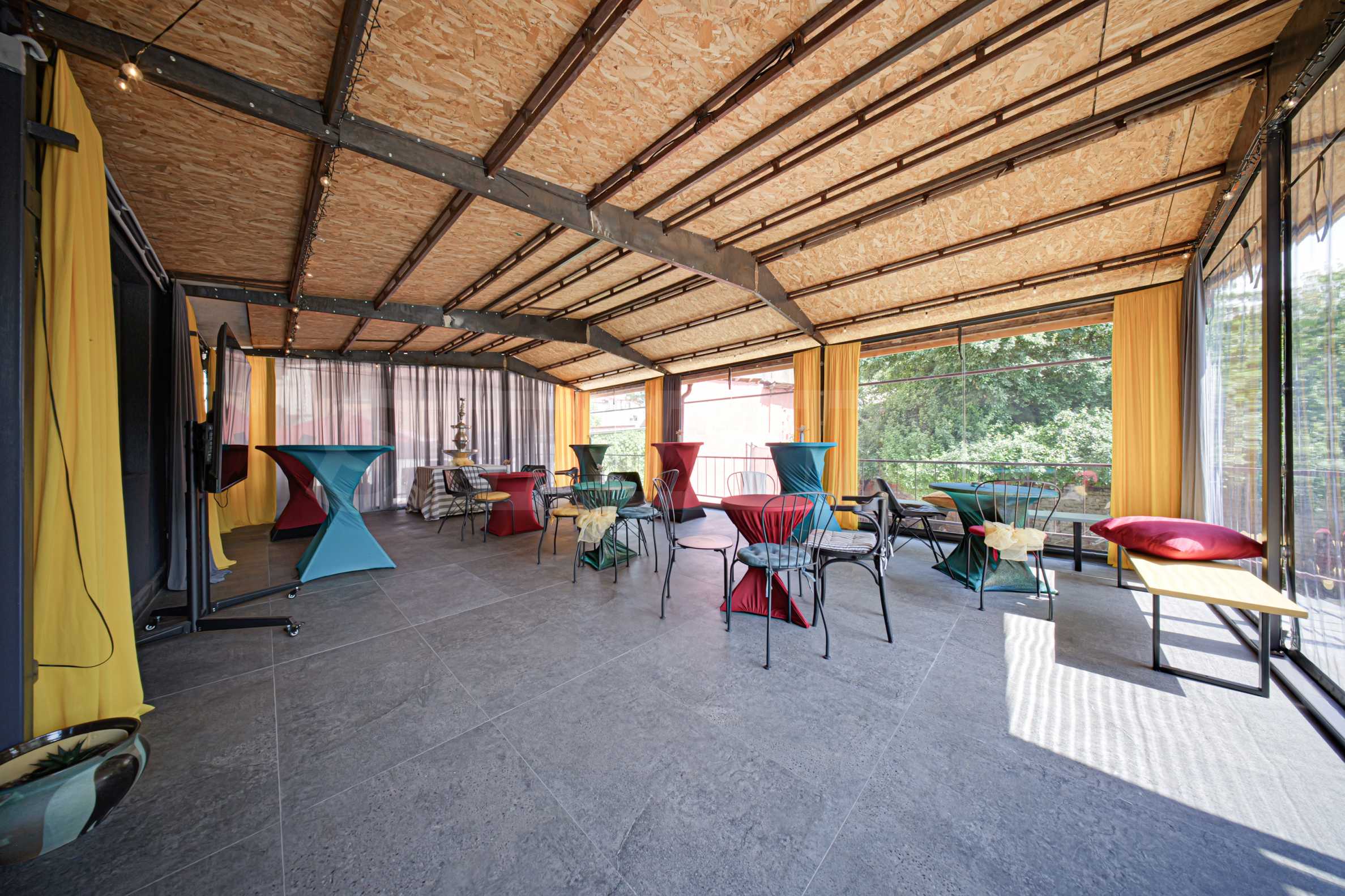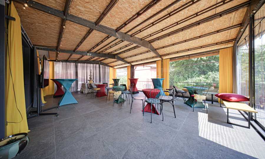 • большая терраса с ветрозащитными шторами, меблированная высокими и низкими столами и стульями,