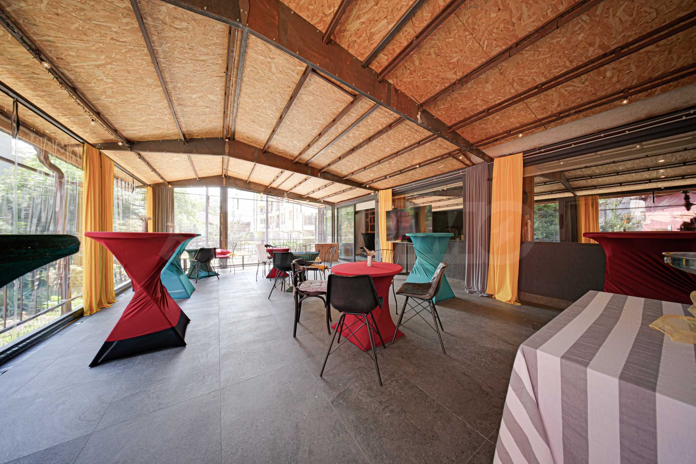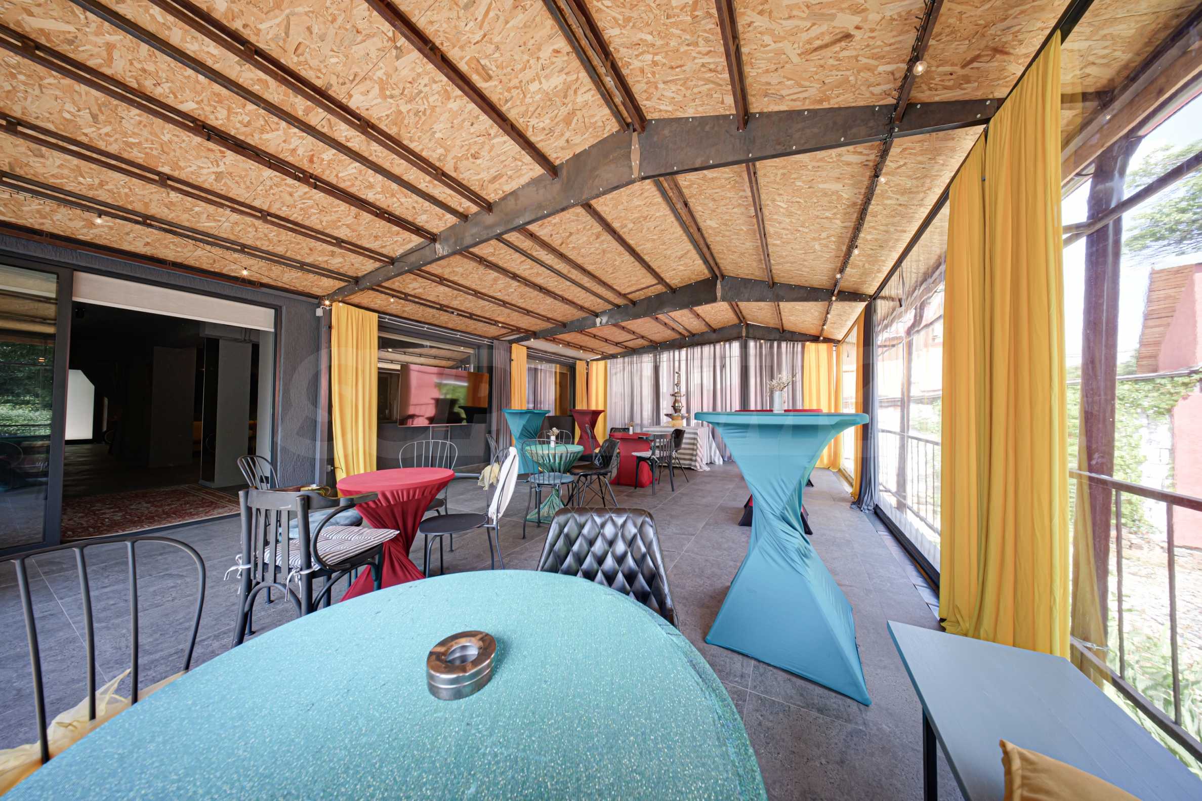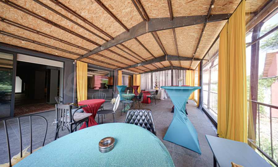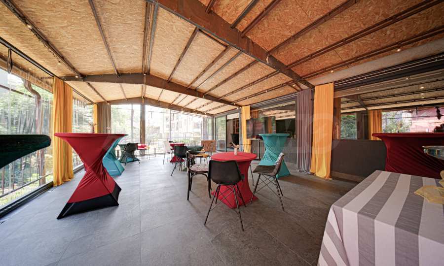 • большая терраса с ветрозащитными шторами, меблированная высокими и низкими столами и стульями,
