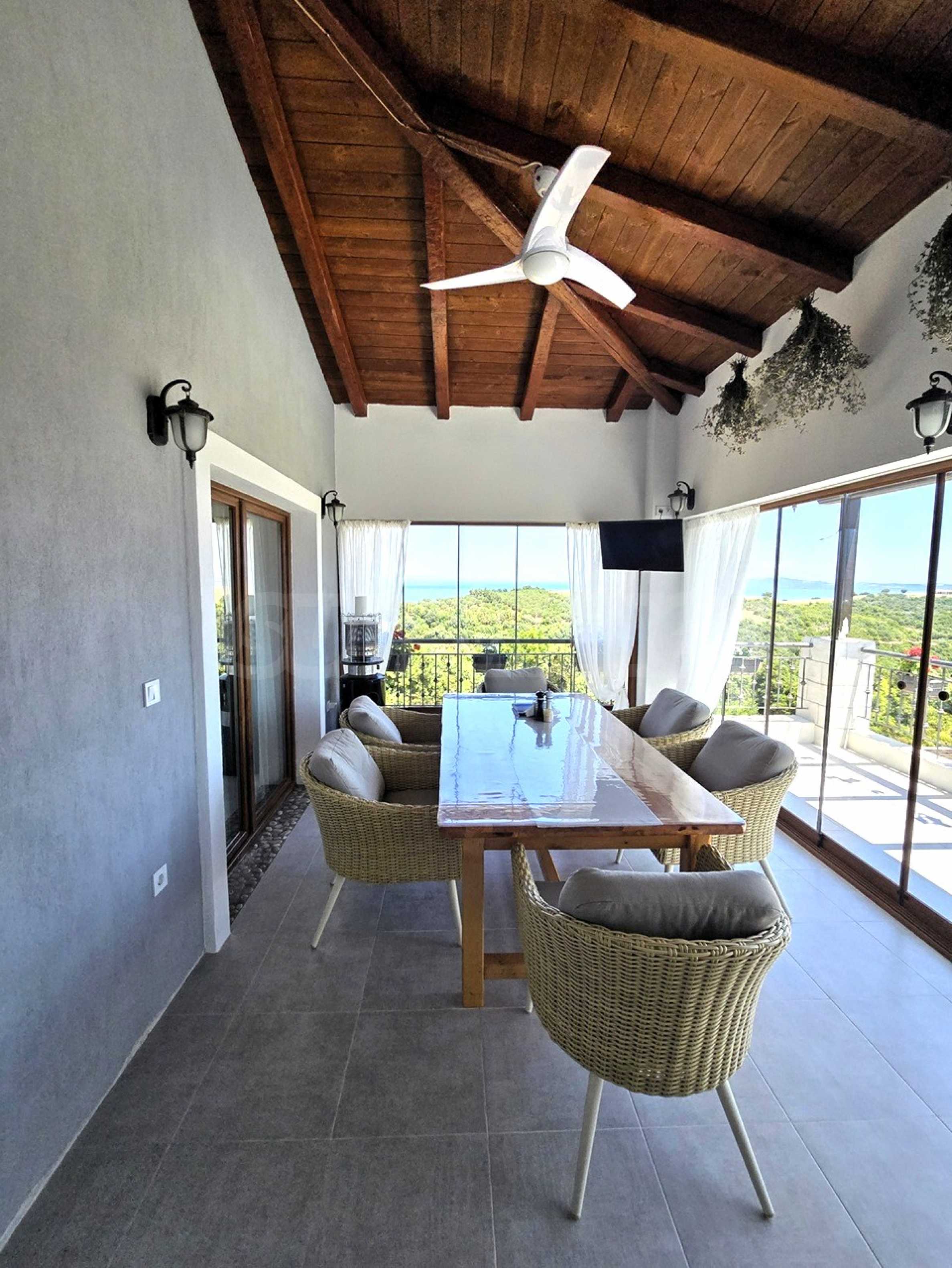 Крытые террасы с беседками и зонами отдыха с видом на море и горы.
