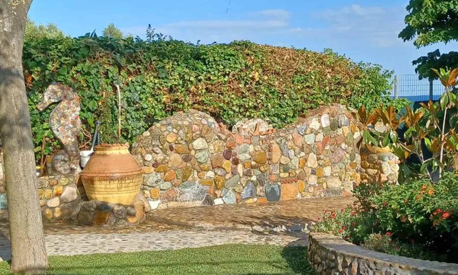 Сад искусно вымощен морской галькой и богато украшен деревьями, цветами и произведениями искусства ручной работы из пляжной гальки, которые придают объекту недвижимости уникальный и по-настоящему неповторимый характер.