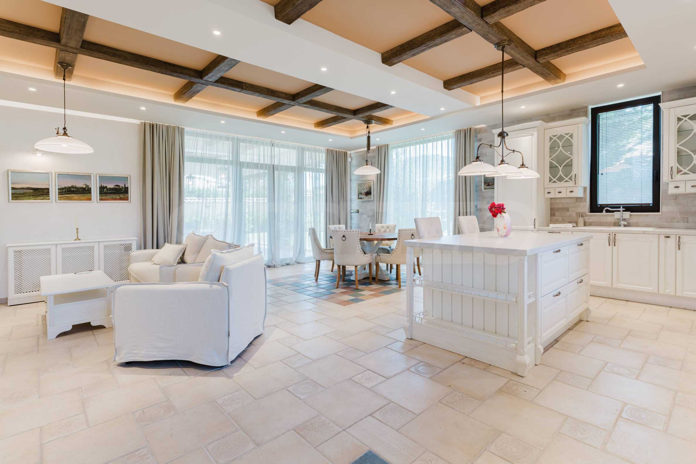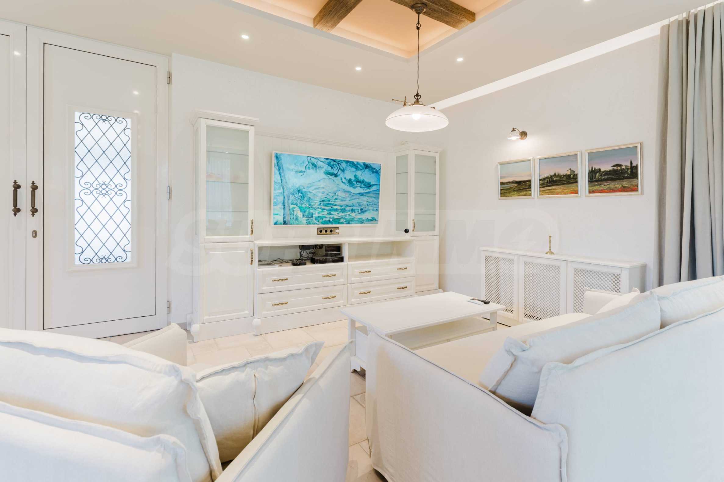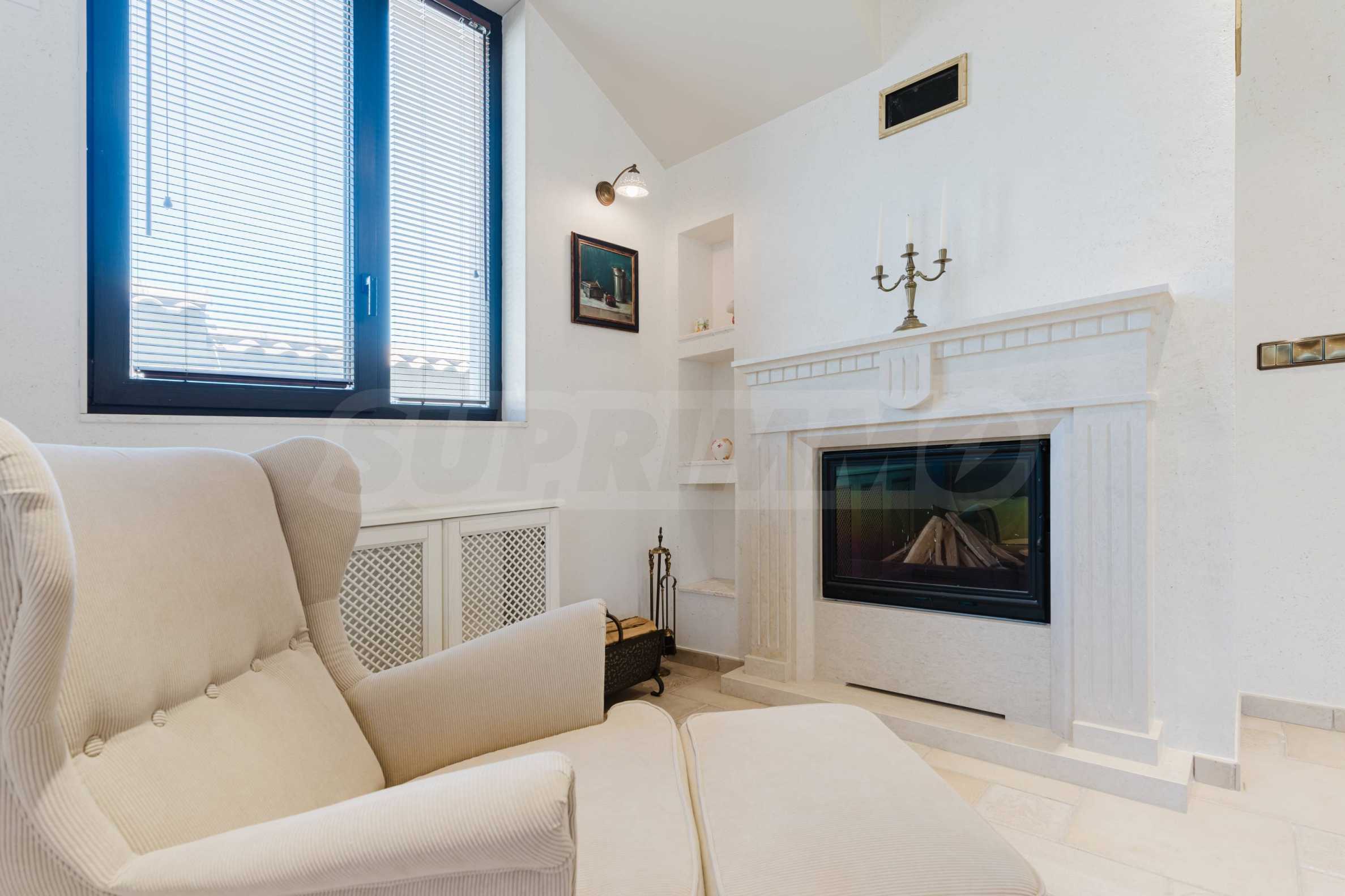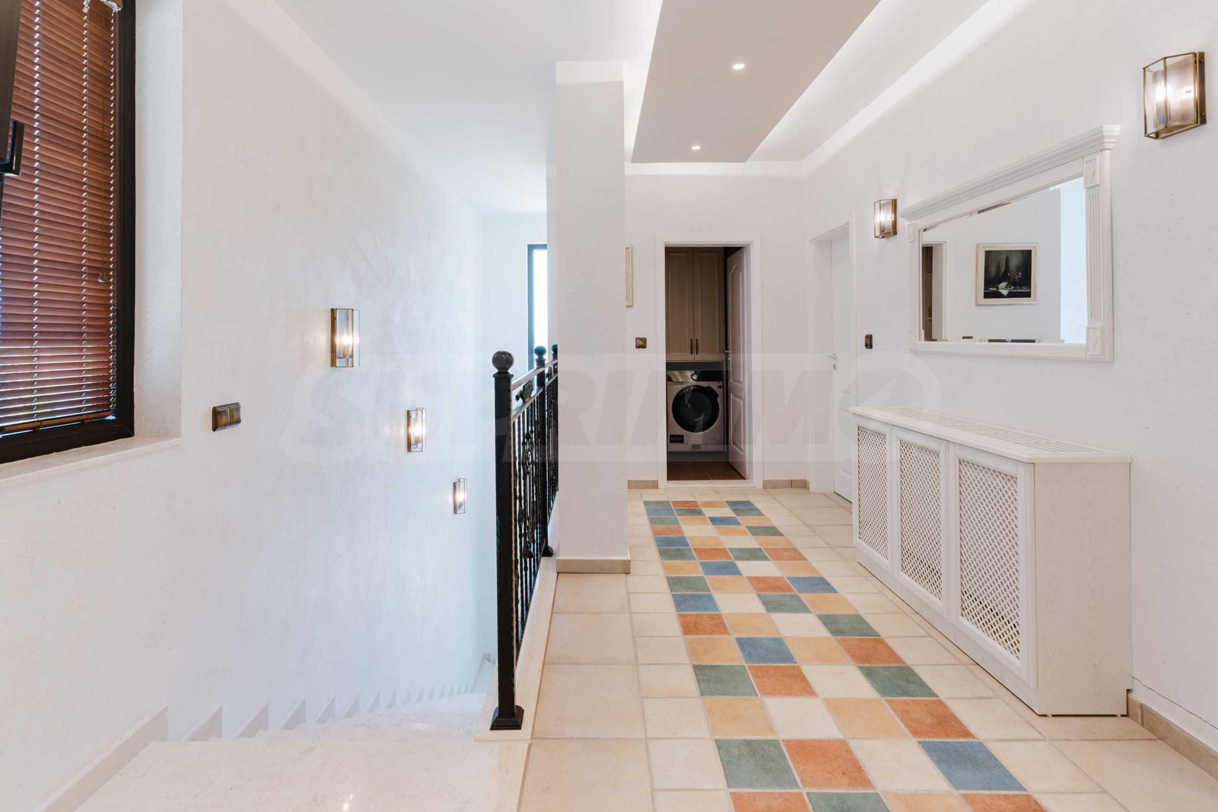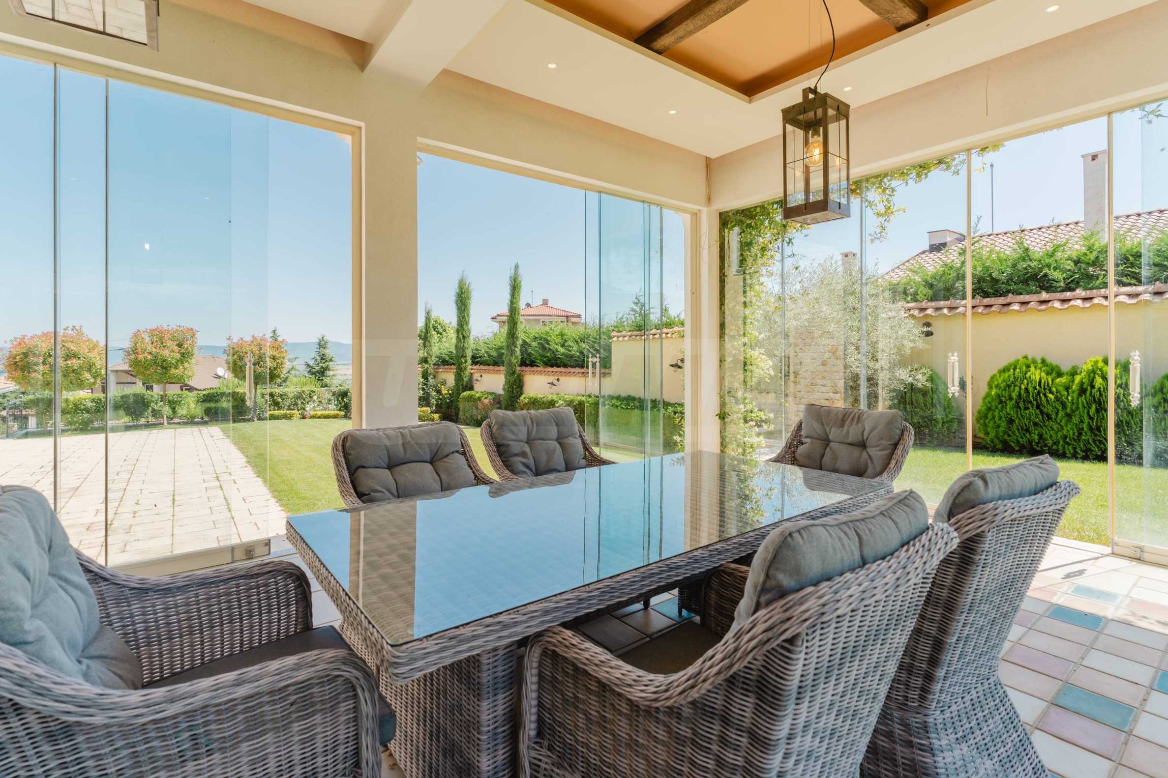 Эта вилла впечатляет своим элегантным дизайном, вдохновленным средиземноморской архитектурой, в сочетании с элементами традиций болгарского Возрождения. Она сочетает в себе роскошь, комфорт и современные технологии.