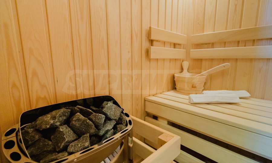 • первый уровень: прихожая, просторная гостиная с камином, кухня и столовая, ванная комната с туалетом, сауна, подсобное помещение с бойлером на 300 л и тепловым насосом, веранда с ротанговой меблировкую;