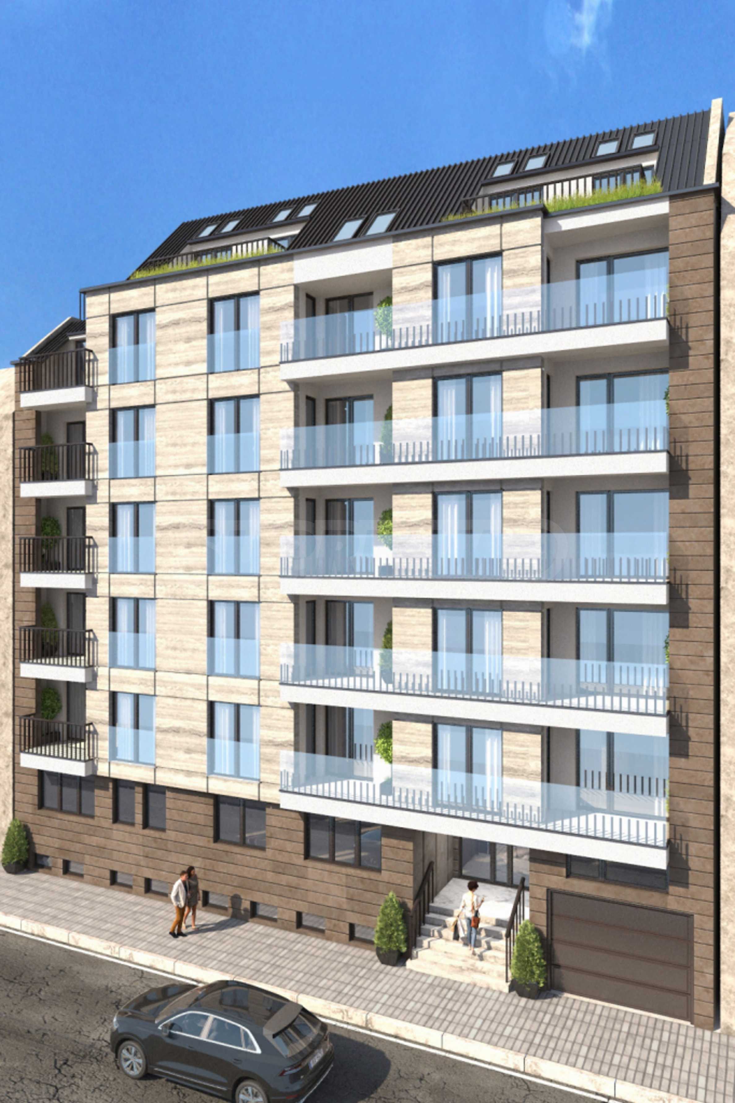 Здание имеет привлекательный фасад с современным дизайном и предлагает высокое качество исполнения. Фасад отличается элегантной архитектурой, сочетанием натуральных материалов, современными террасами со стеклянными перилами и оптимально спланированным пространством.