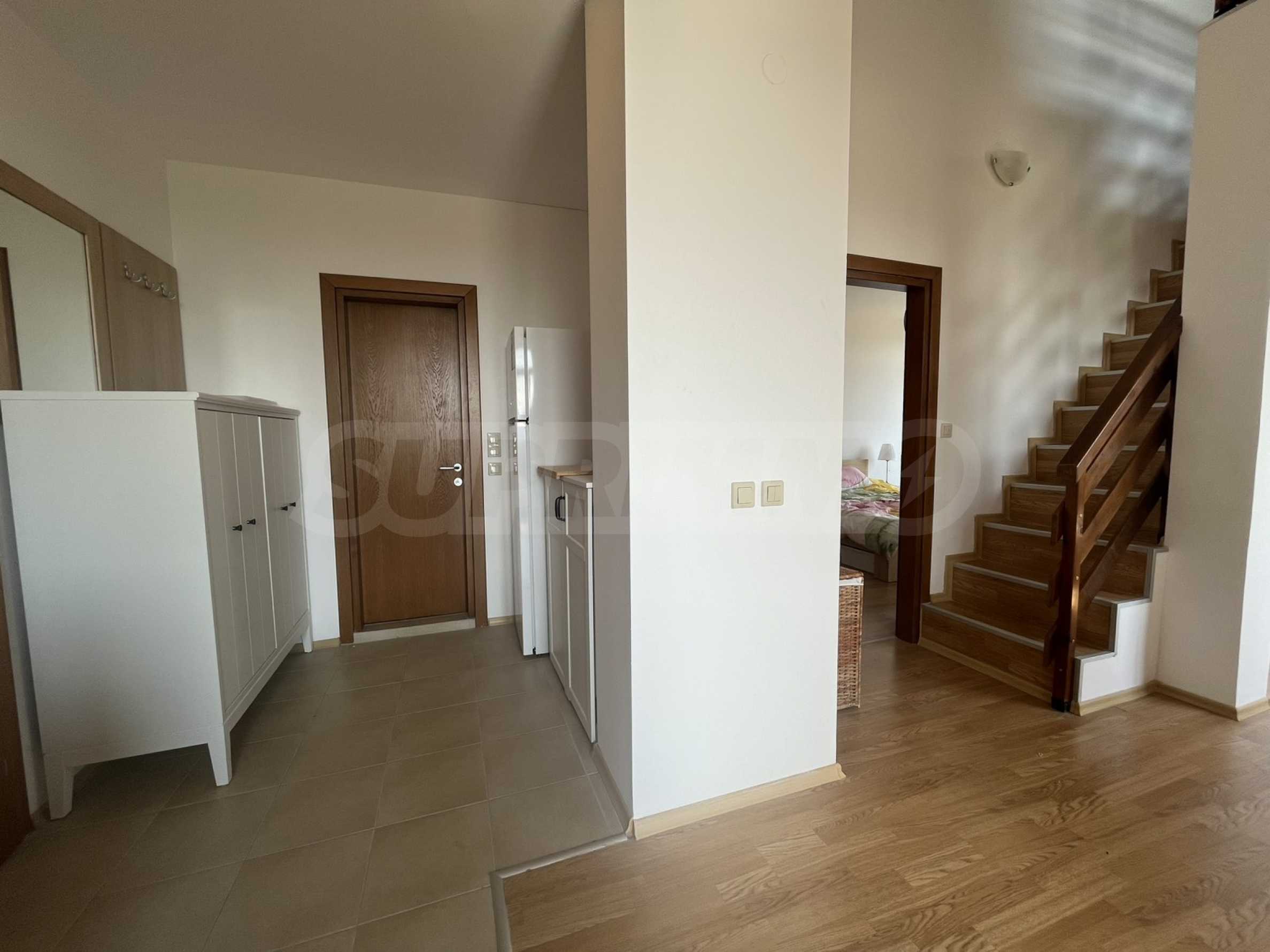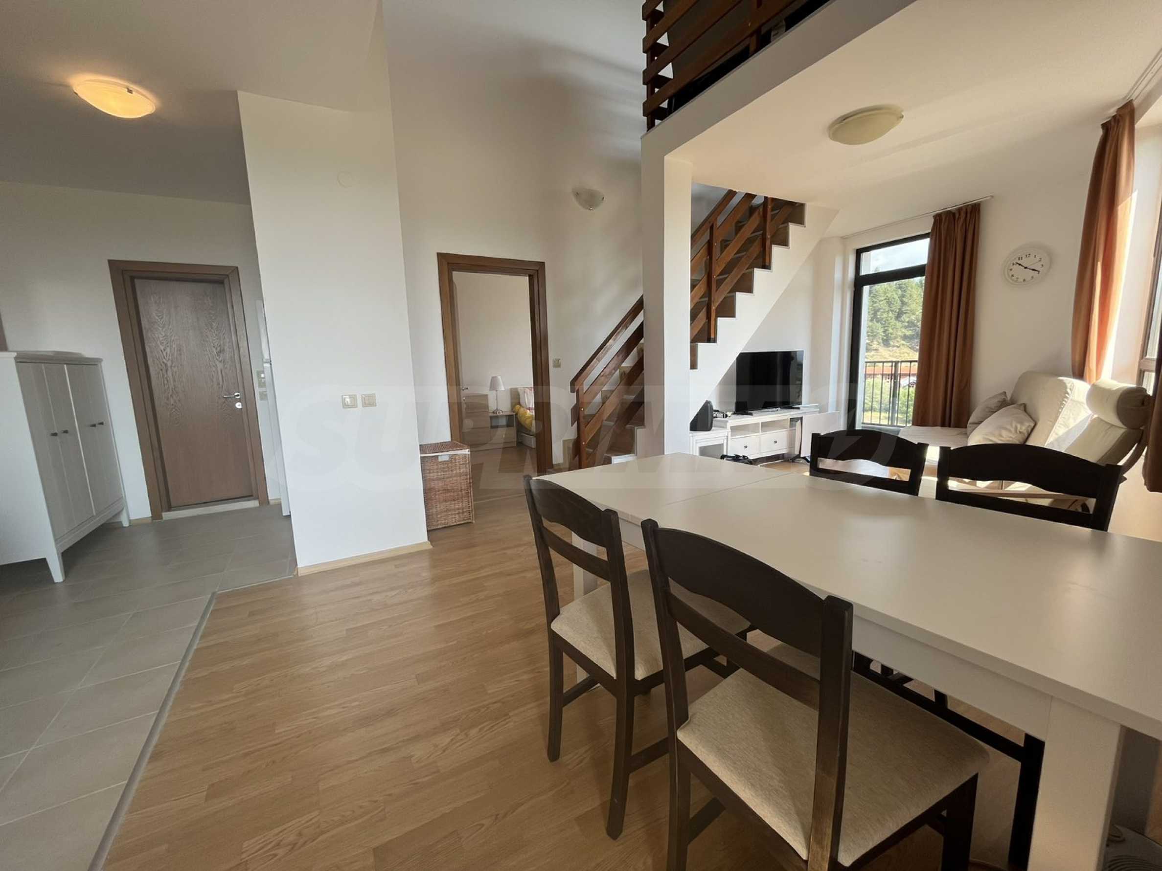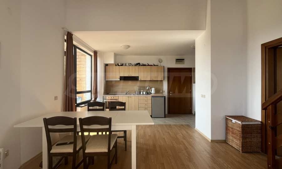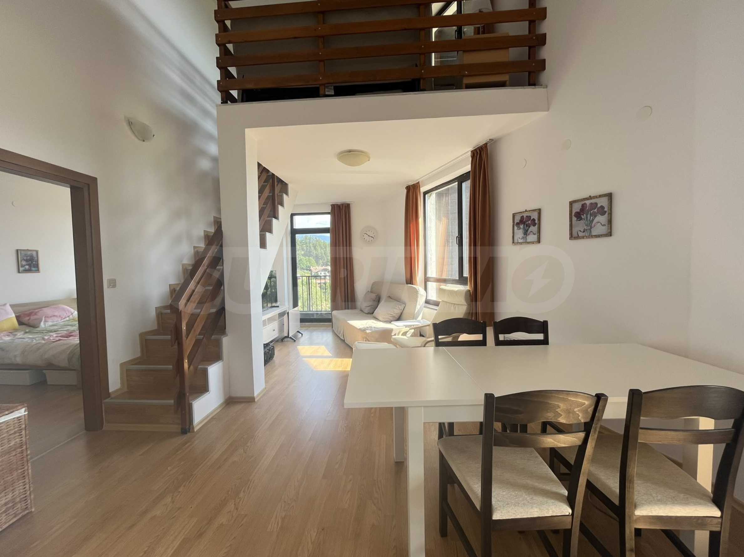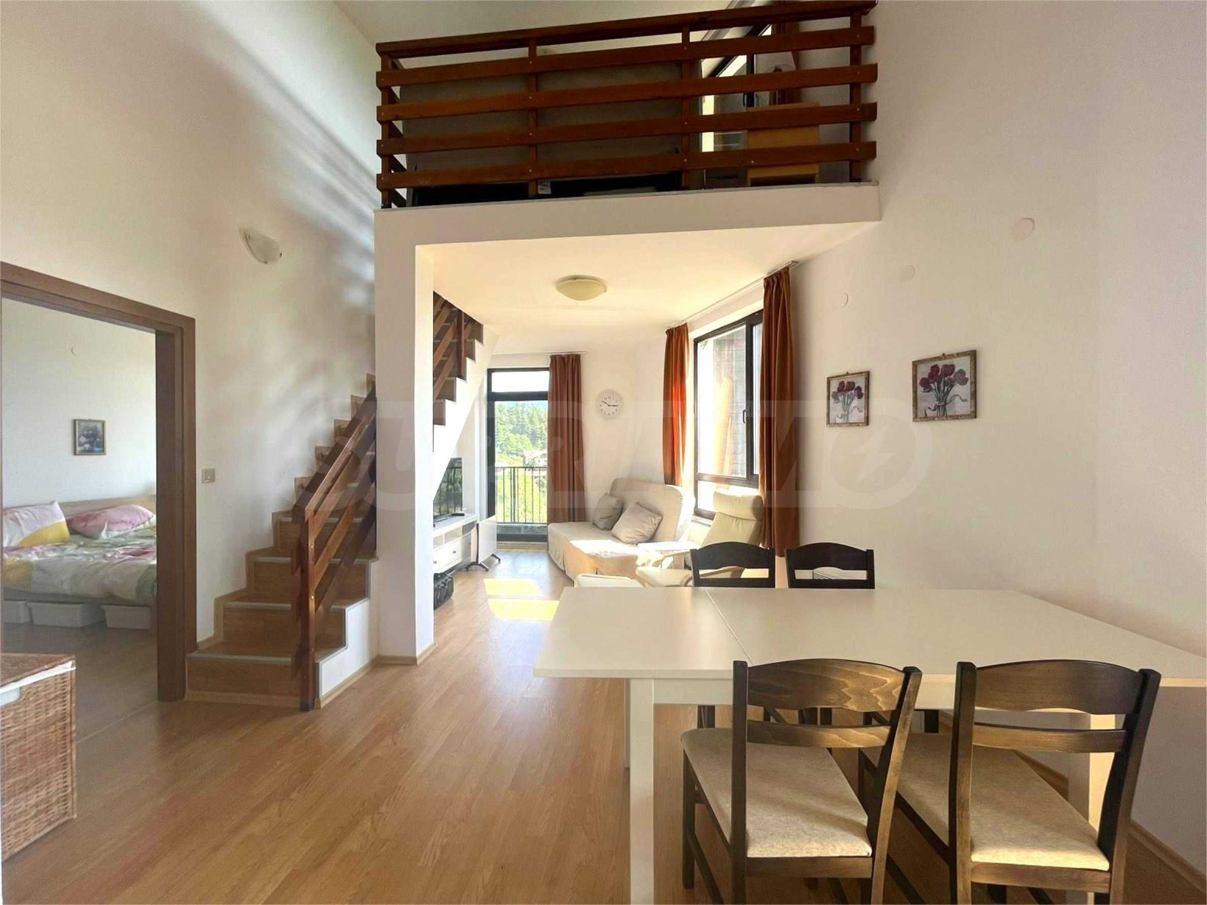 Представляем вашему вниманию просторный и полностью меблированный двухуровневый пентхаус в закрытом жилом комплексе Aspen Valley, расположенном между городами Разлог и Банско, всего в 10 минутах езды от горнолыжного подъемника.