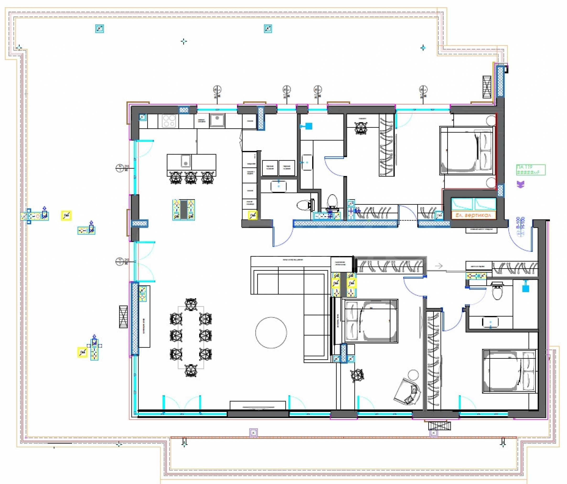 Квартира представляет собой открытое пространство Open Space, позволяющее гибко планировать её в соответствии с потребностями будущего владельца. Проект предусматривает три отдельные спальни (каждая около 18 кв. м), просторную гостиную с кухонной зоной (около 50 кв. м), три ванные комнаты, кладовую и газовое помещение.