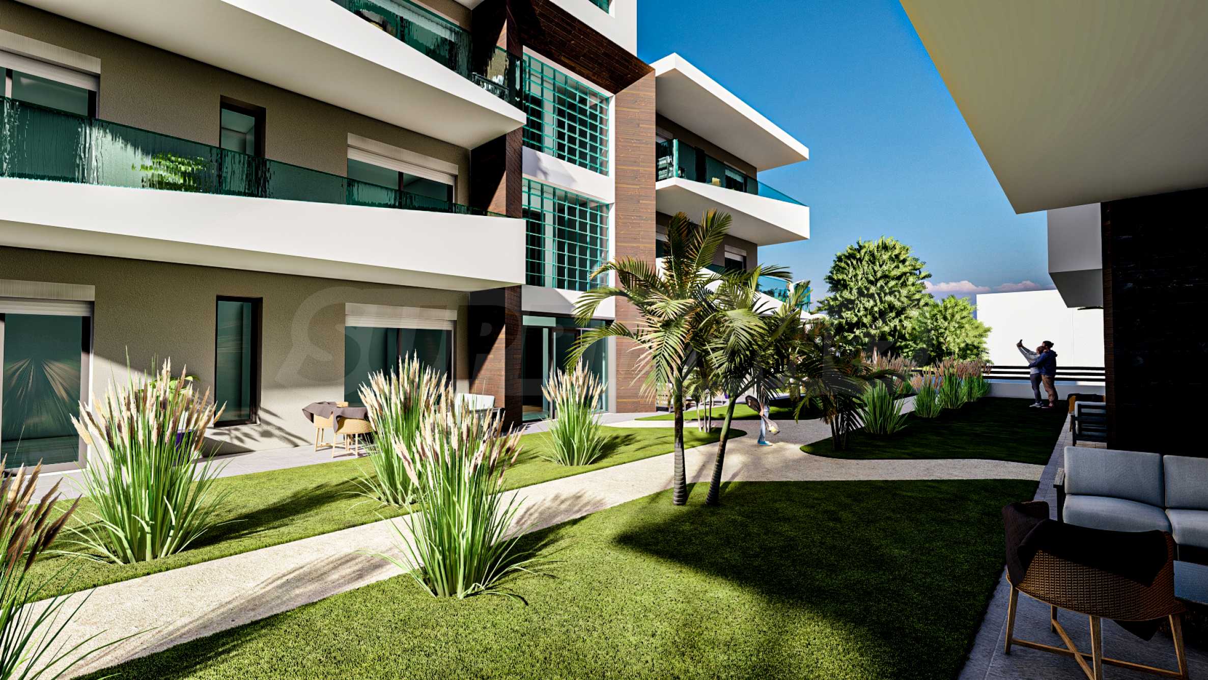 Дизайн прилегающей территории, где преобладают зеленые газоны, гармонично вписывает комплекс в природную среду местности, создавая идеальную атмосферу для бесчисленных моментов удовольствия и релаксации.