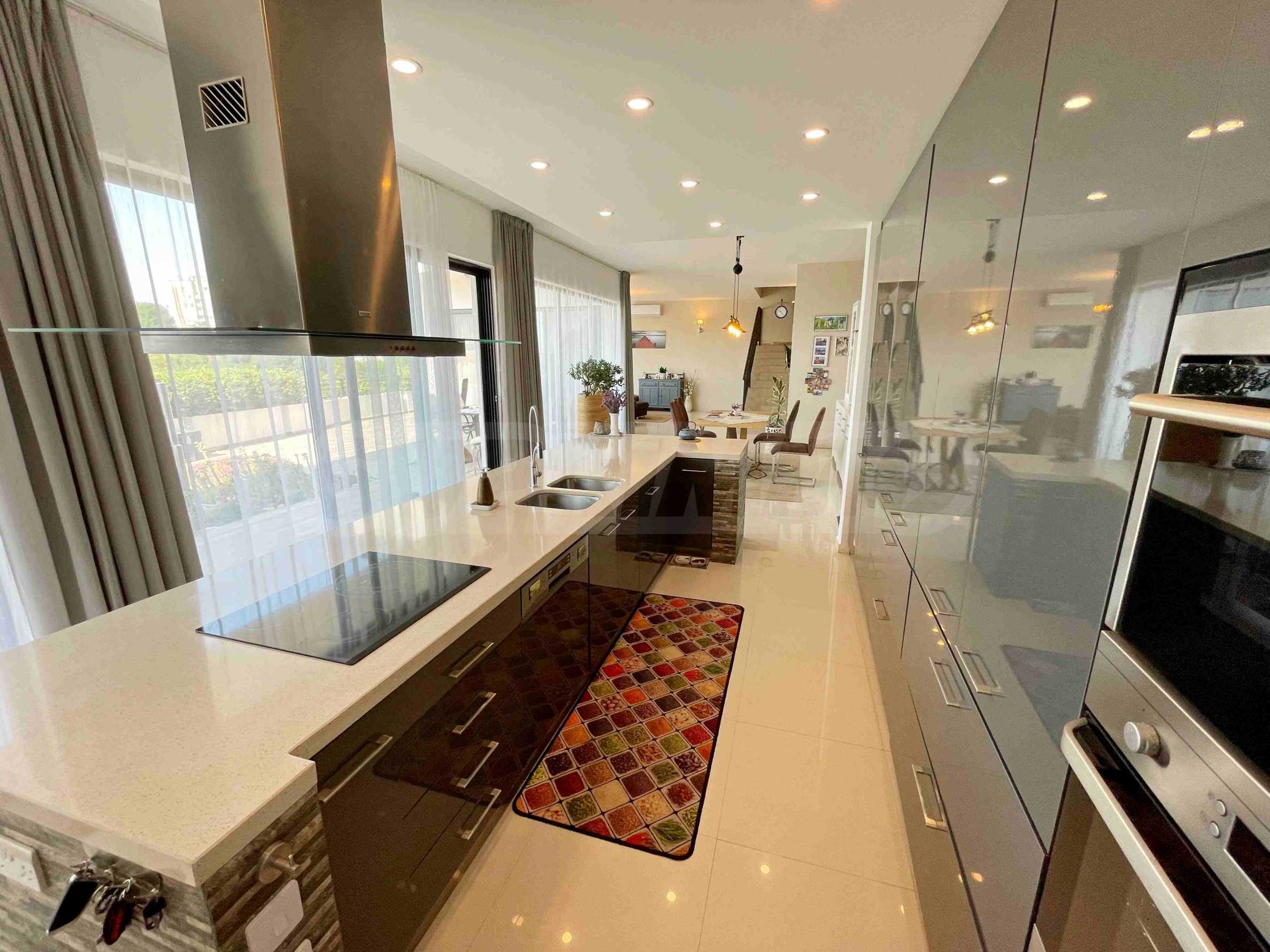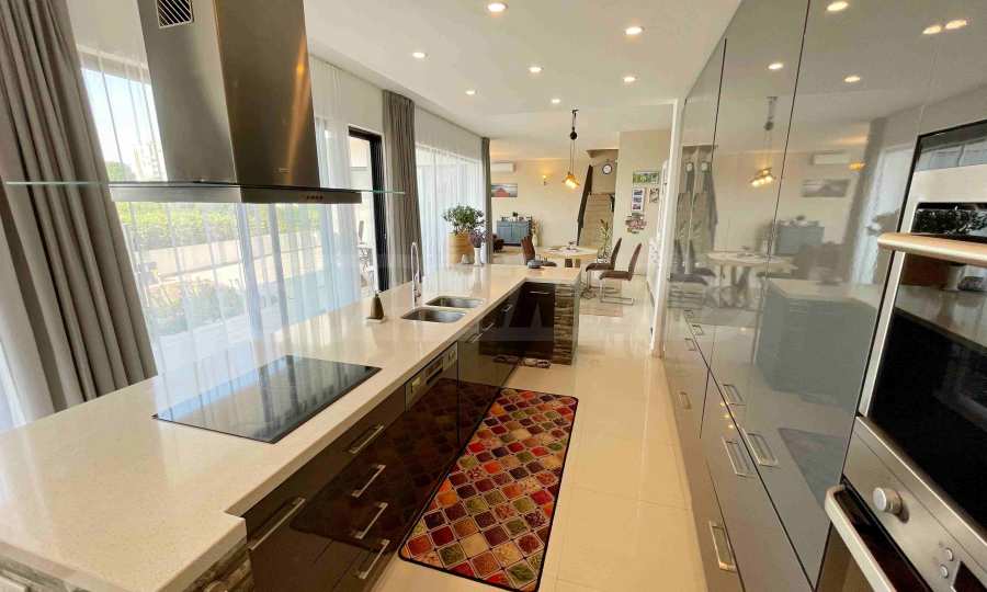 • первый этаж — просторная гостиная открытой планировки со столовой и кухонной зоной, с гранитной столешницей и качественной бытовой техникой. Из просторной гостиной есть выход на большую веранду, откуда открывается захватывающий панорамный вид на Чёрное море. На этом же этаже расположены кладовая, прачечная и туалет;