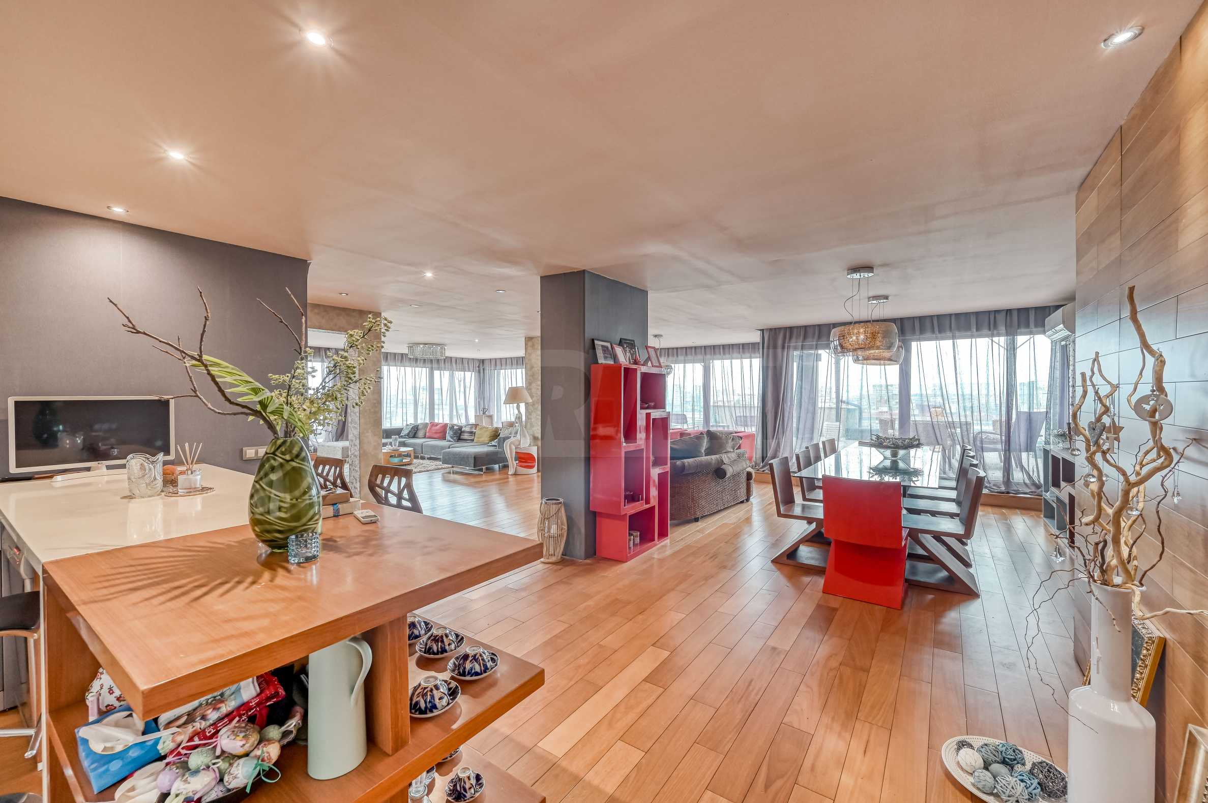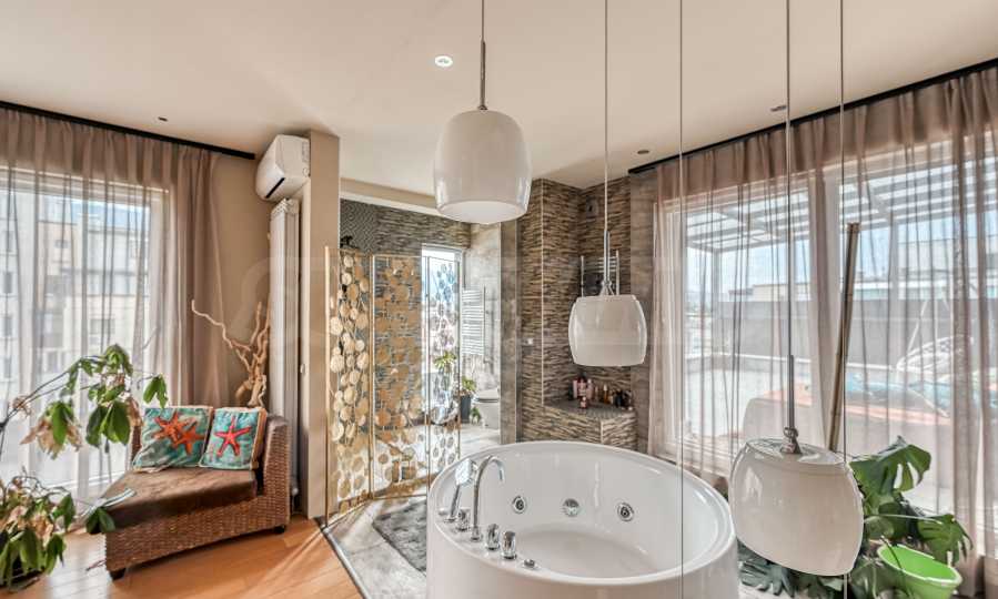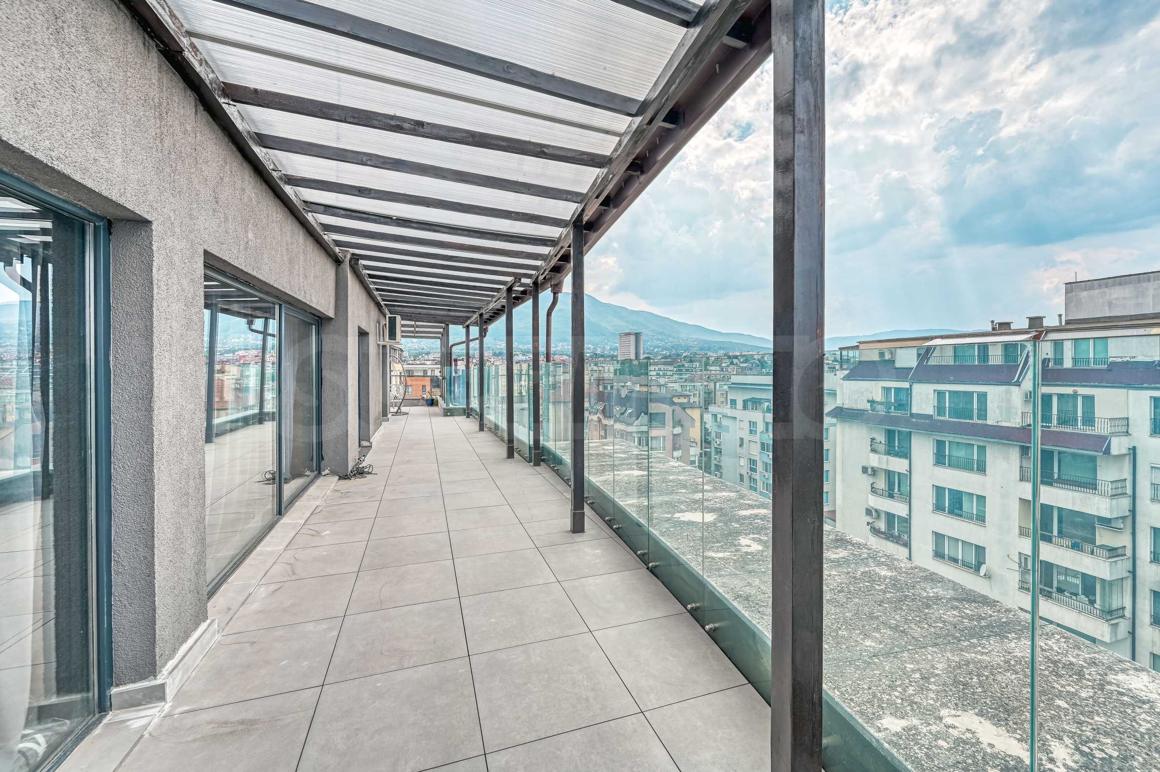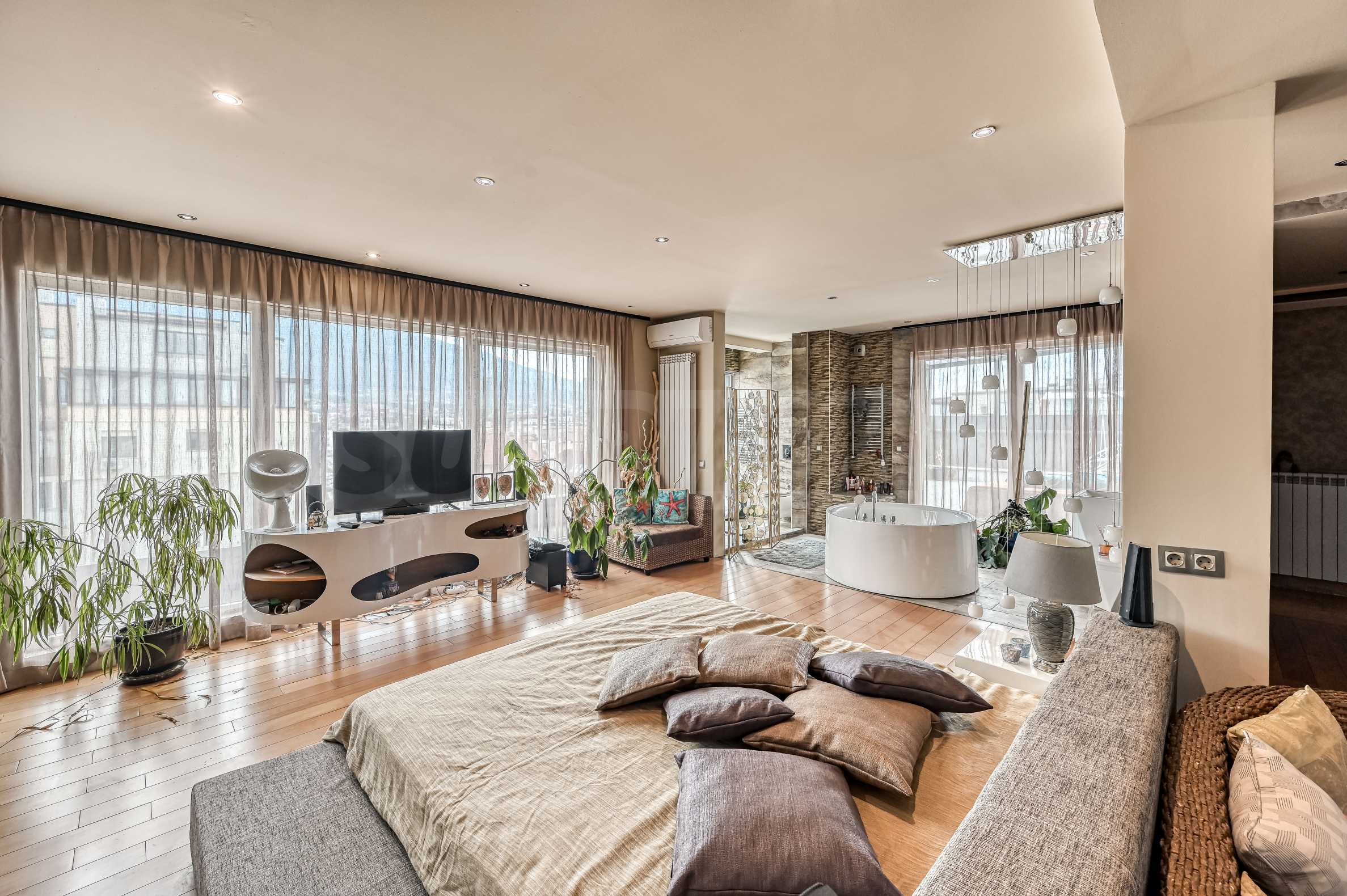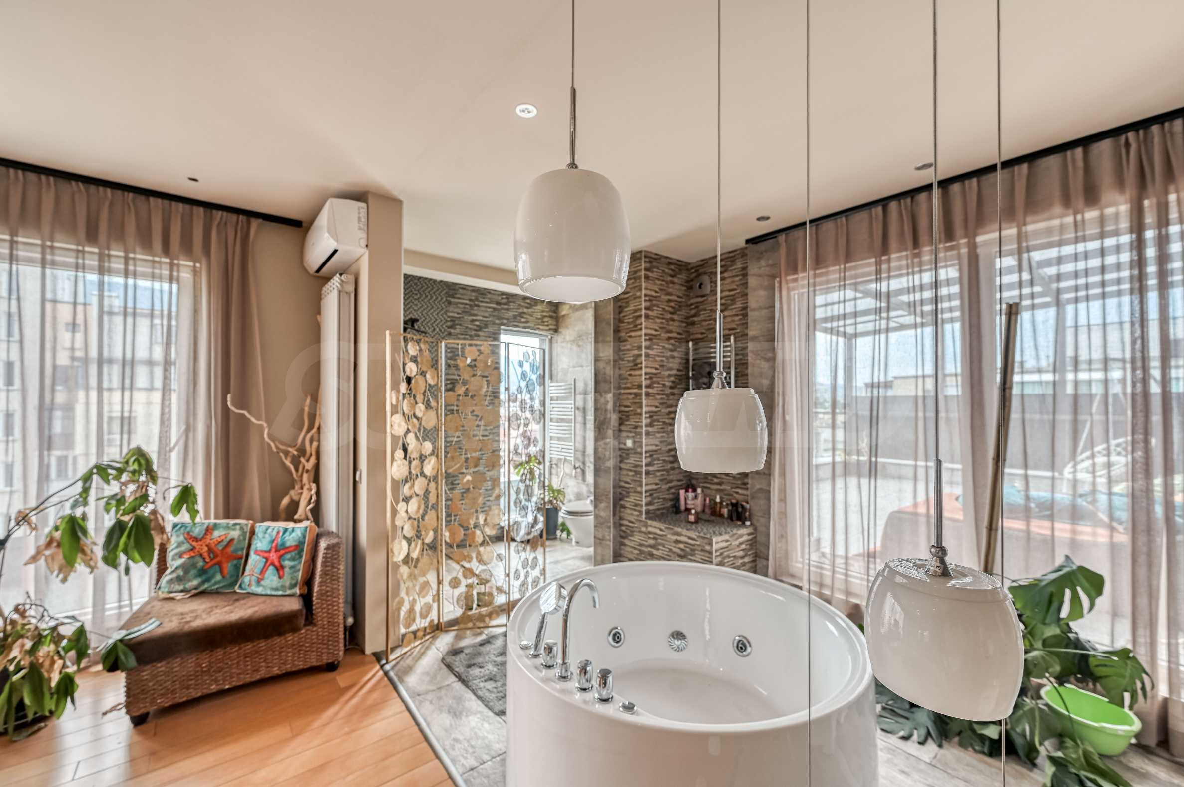 Представляем вам пентхаус на последнем этаже здания с исключительным панорамным видом, изысканным дизайном и впечатляющей террасой на крыше, расположенный в престижном месте на бульваре Тодора Каблешкова, рядом с торговым центром «Болгария». Квартира обставлена дизайнерской меблировкую высокого класса. Лифт ведет прямо в квартиру.