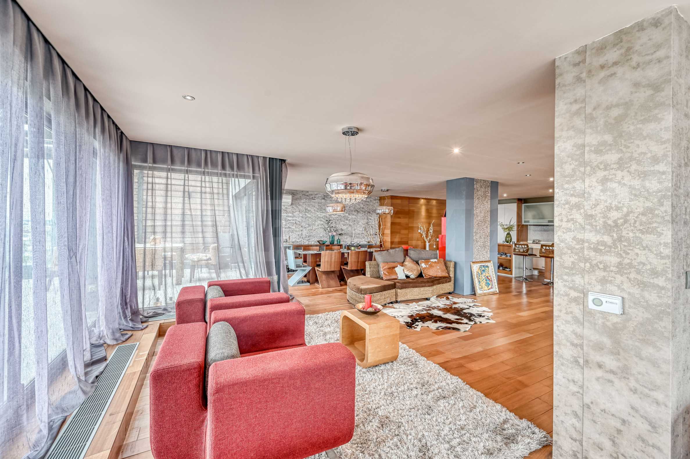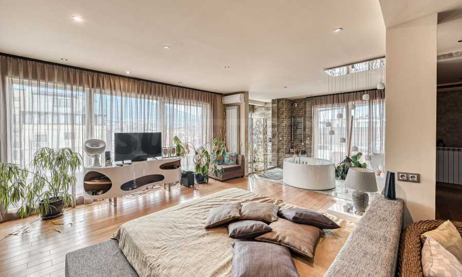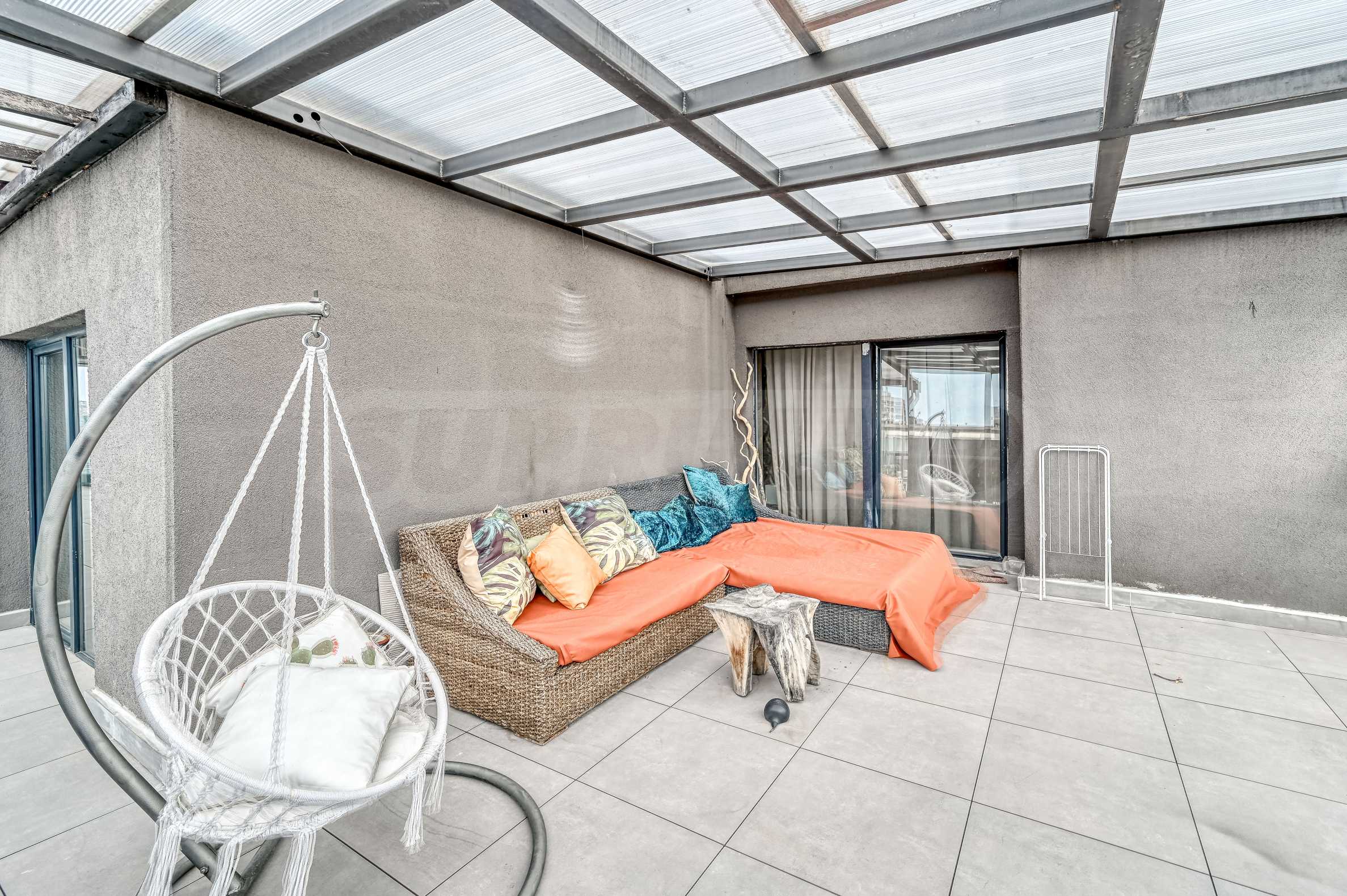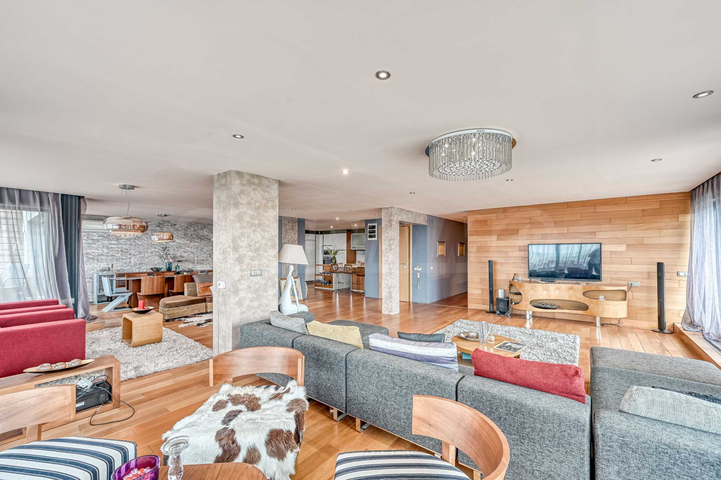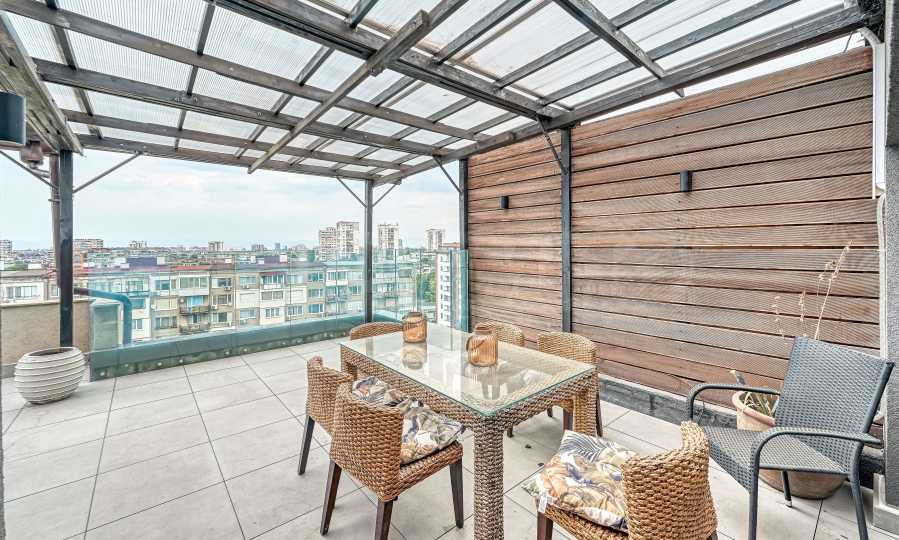Представляем вам пентхаус на последнем этаже здания с исключительным панорамным видом, изысканным дизайном и впечатляющей террасой на крыше, расположенный в престижном месте на бульваре Тодора Каблешкова, рядом с торговым центром «Болгария». Квартира обставлена дизайнерской меблировкую высокого класса. Лифт ведет прямо в квартиру.