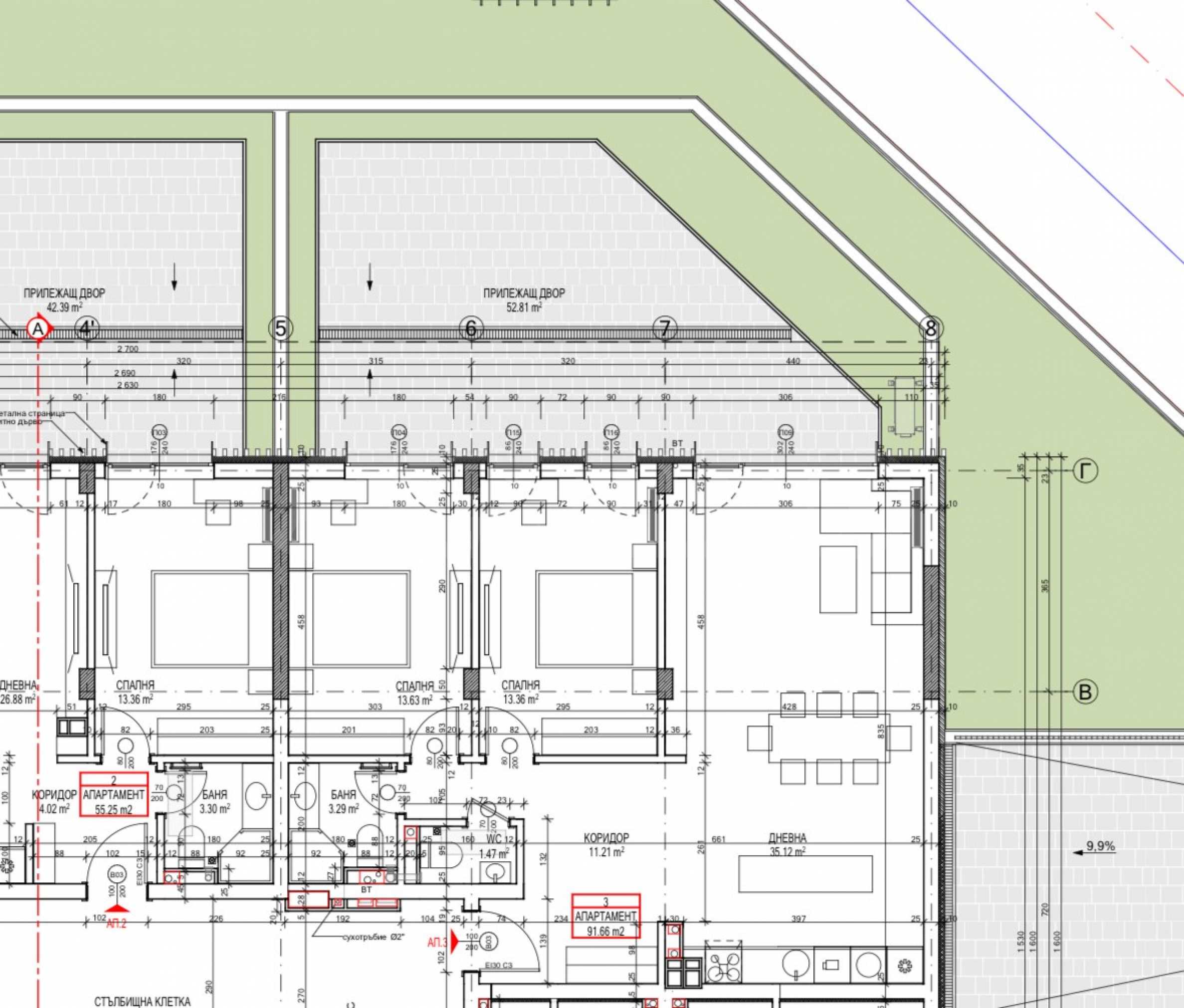 Квартира расположена на первом этаже и имеет общую площадь 91,66 кв. м. Планировка включает просторную гостиную с кухней, две отдельные спальни, ванную комнату с туалетом, отдельный туалет, просторную прихожую и террасу с прекрасным видом на гору Витоша. В квартире имеется подвал. Окна выходят на юго-запад, что обеспечивает обилие естественного света в течение всего дня.