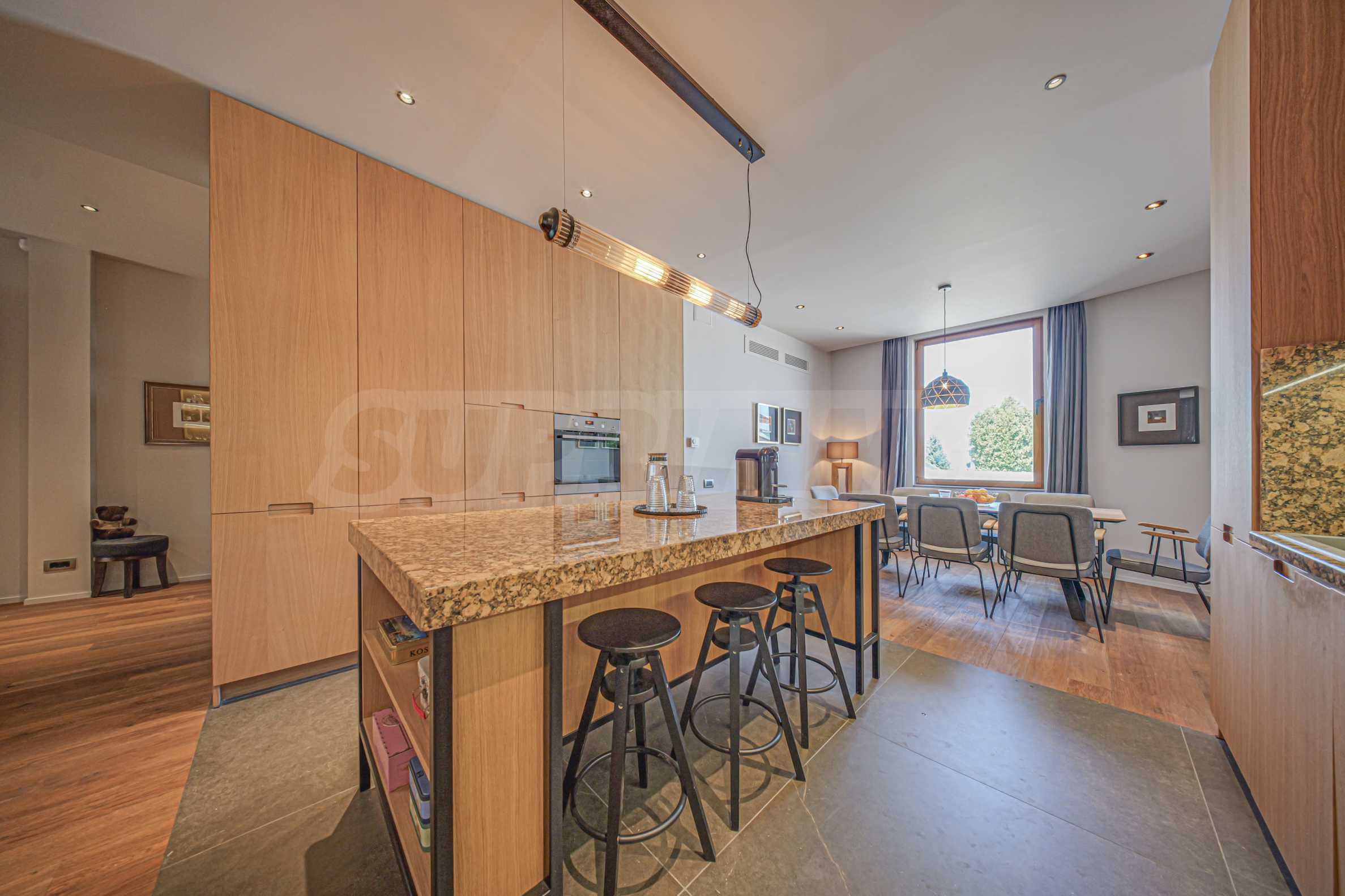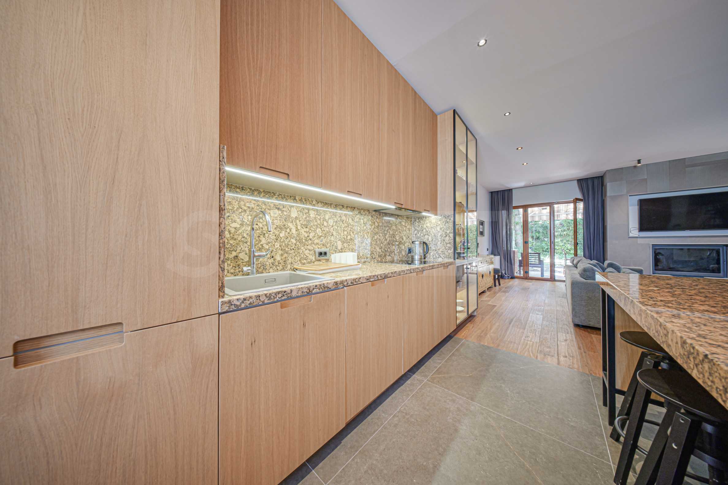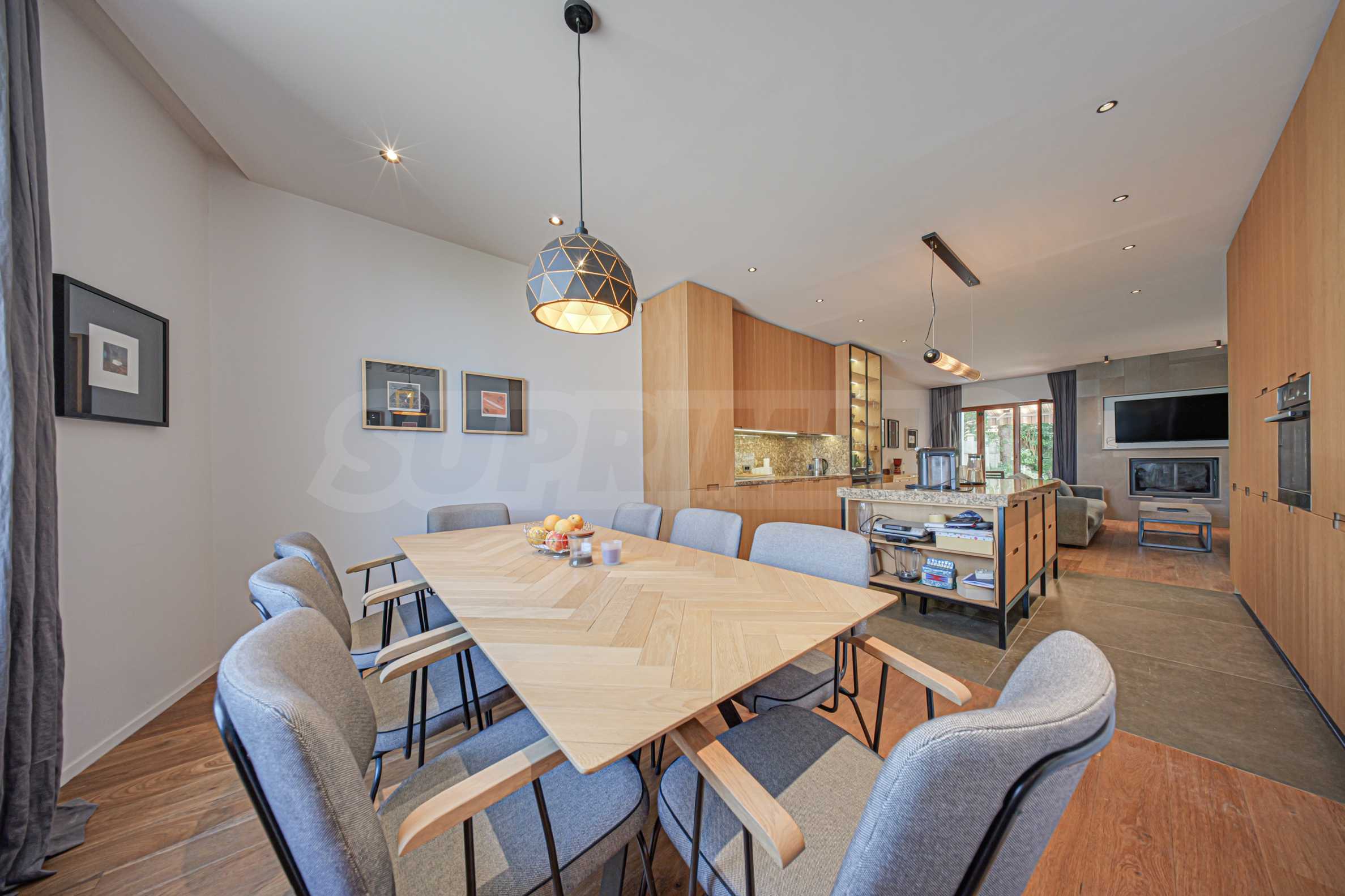 Кухня полностью оборудована высококачественной бытовой техникой, а гостиная зона дополнена дровяным камином, который привносит дополнительную мягкость и уют.