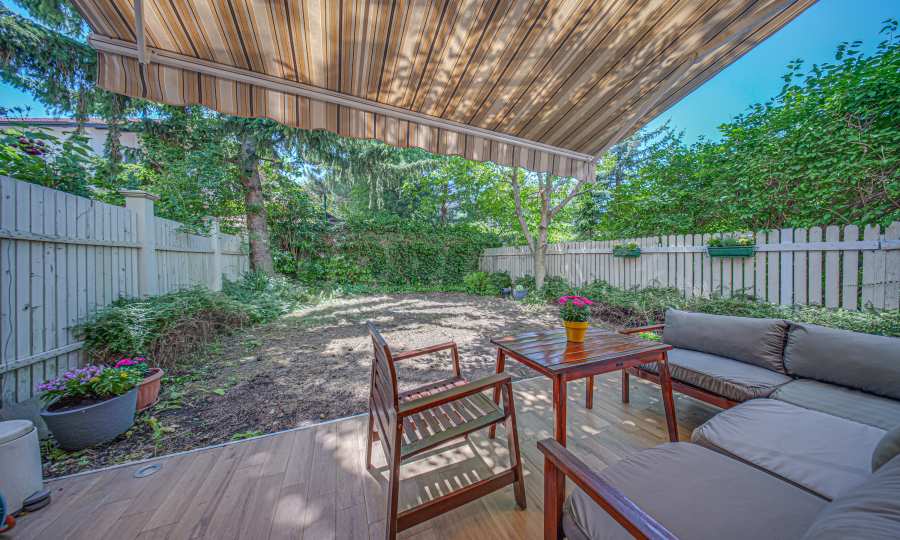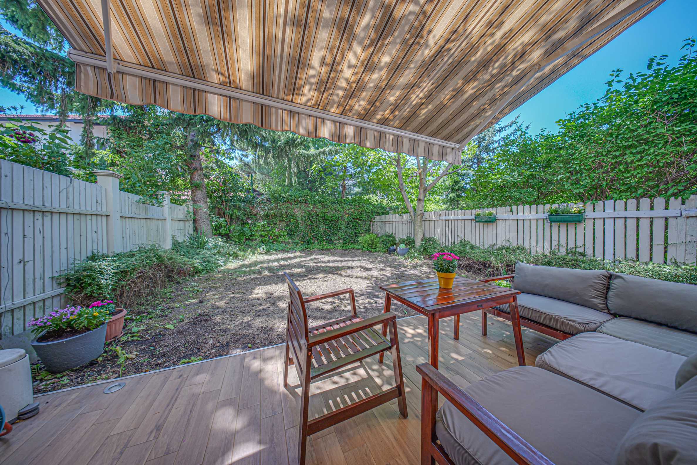 Пространство плавно переходит в крытую веранду и тихий двор , затененный высокими соснами и ореховыми деревьями — идеальное место для утреннего кофе или тихих вечеров на свежем воздухе.