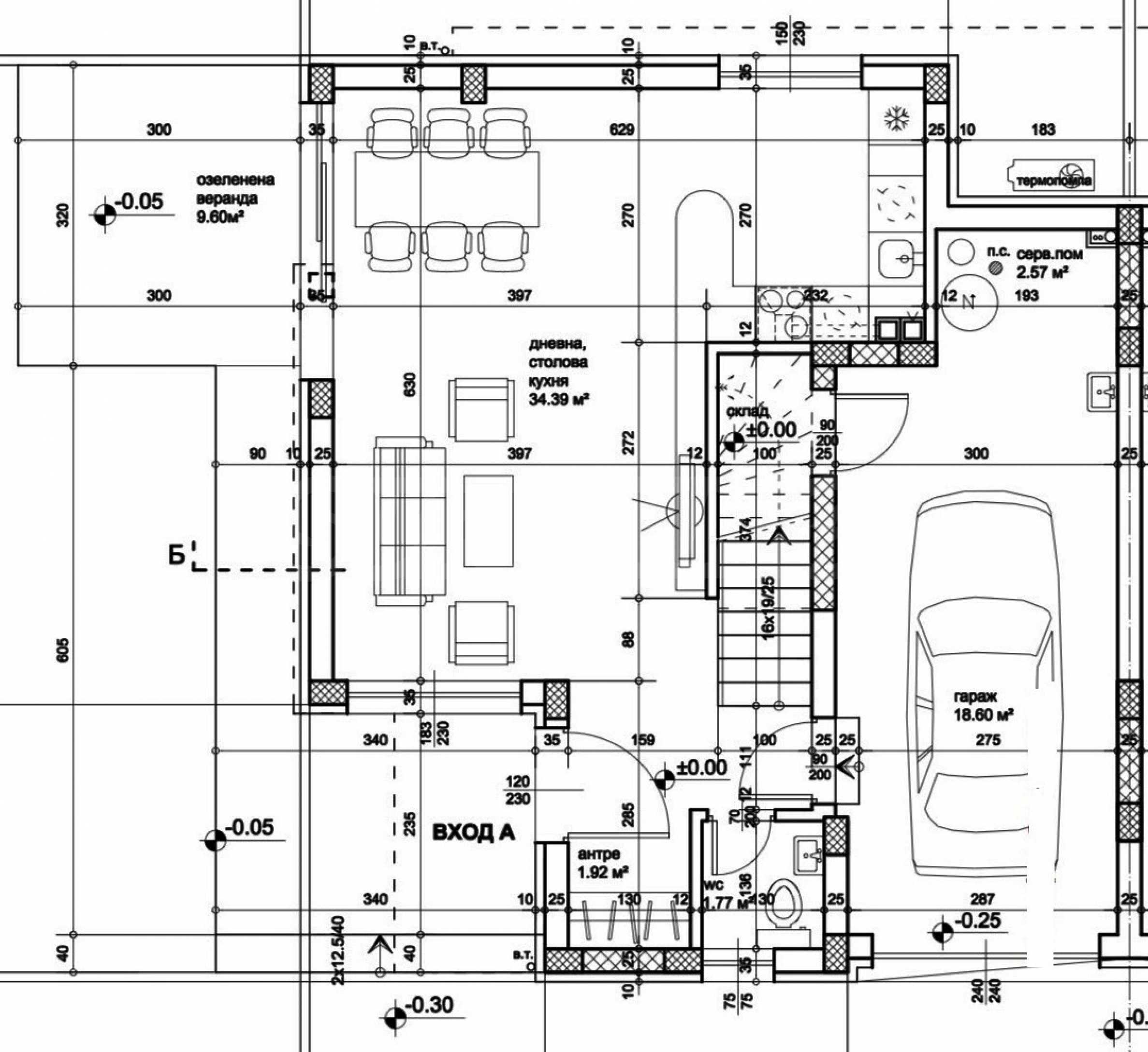 • первый этаж - просторная гостиная со столовой и кухней - 34,39 кв. м, прачечная, кладовая, веранда - 9,60 кв. м, гараж - 18,60 кв. м и парковочное место;