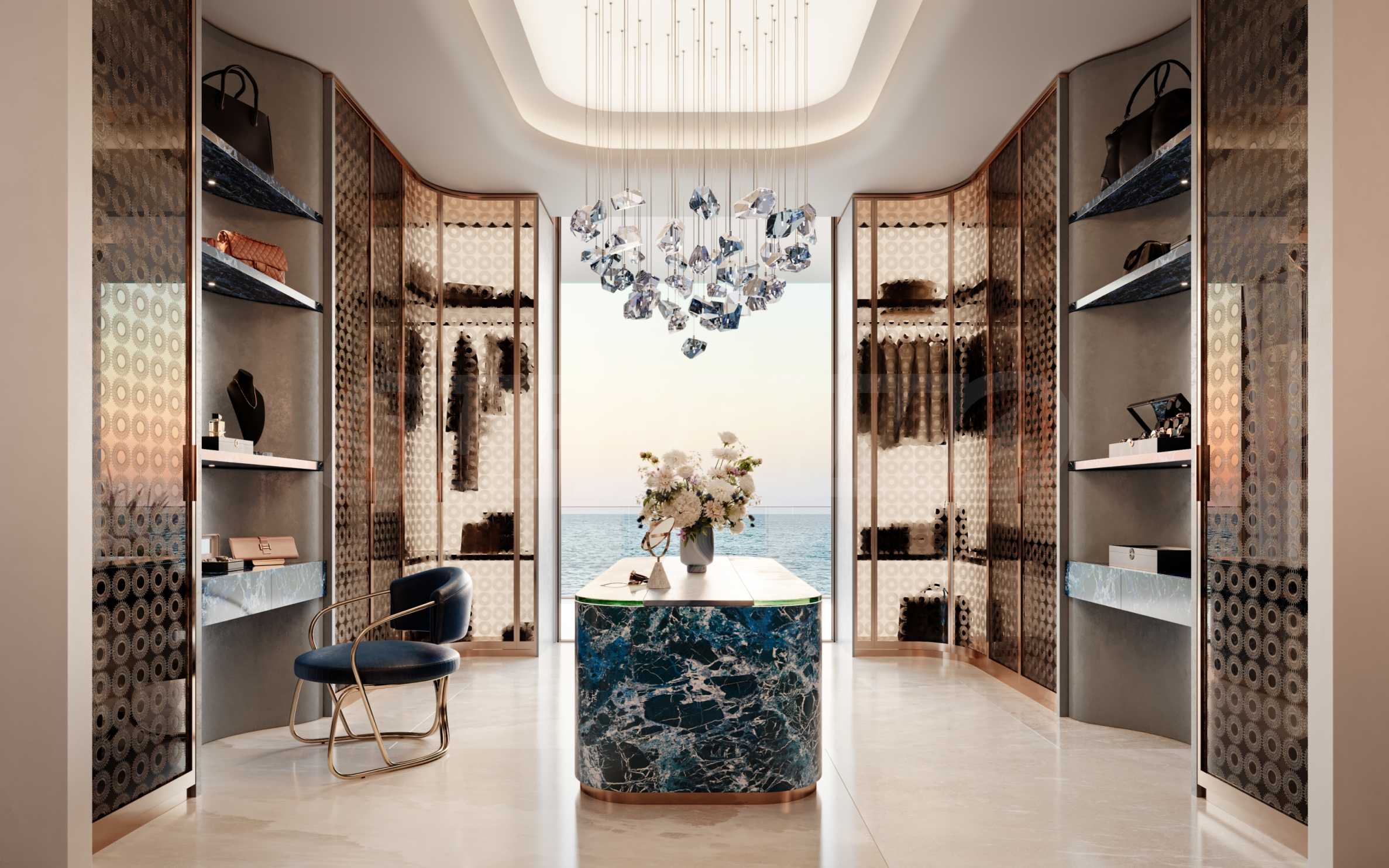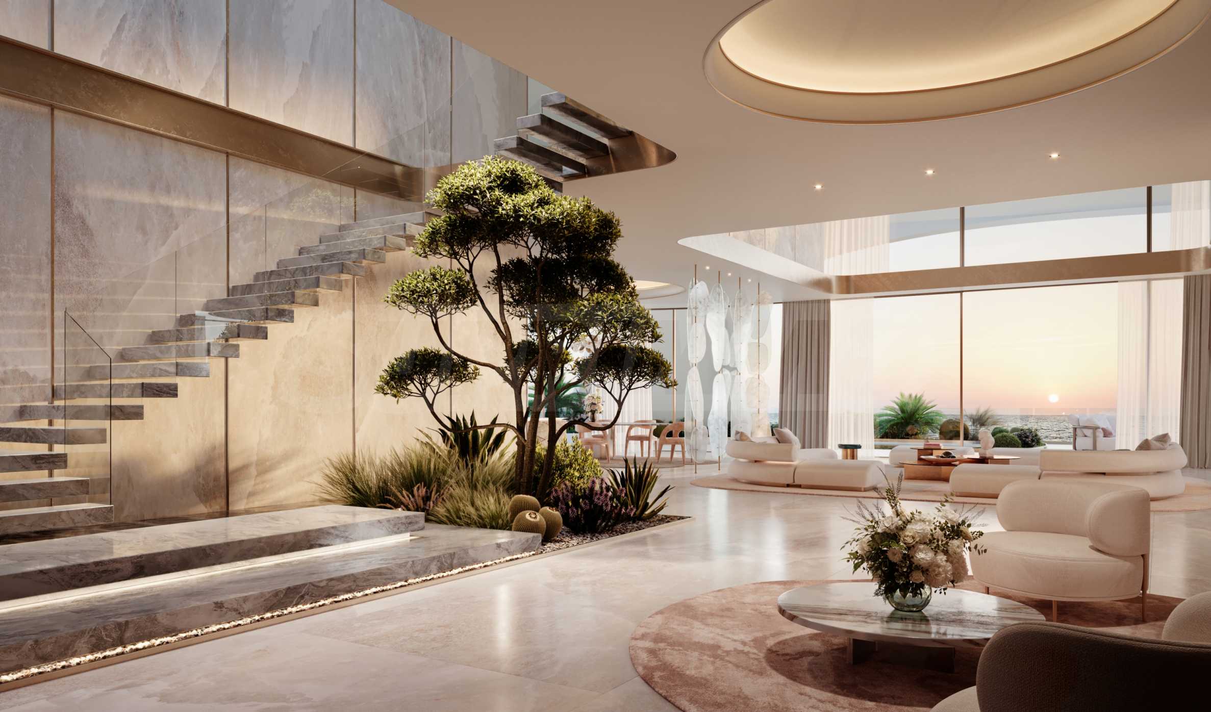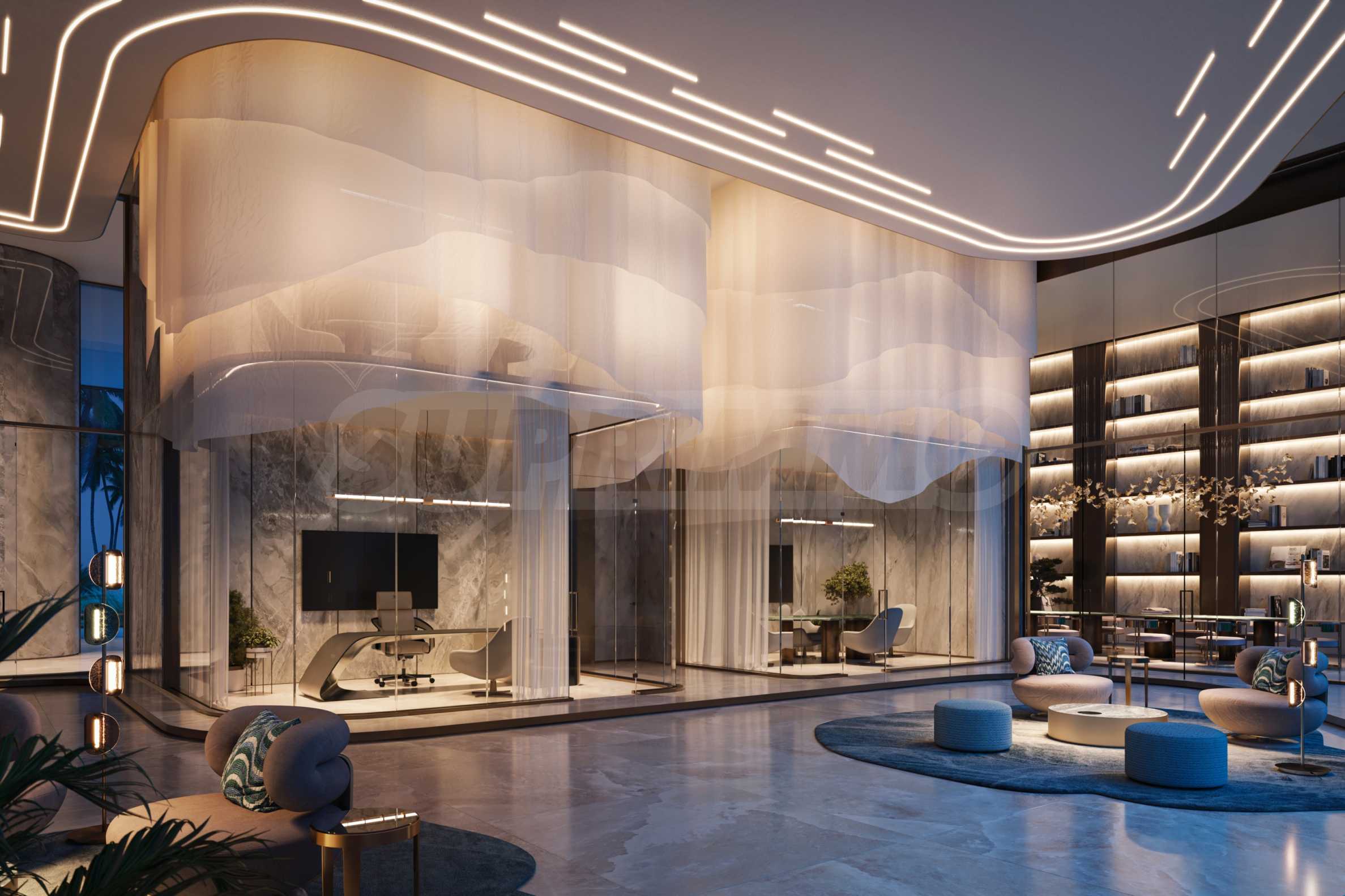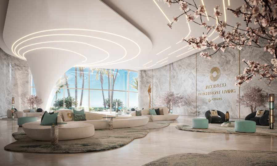 Jacob & Co. Beachfront Living встречает своих жильцов уникальным фойе, достойным ценителей и ценителей прекрасного. Благодаря двухсветным потолкам пространство кажется светлым и воздушным, а белый цвет в сочетании со светлыми коврами, дизайнерской мягкой меблировкую и зеленью придаёт помещению стиль и душу. Однако по-настоящему особенным атриум делают уникальные 10-метровые работающие часы, разработанные Jacob & Co. Расположенные на потолке, они впечатляют при входе и навсегда остаются в сердцах тех, кто их видит.