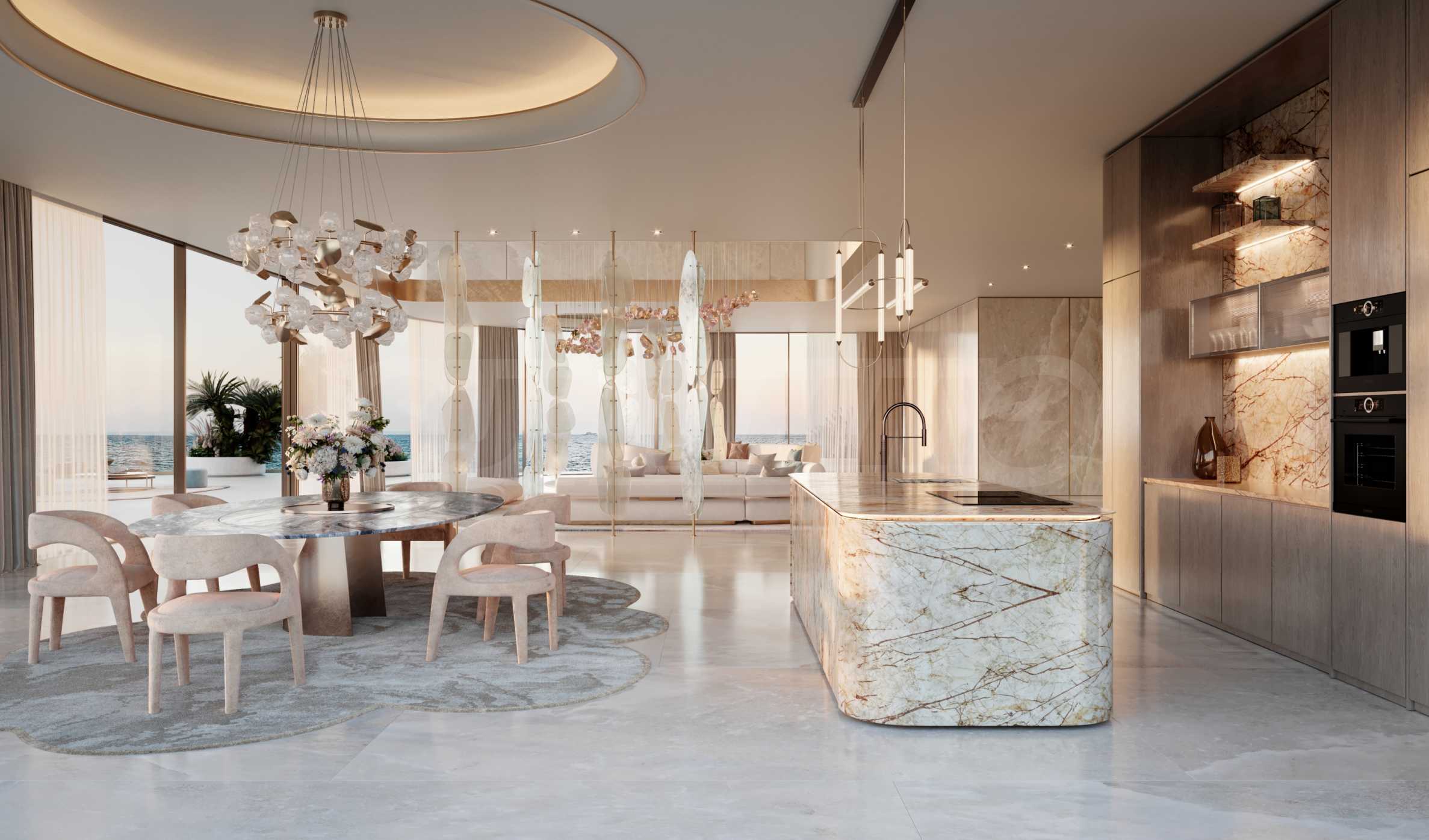 И квартиры, и дома спроектированы с высокими потолками и панорамными окнами от пола до потолка с раздвижными механизмами, которые усиливают ощущение простора и света. Они создают плавный переход между интерьером и экстерьером, превращая два мира в единое пространство, где можно ощутить морской бриз и тепло солнечных лучей.